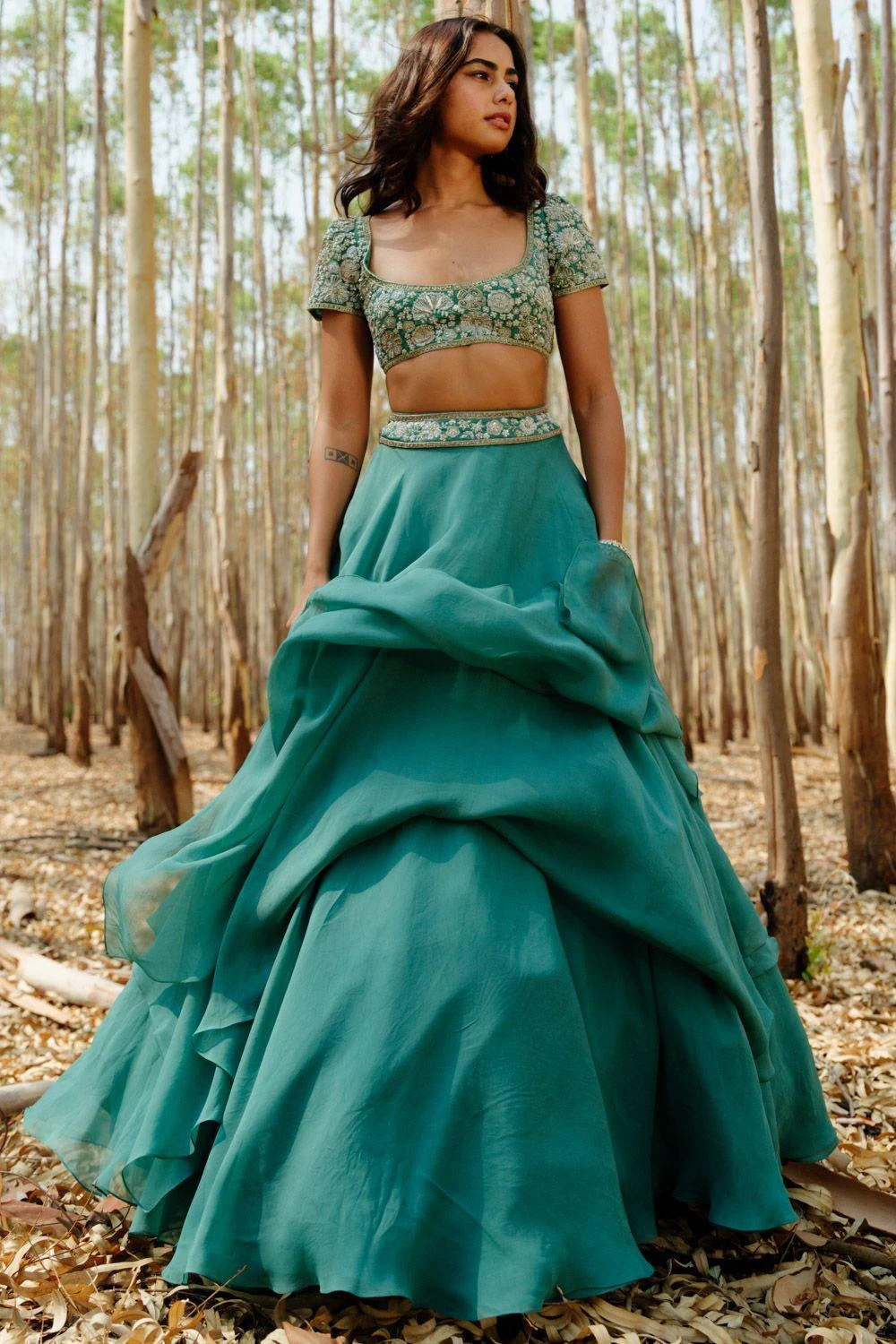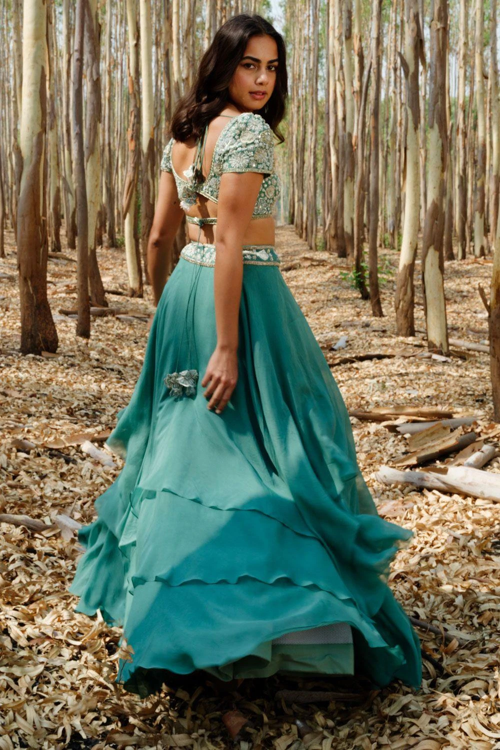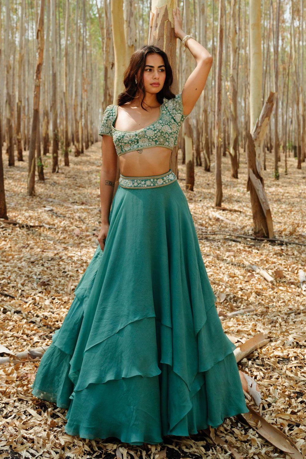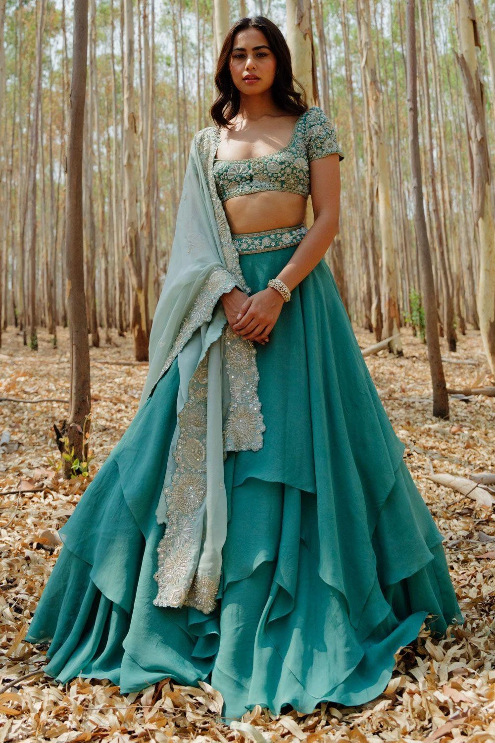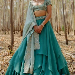 This lehenga set will see you through all kinds of fesivities. It features a layered skirt paired with floral embroidered blouse and dupatta. This set features hand embroidery finished with zari, sadi, mirrors and sequin work.