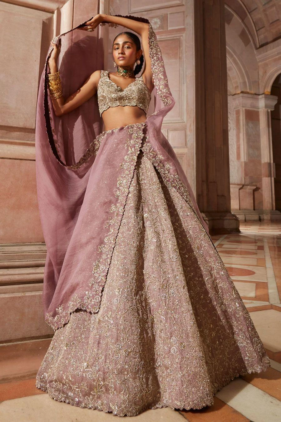 Add this ethereal ensemble to your wedding trousseau for an elegant engagement look. This set comes with a zardosi embroidered twine lehenga paired with a heavily embroidered sleeveless neck blouse & a dupatta.