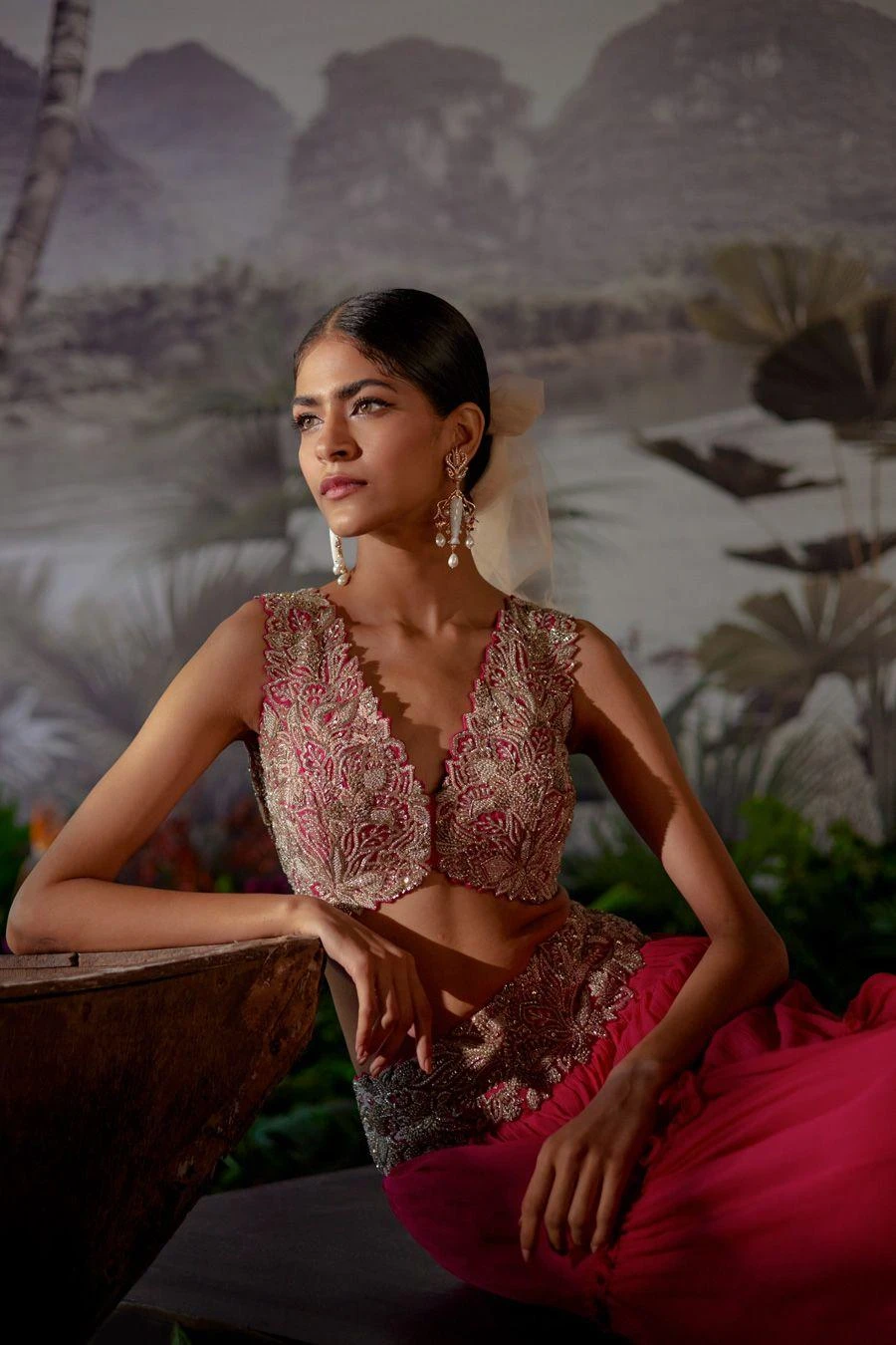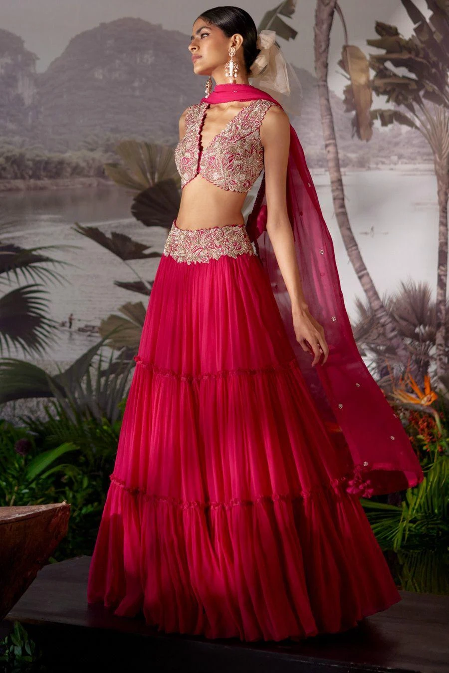 This lehenga set will see you through all kinds of celebrations this wedding season. Crafted in silk & chiffon, this set features an embellished & tiered skirt, an embellished blouse & dupatta. Add a pair of dangler earrings to complete the look