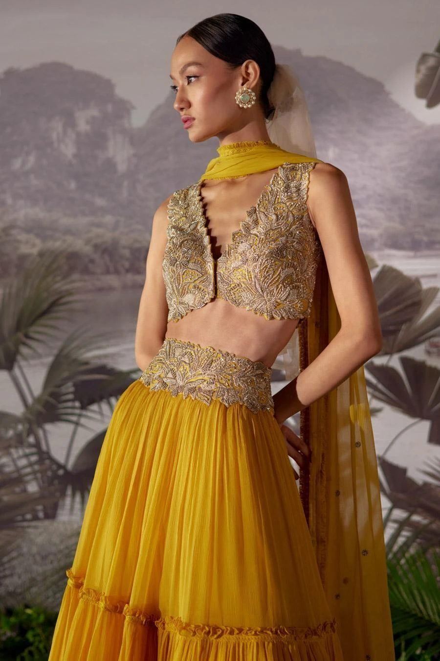 This lehenga set will see you through all kinds of celebrations this wedding season. Crafted in silk & chiffon, this set features an embellished & tiered skirt, an embellished blouse & dupatta. Add a pair of dangler earrings to complete the look