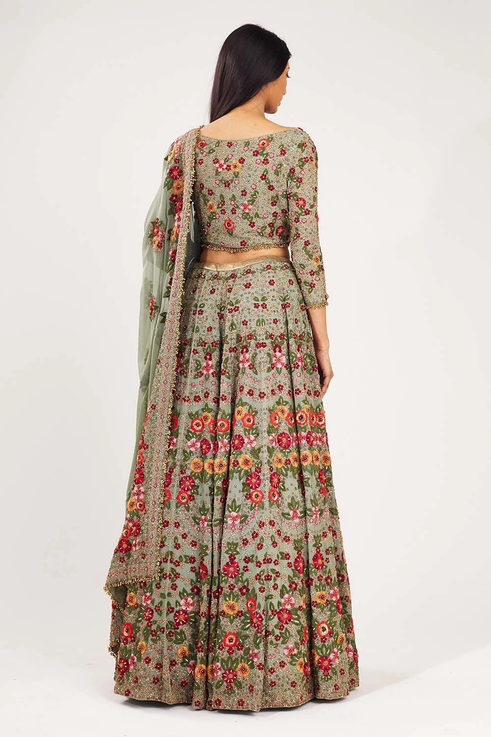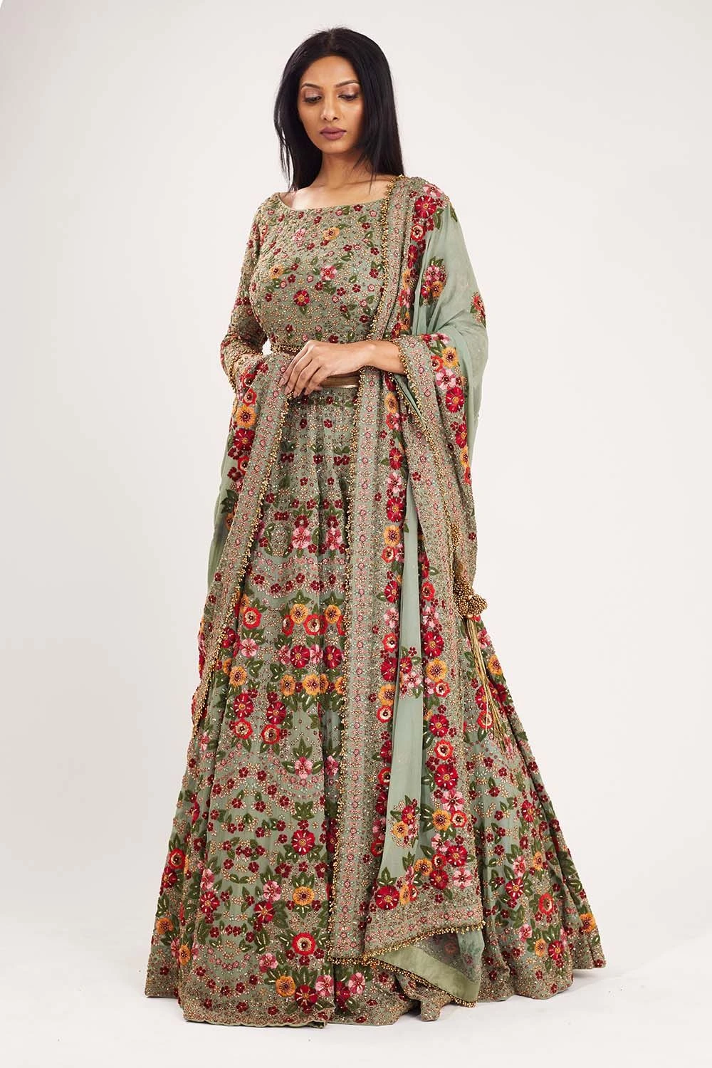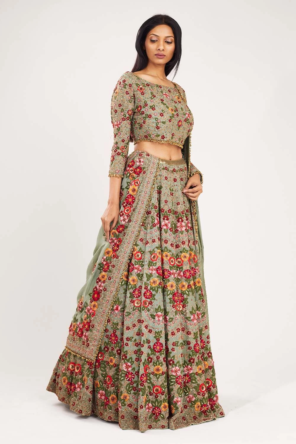 This dreamy lehenga set is adorned with intricate floral embroidery on sea green chiffon. The delicate threadwork & flowy silhouette makes this a great choice for summer weddings.