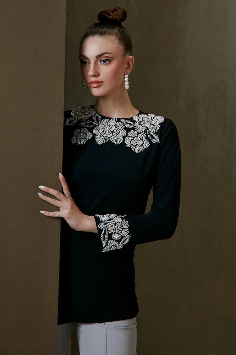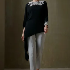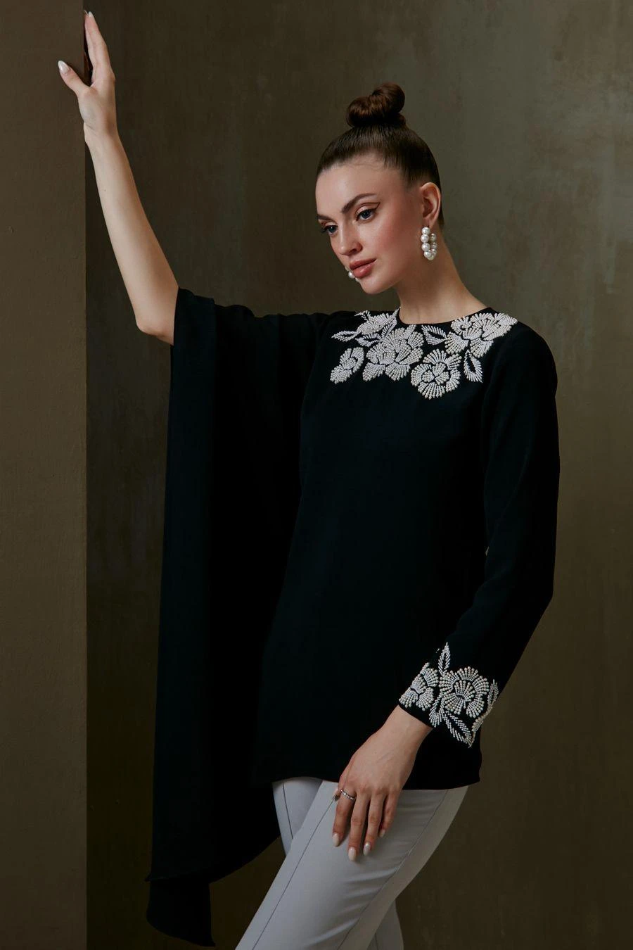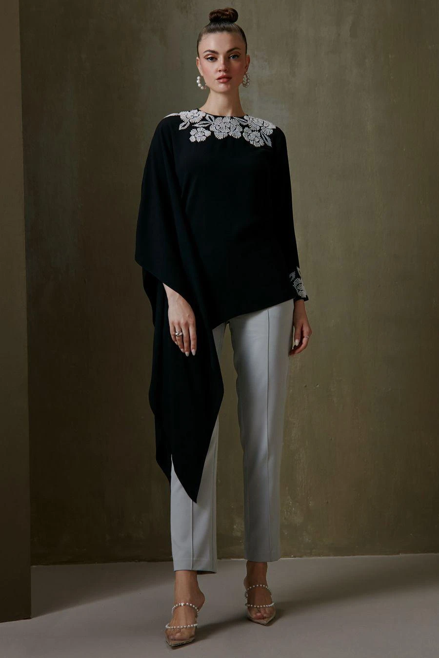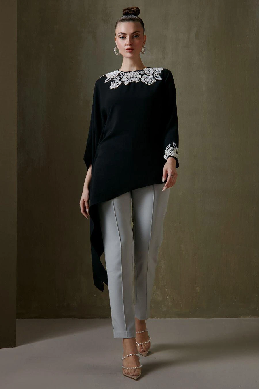 From your work desk to the brunch table & from lounging at home to catching flights, you can always count on this top. Crafted in crepe, this asymmetric top features floral hand-embellished details around the neck.
