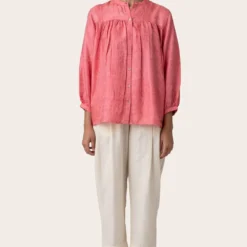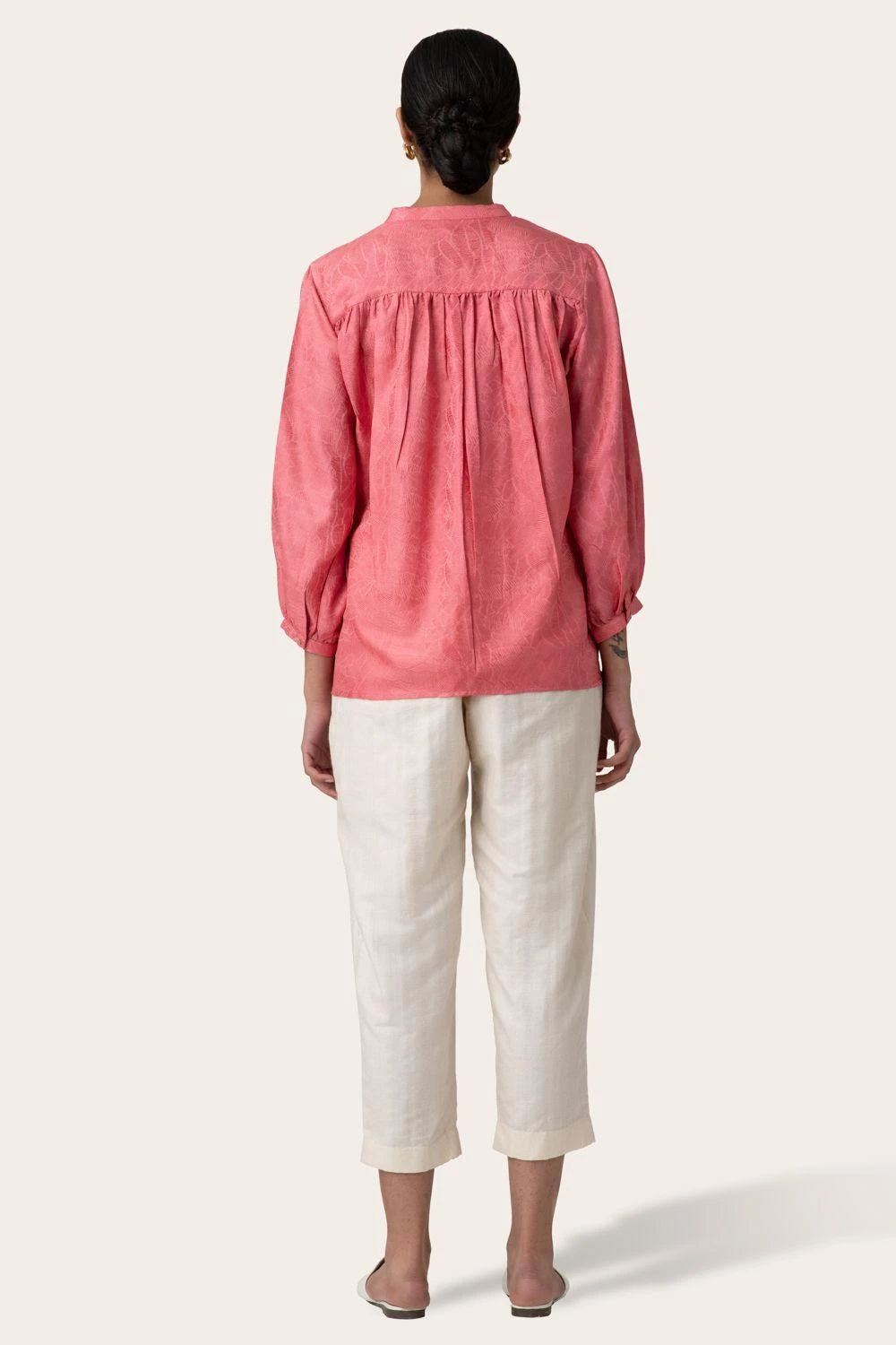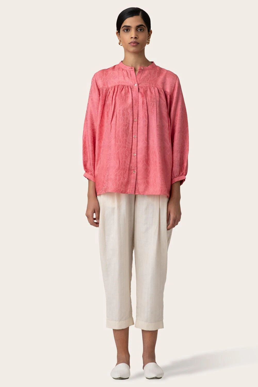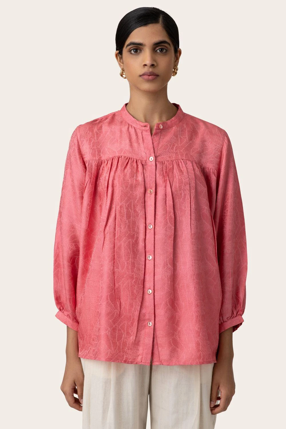 Cool down your balmy days in this airy pink mandarin collar shirt. It is cut in a relaxed fit from lightweight tanchoi silk and has relaxed sleeves which are gathered and have a slim cuff.