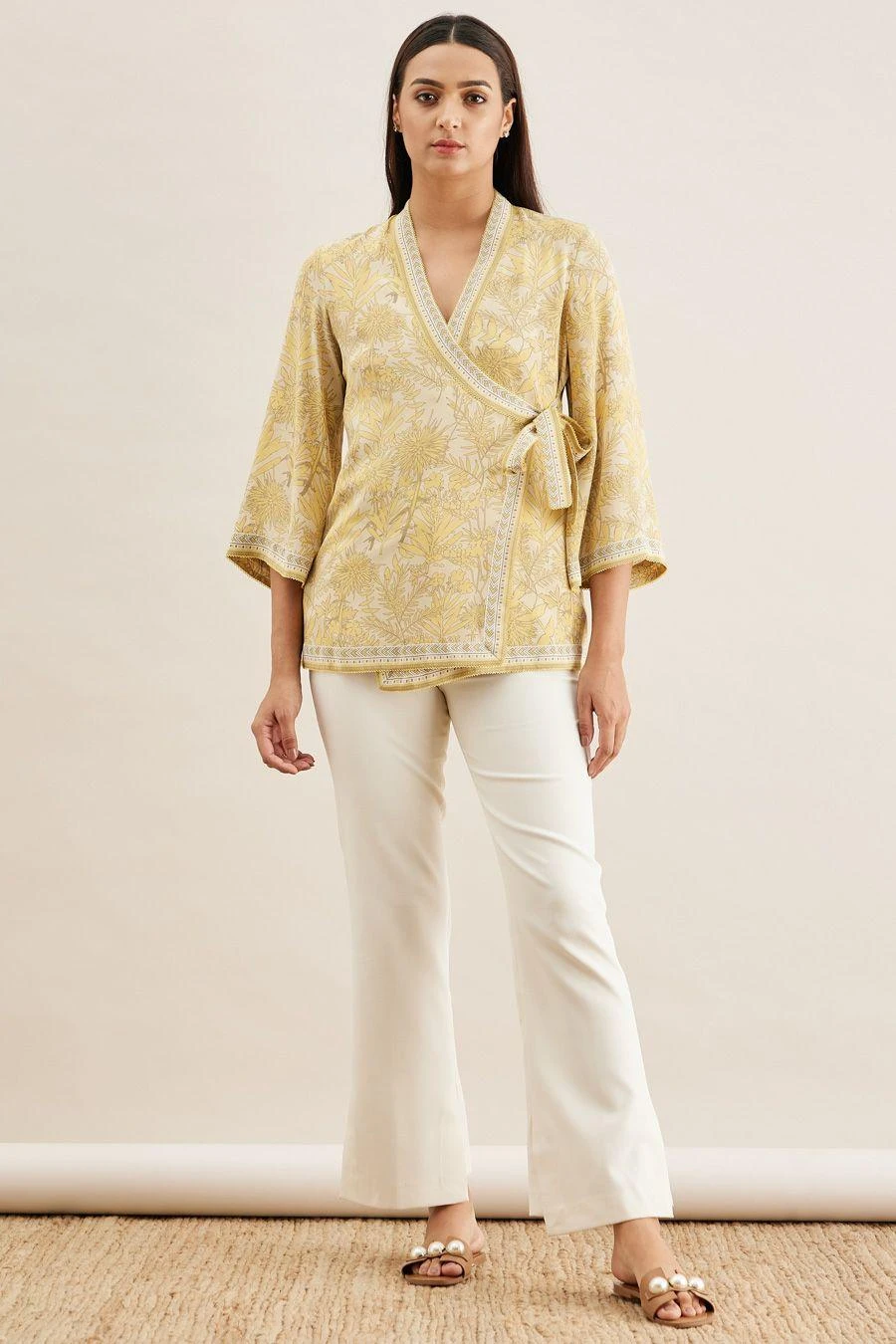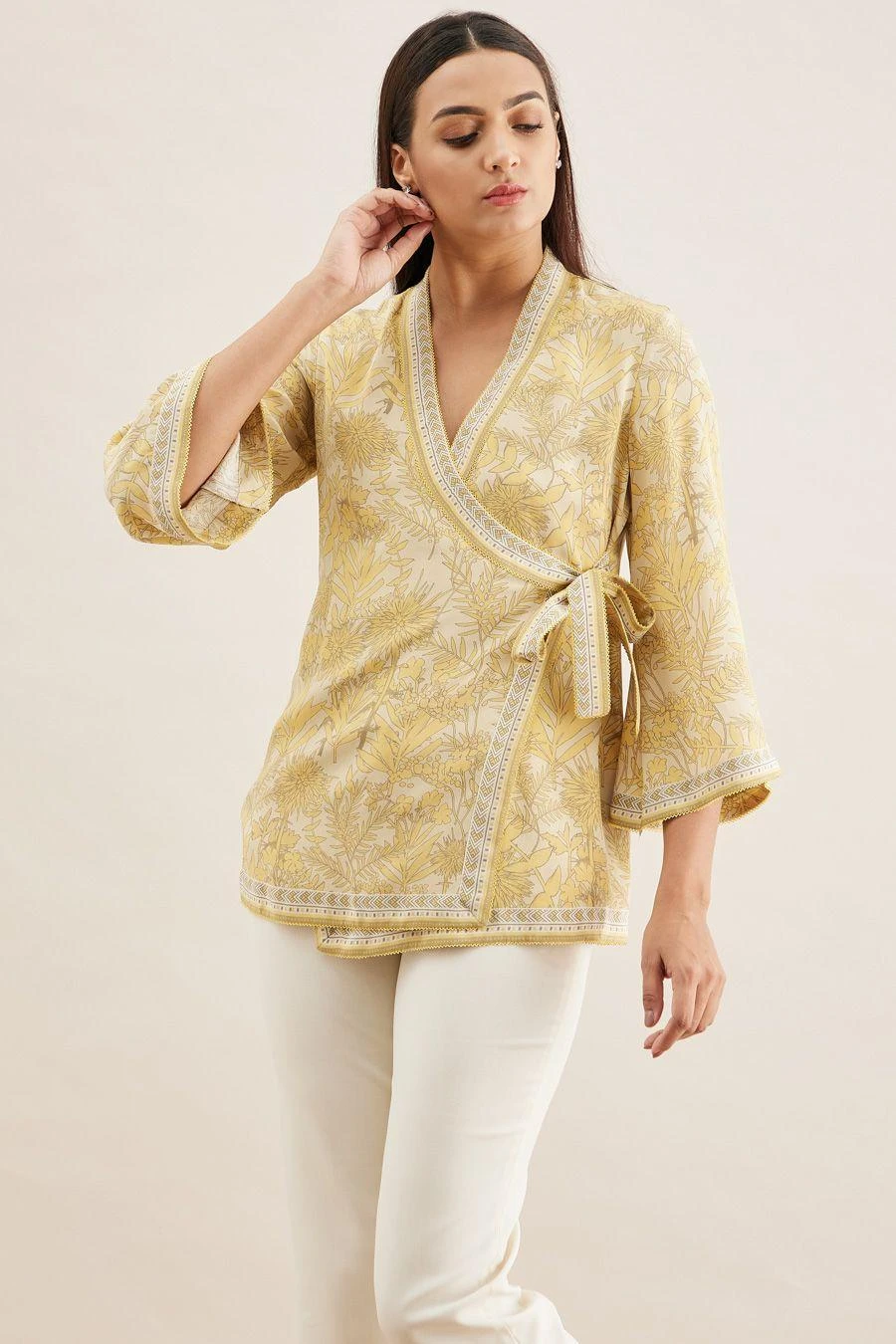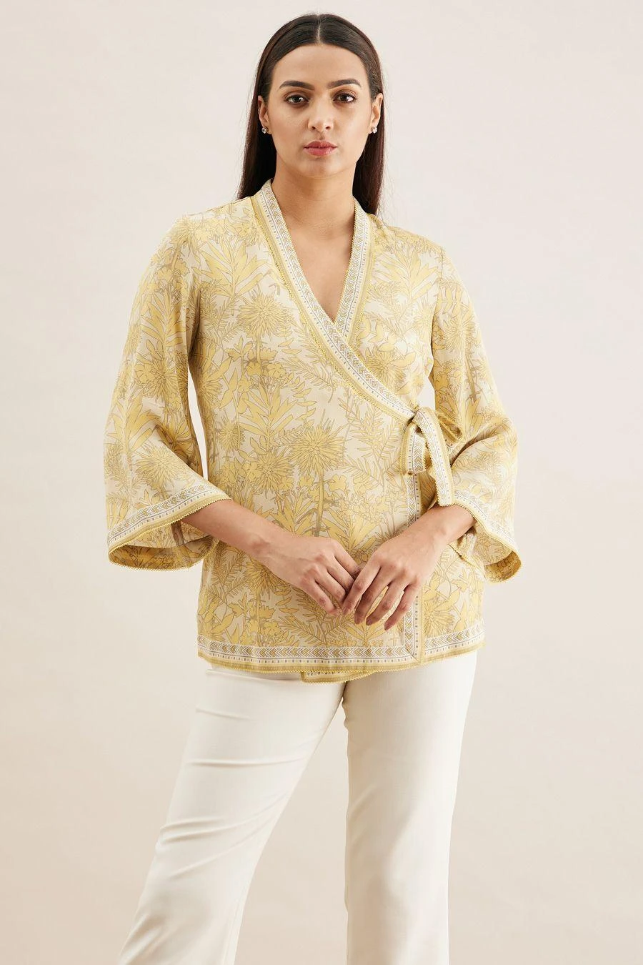 From your work desk to the brunch table & from lounging at home to catching flights, you can always count on this wrap top. Crafted in crepe, this top features a shikargah print & bell sleeves. Style it with white flared pants to complete the look.
