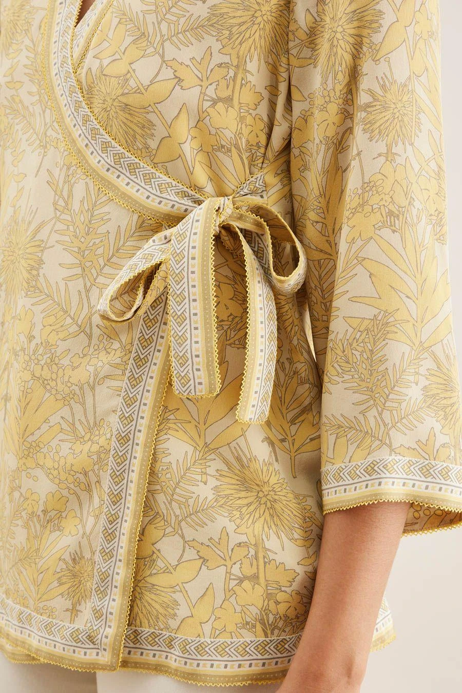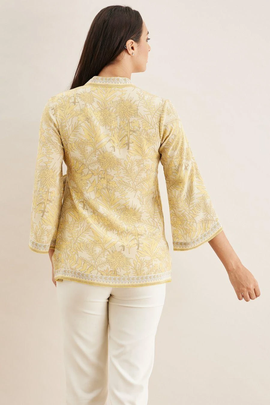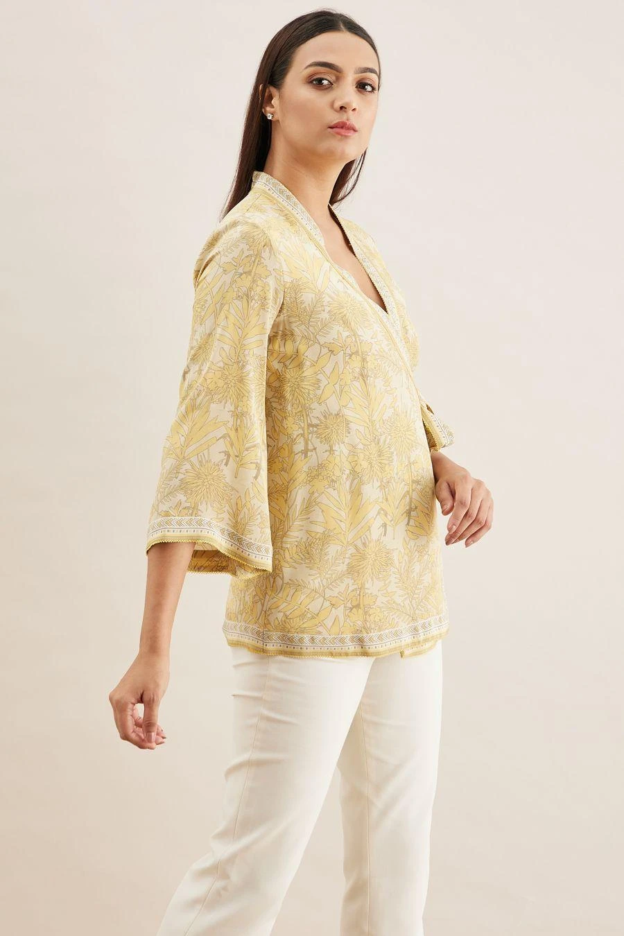 From your work desk to the brunch table & from lounging at home to catching flights, you can always count on this wrap top. Crafted in crepe, this top features a shikargah print & bell sleeves. Style it with white flared pants to complete the look.