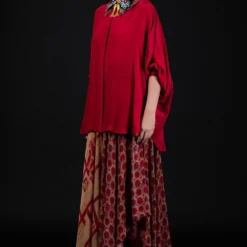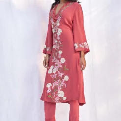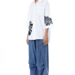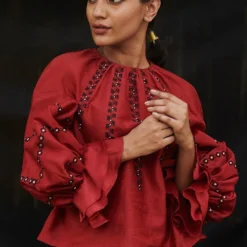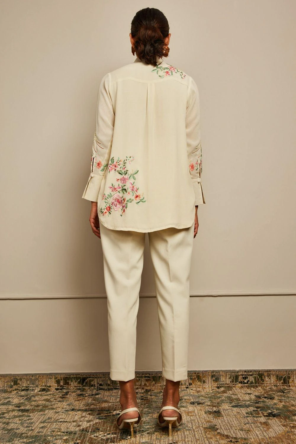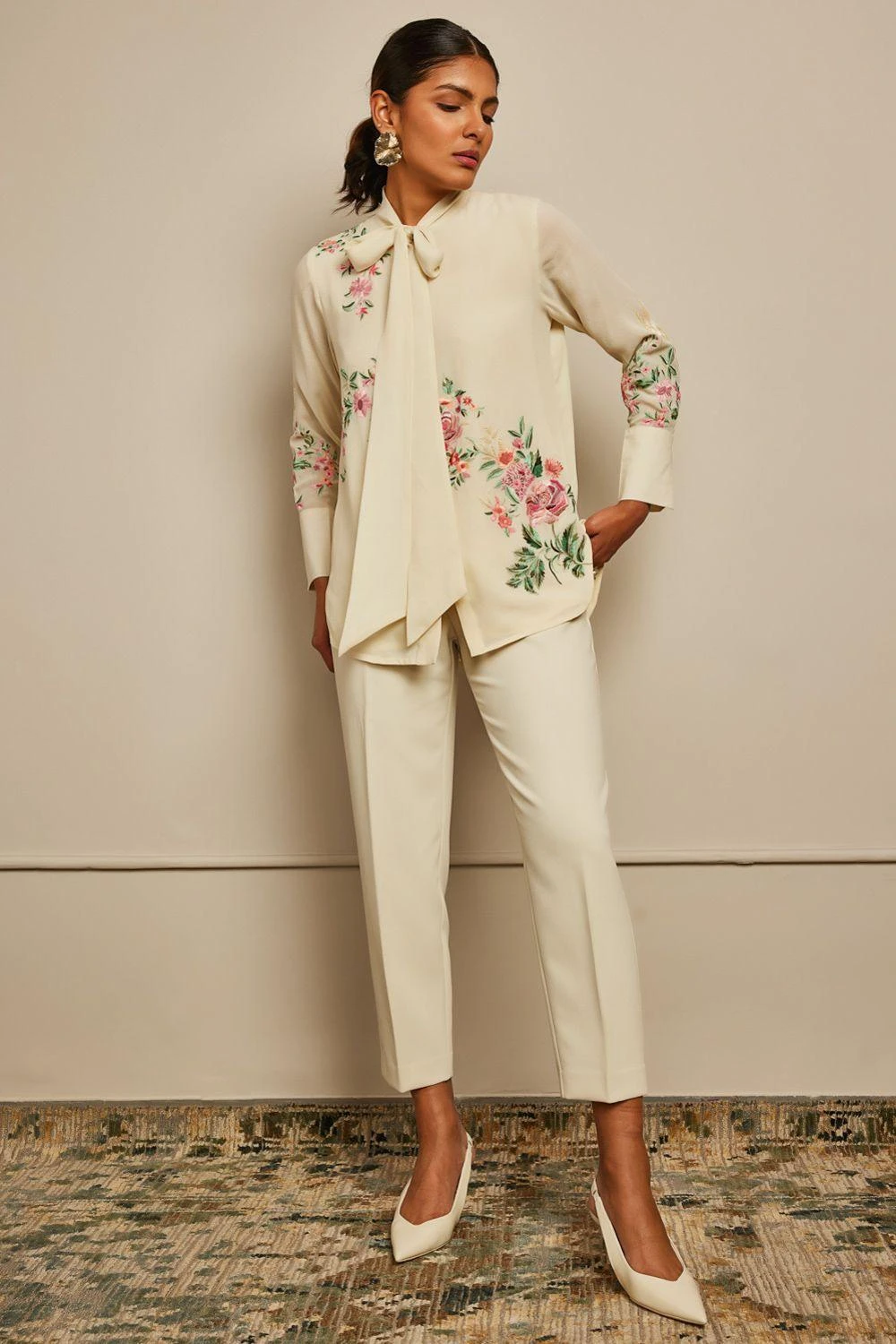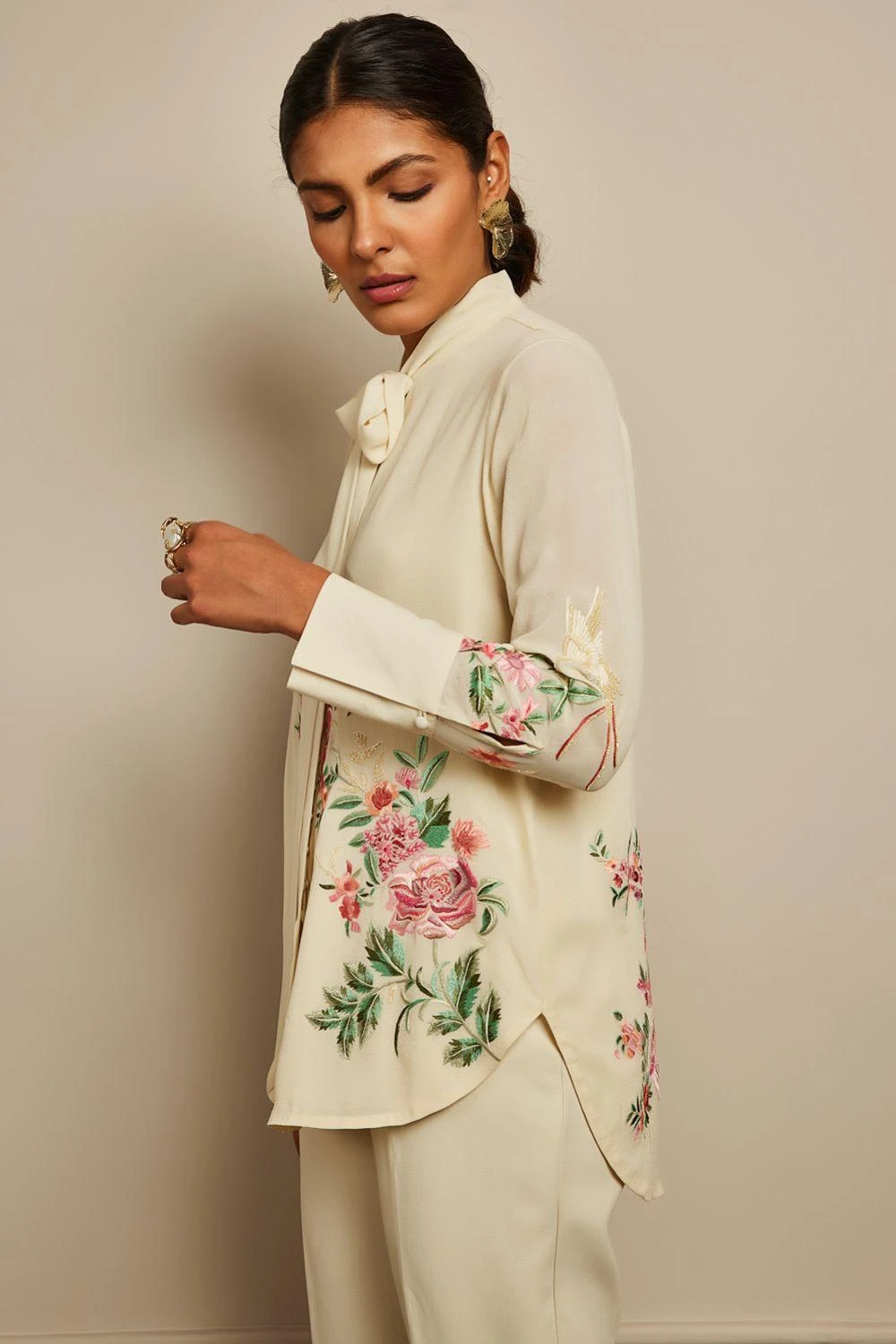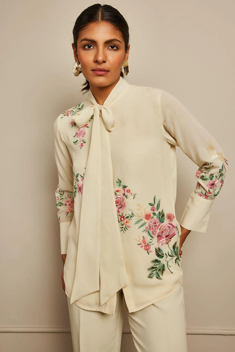 The luxurious silk crepe fabrication & Patine’s signature gara embroidery makes this shirt a great pick for a summer soiree. The cuffed sleeves & bow tie only adds to its elegance. You can team it up with a pair of tailored cream pants.