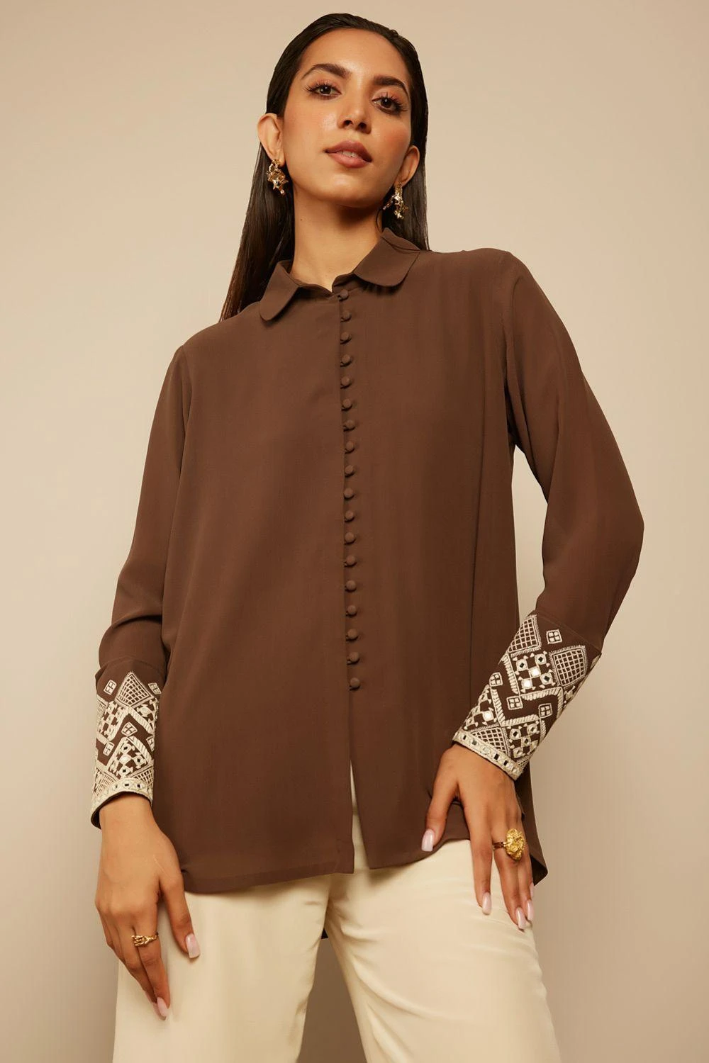 Minimalism & elegance takes the center stage with this grey shirt woven in smooth & sheen silk georgette. It is adorned with hand thread embroidery & mirror work on the cuff of the sleeves. Team it up with a pair of tailored ivory pants.