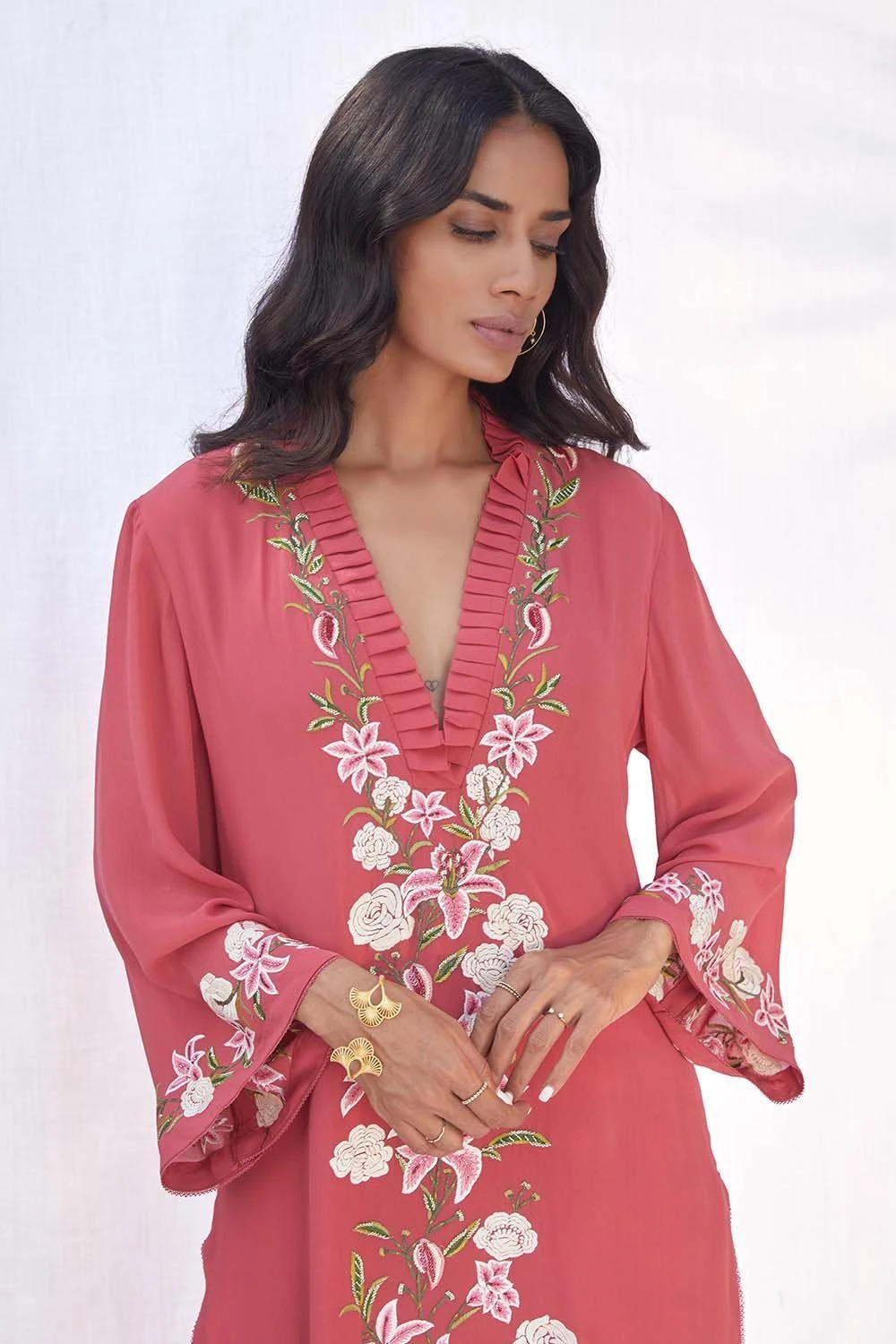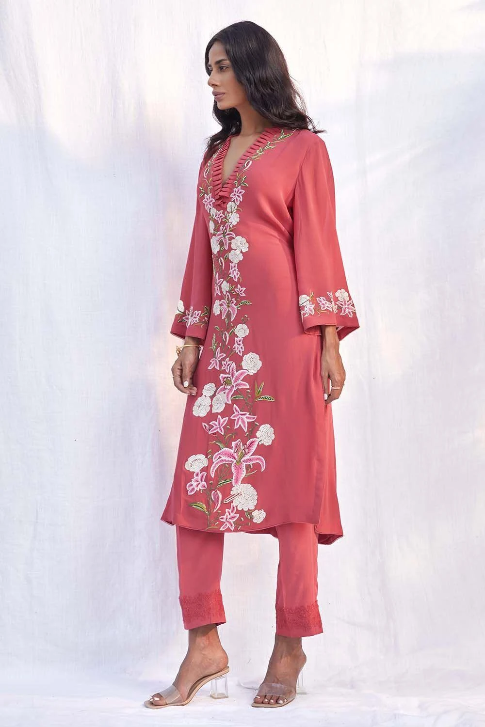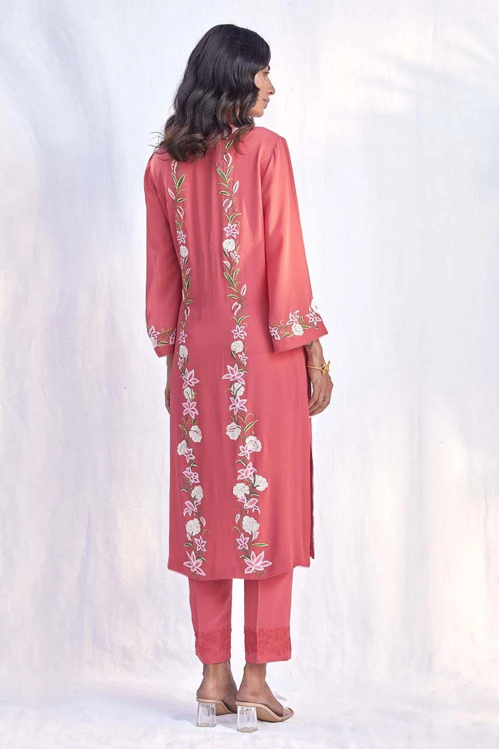 This striking pink long kurta set in silk georgette is adorned with floral gara embroidery. The kurta is paired with silk crepe straight pants with lace detailing. This stylish set is perfect for an intimate soiree, or an outdoor party.