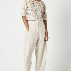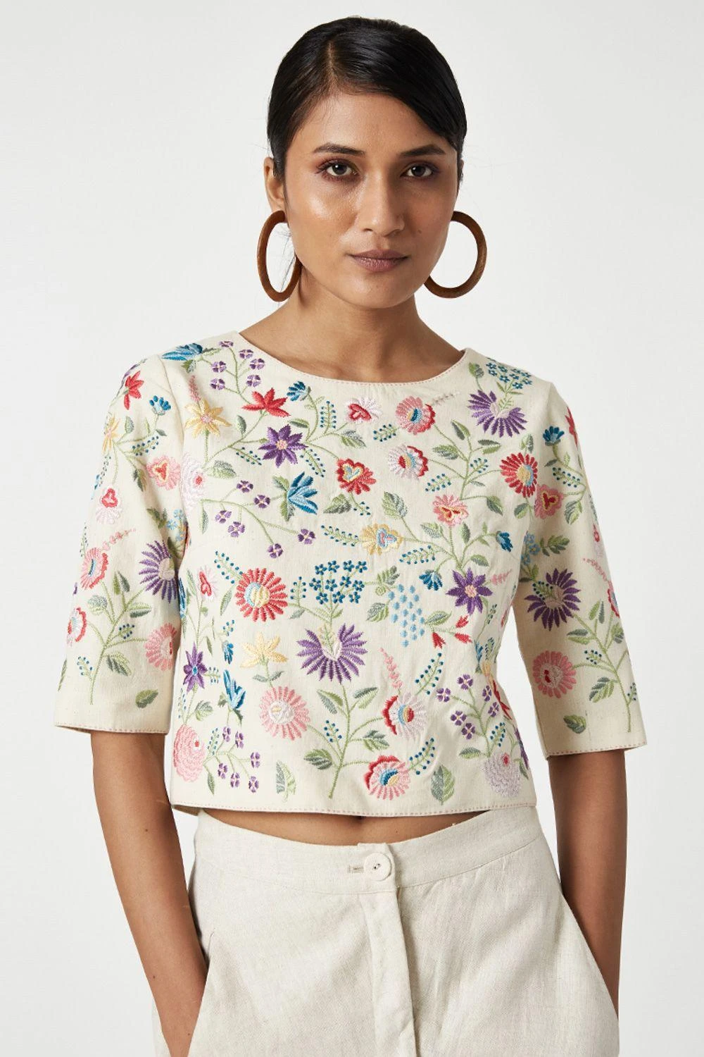 This round neck blouse with three quarter sleeves in beautifully textured Malkha cotton is resplendent with a burst of flowers embroidered in bouquet motives all over.