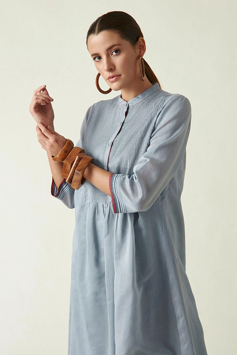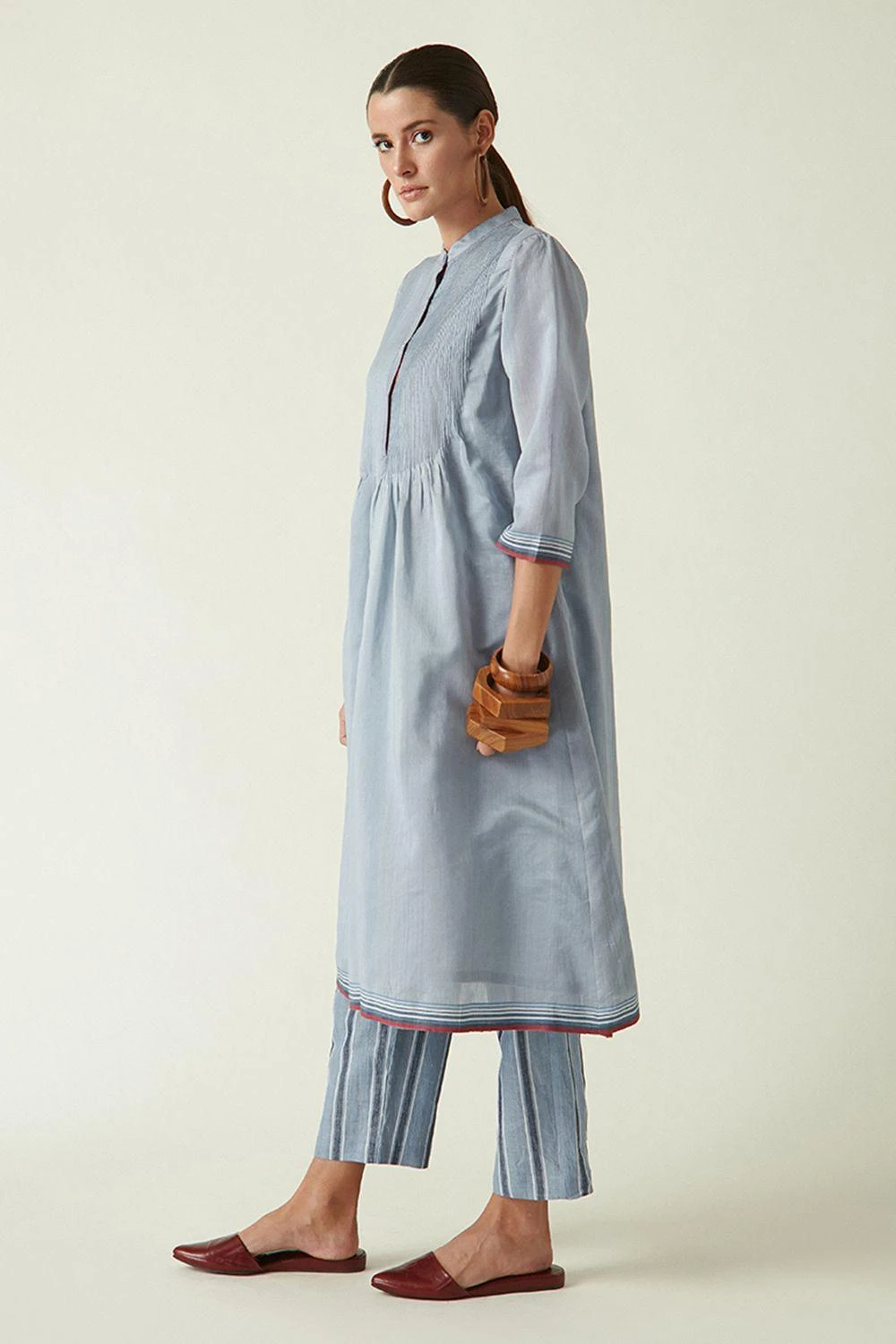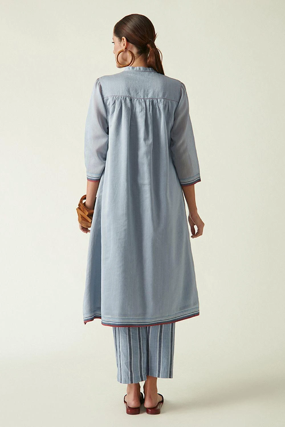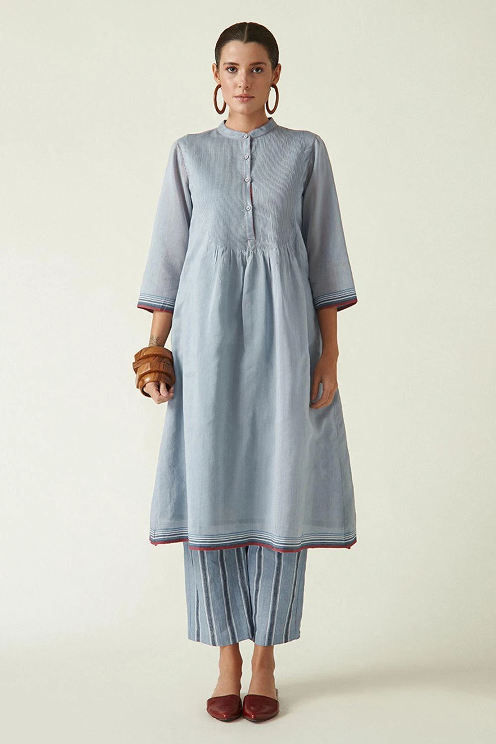 From your work desk to the brunch table & from lounging at home to catching flights, you can always count on this kurta set. It features a band collar in cotton silk with pintuck & selvedge detailing, teamed with striped linen pants.