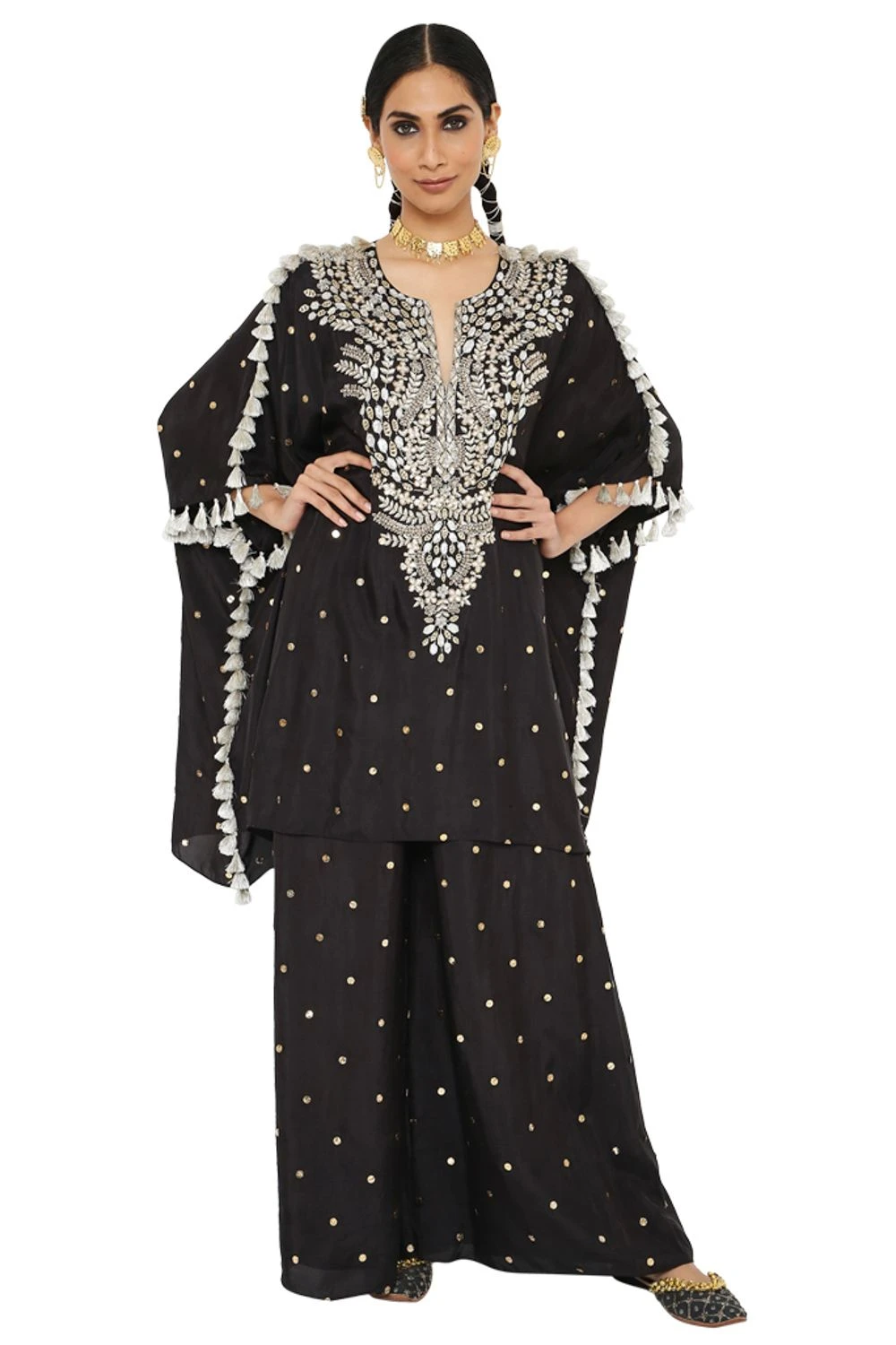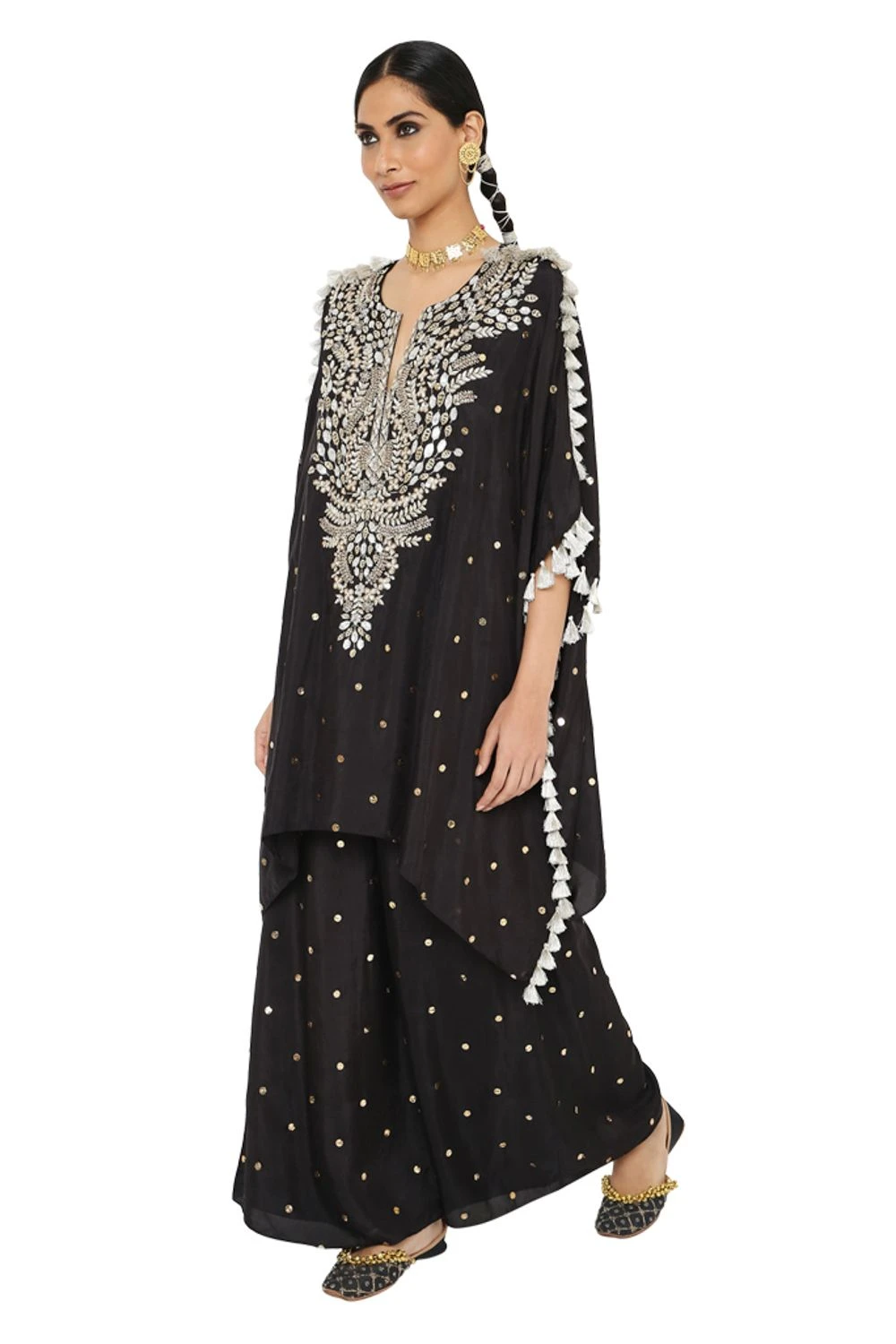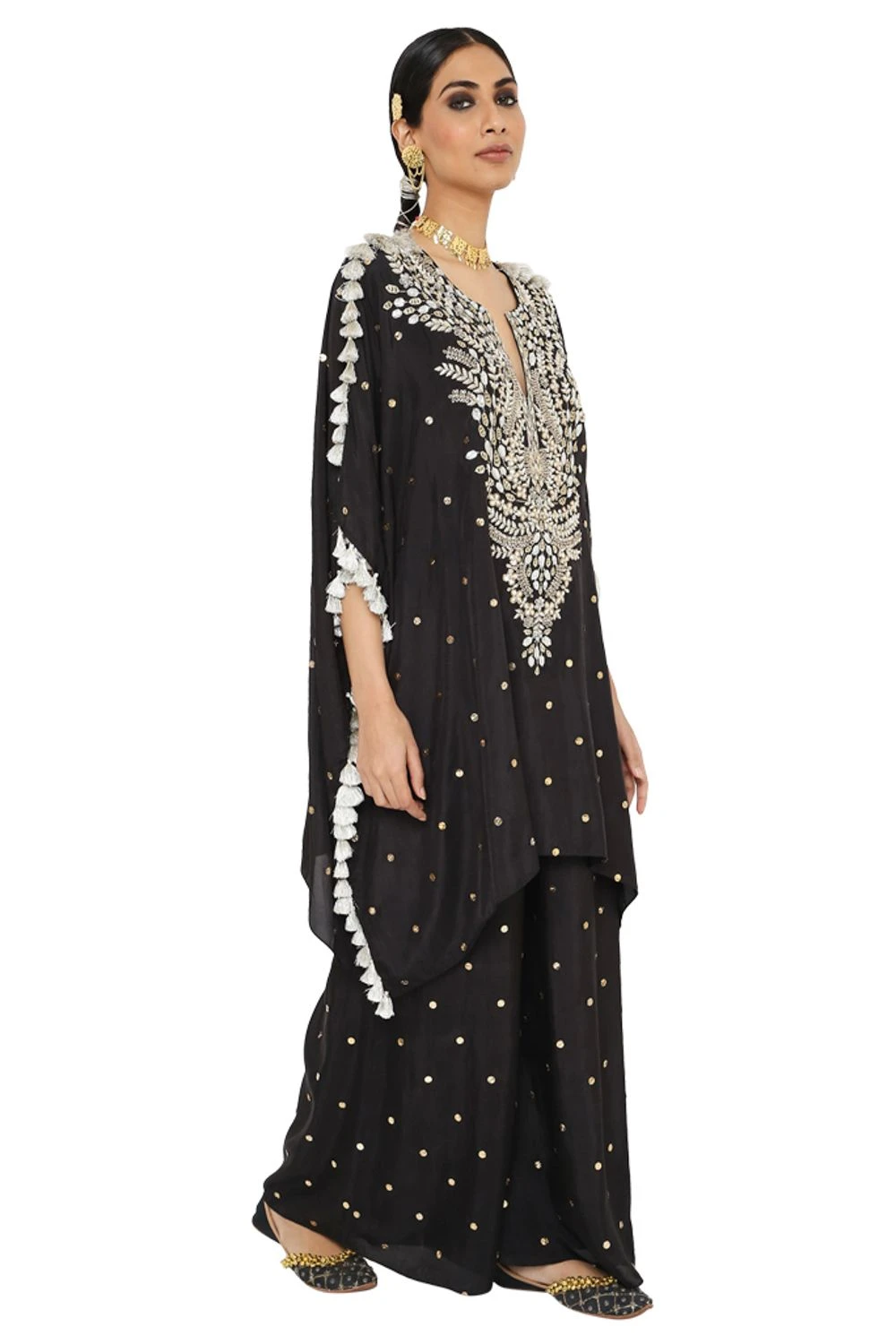 Make a style statement in this boho chic black kaftan set. It is cut in fine mukaish abutai silk and accentuated with exquisite embroidery details & tassels details. It can be styled with a pair of danglers.