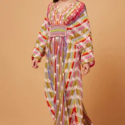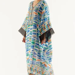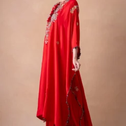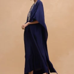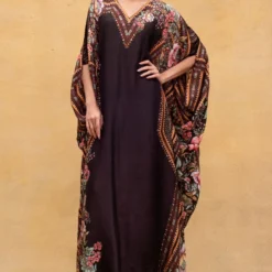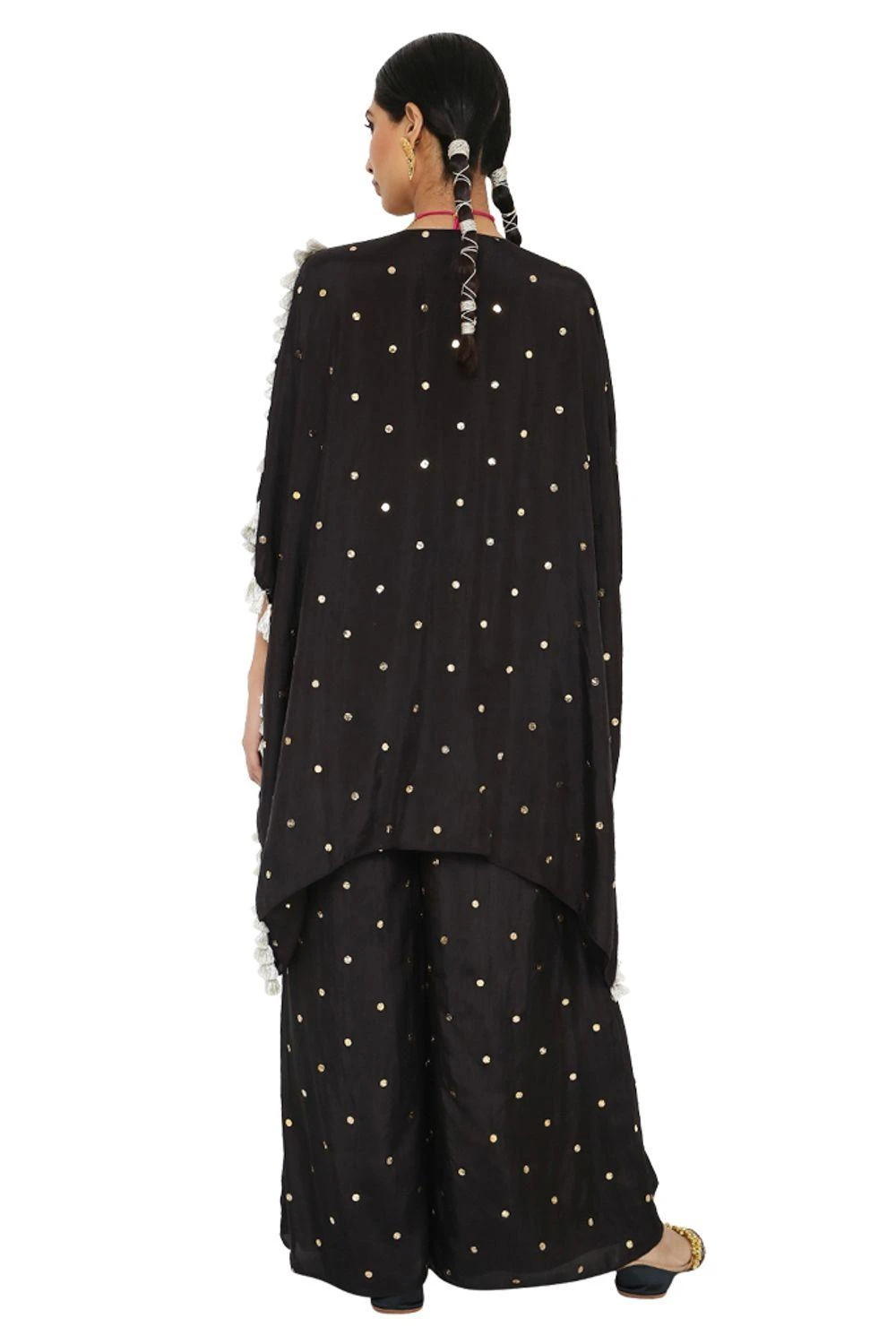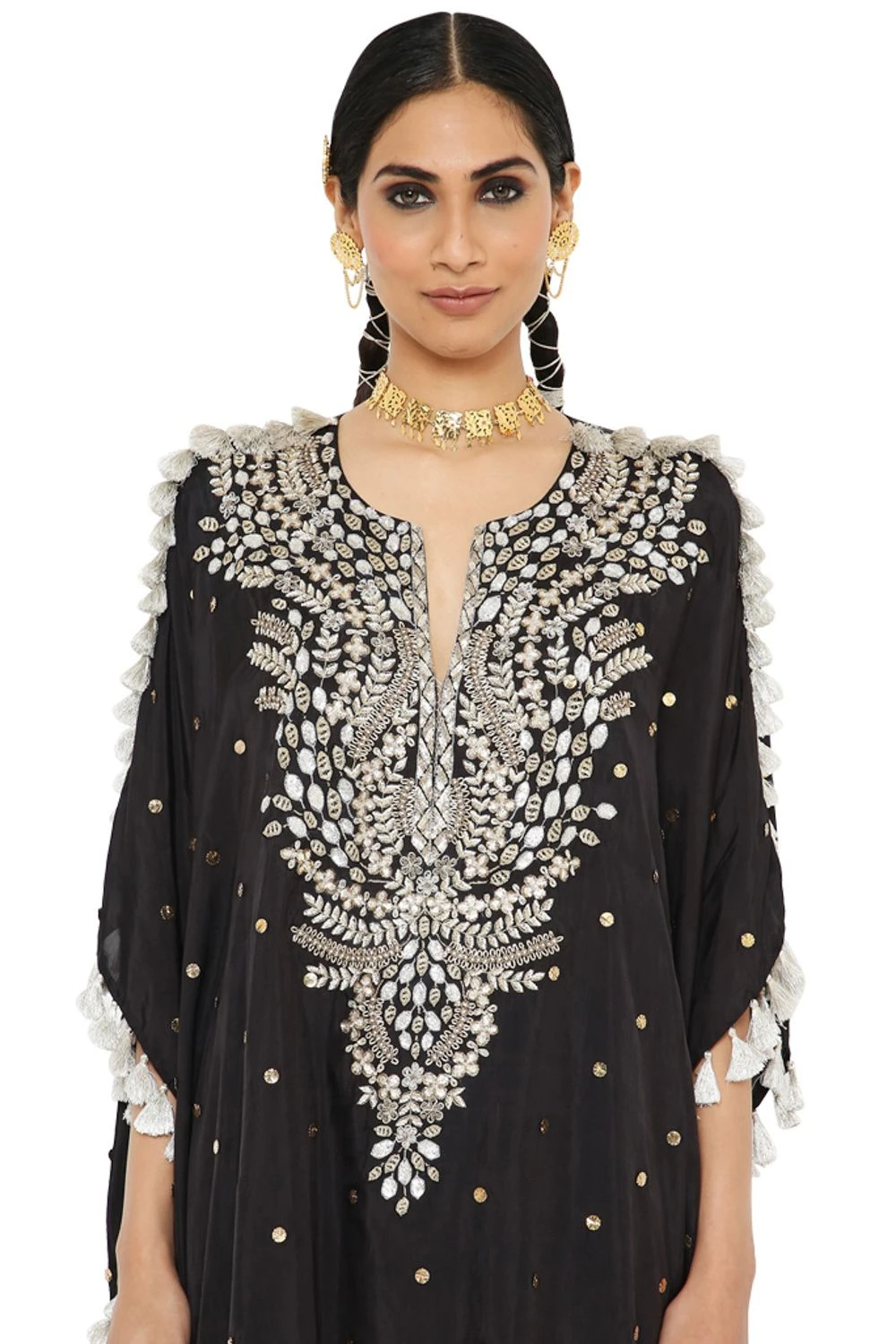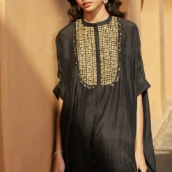 Make a style statement in this boho chic black kaftan set. It is cut in fine mukaish abutai silk and accentuated with exquisite embroidery details & tassels details. It can be styled with a pair of danglers.