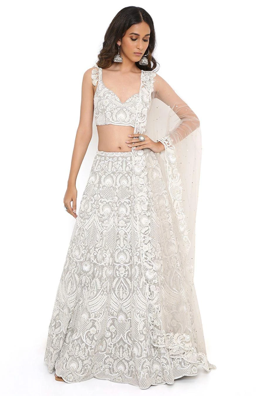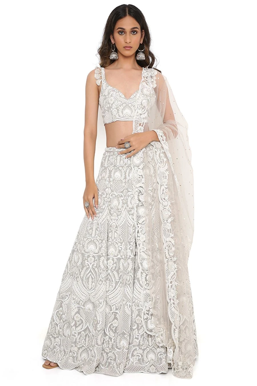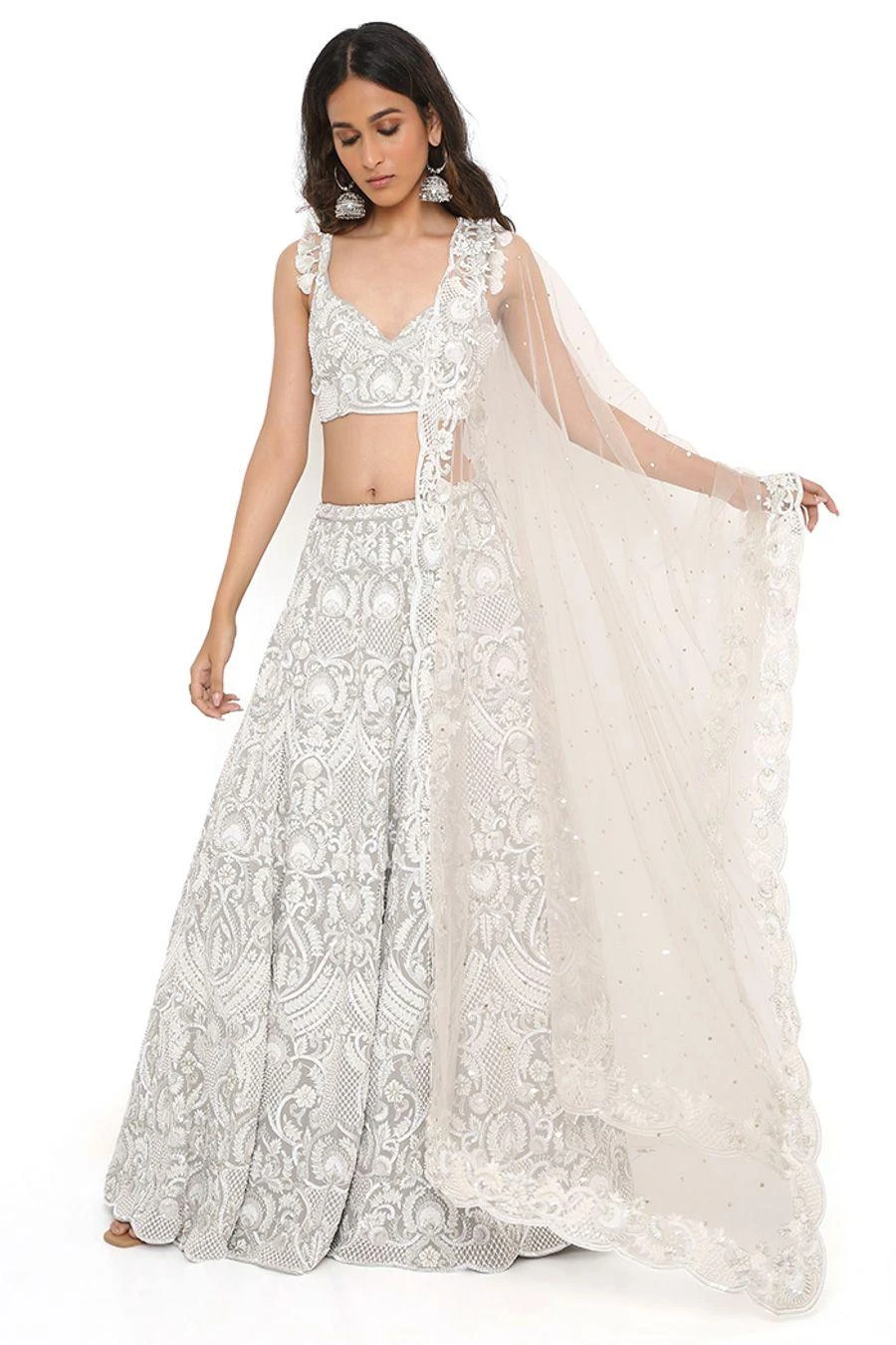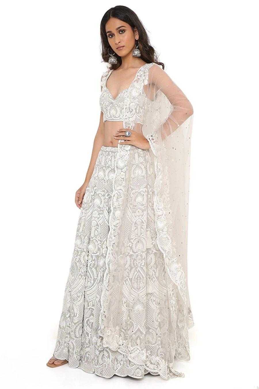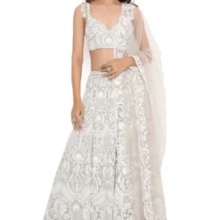 This lehenga set will see you through all kinds of festivities this wedding season. Crafted in georgette, this set features an embroidered choli and lehenga with a net mukaish dupatta. Add a pair of statement earrings to complete the look.