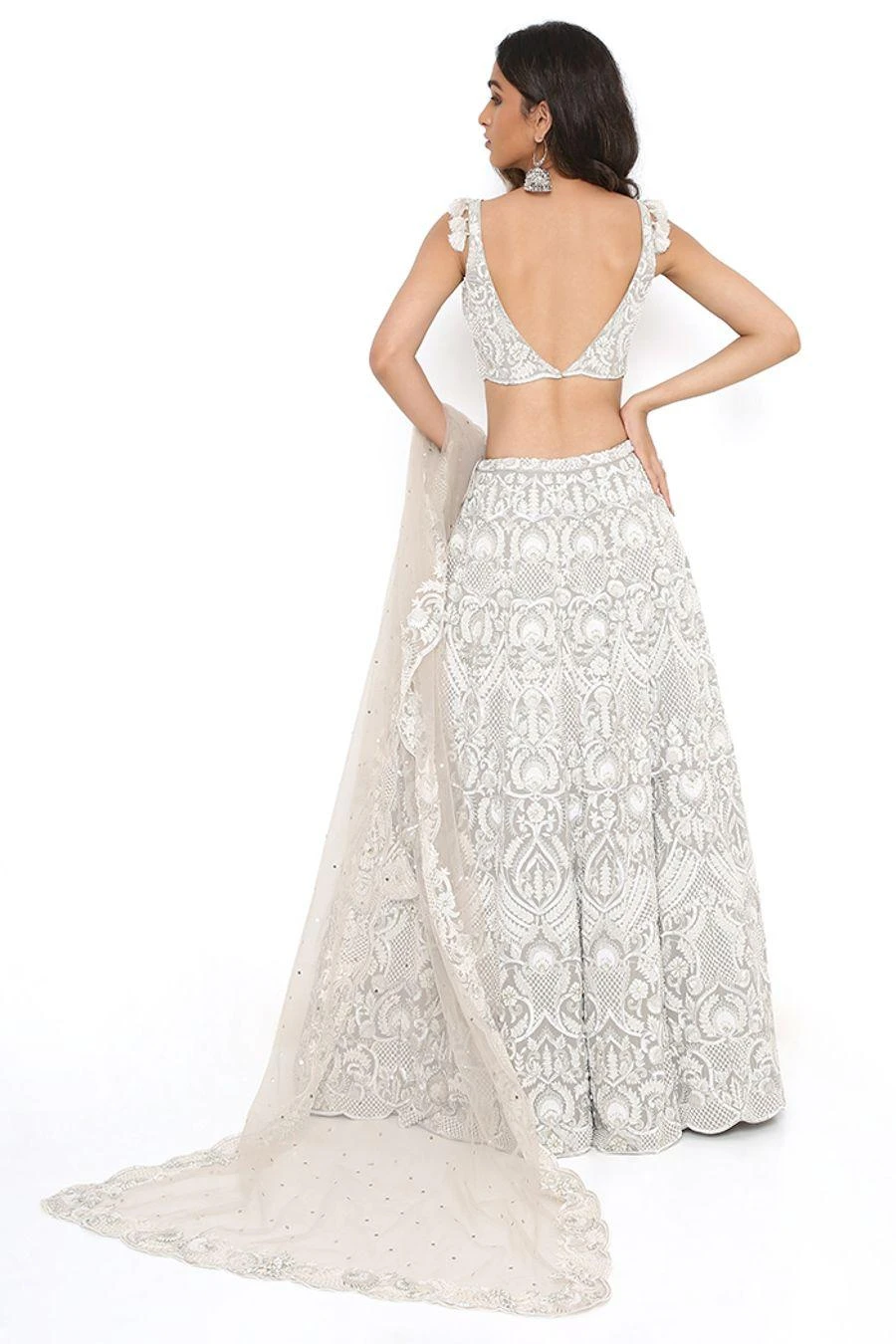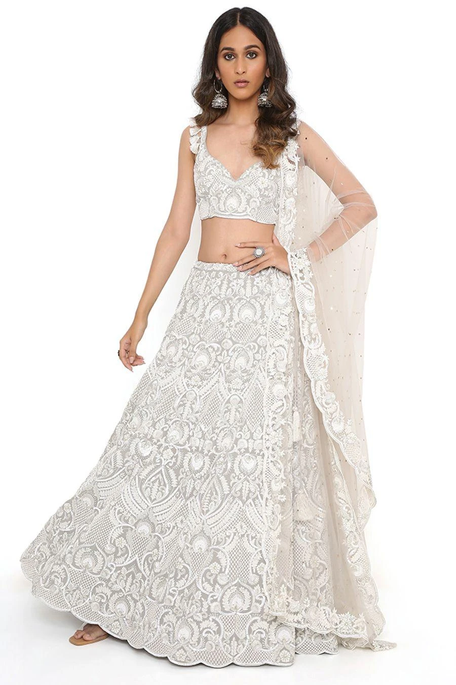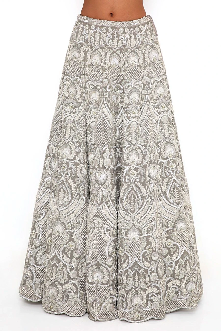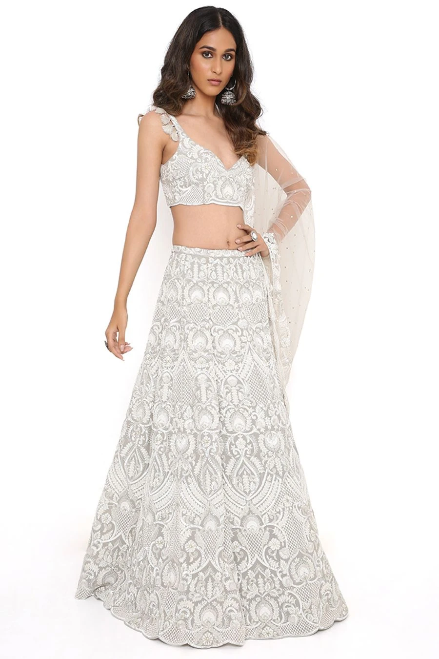 This lehenga set will see you through all kinds of festivities this wedding season. Crafted in georgette, this set features an embroidered choli and lehenga with a net mukaish dupatta. Add a pair of statement earrings to complete the look.