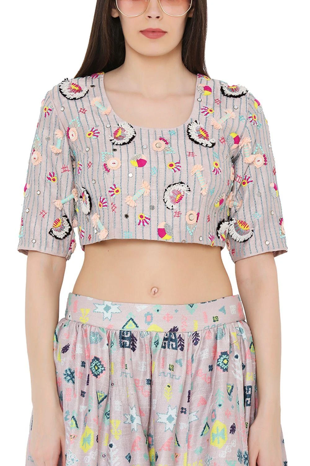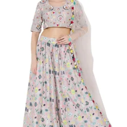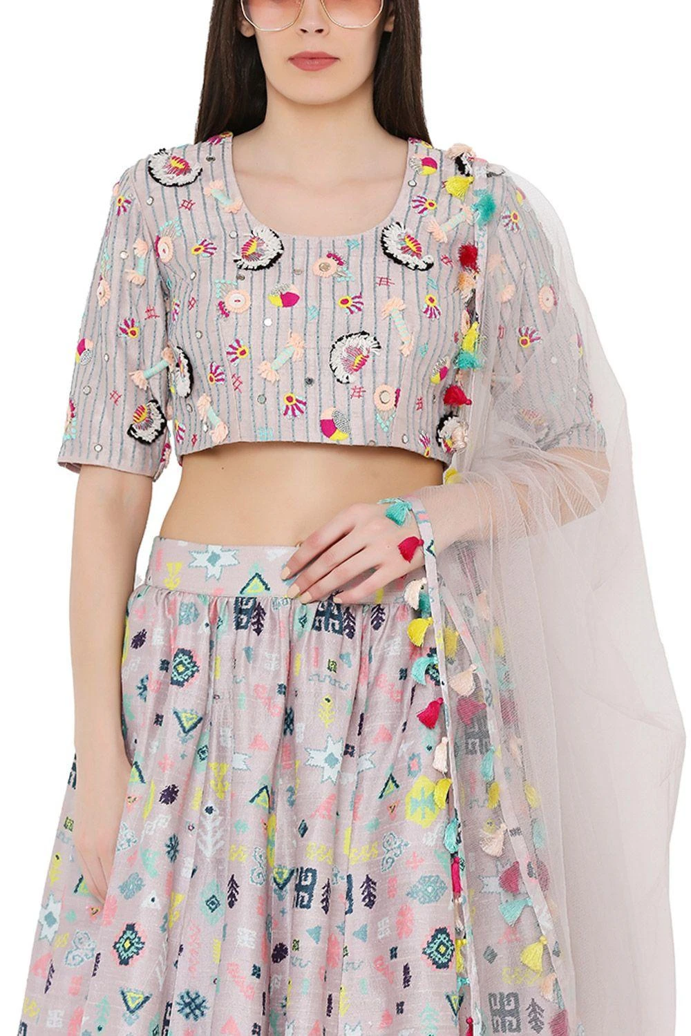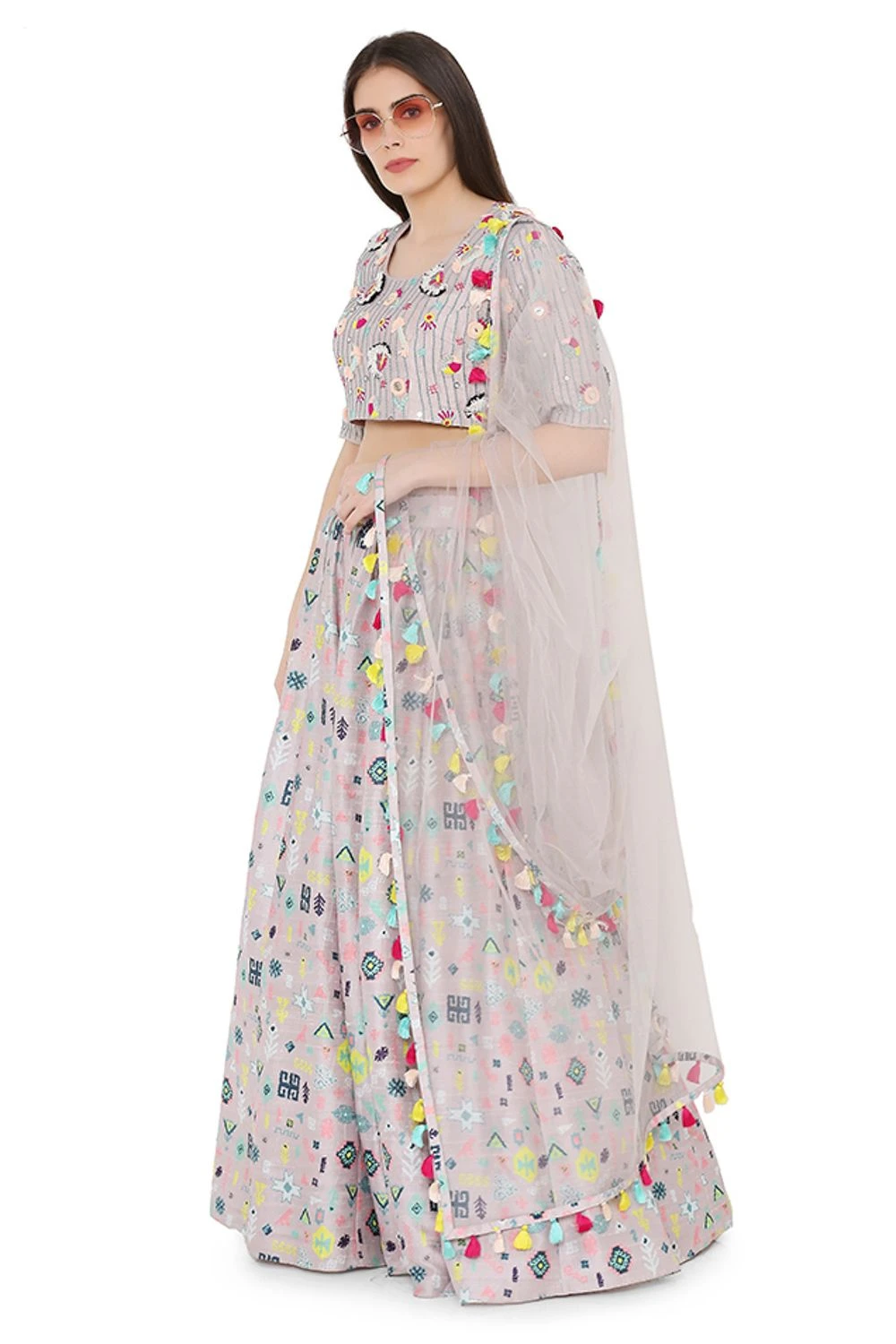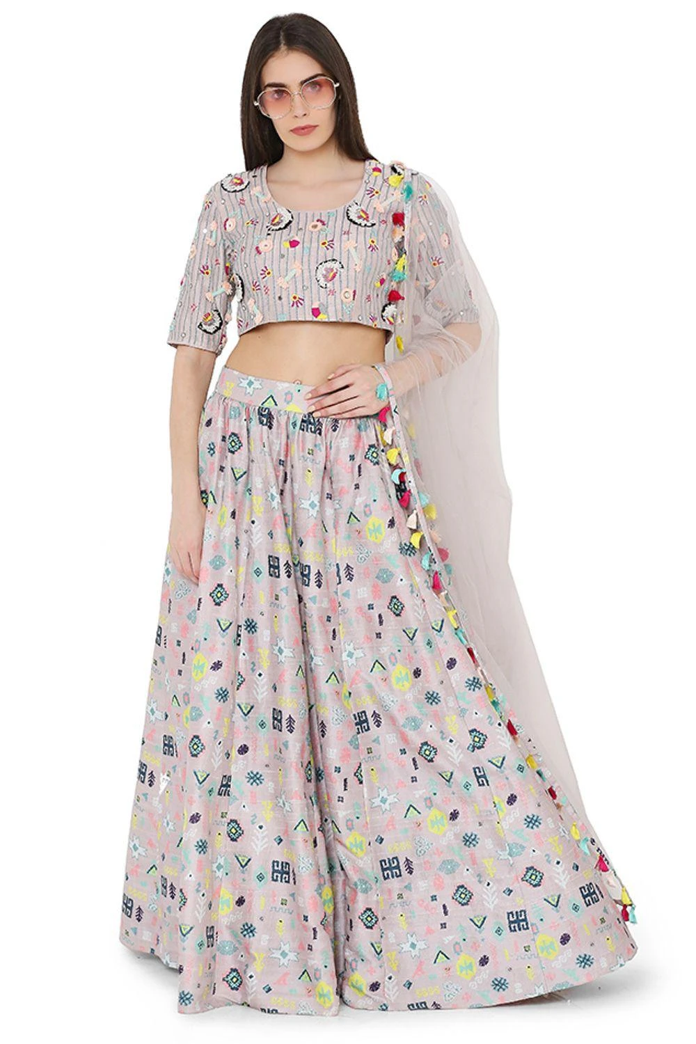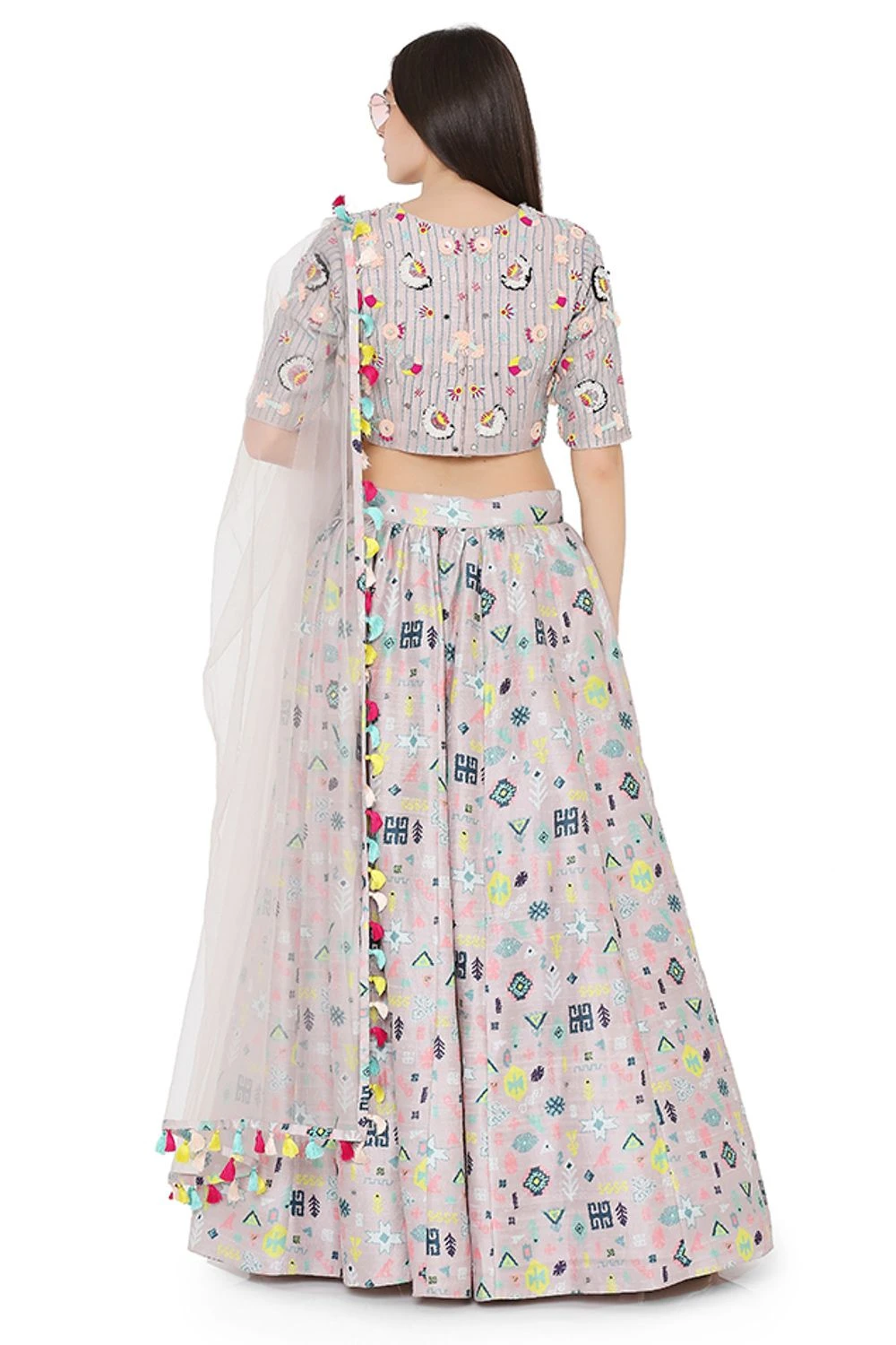 This playful lavender lehenga set is cut in a kilim printed dupion silk. The net dupatta is adorned with tassel detailing. Style this summery set for daytime wedding events.