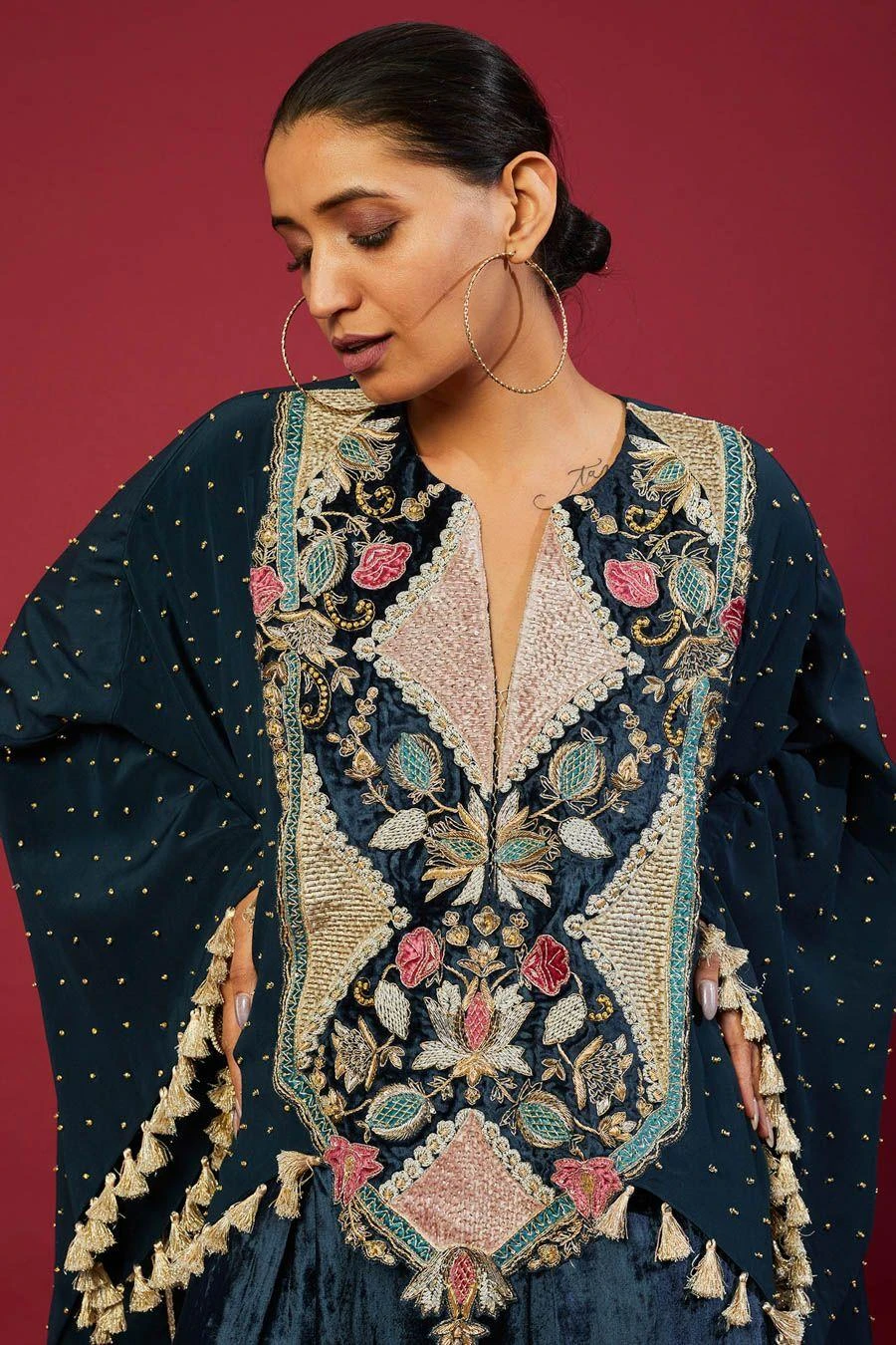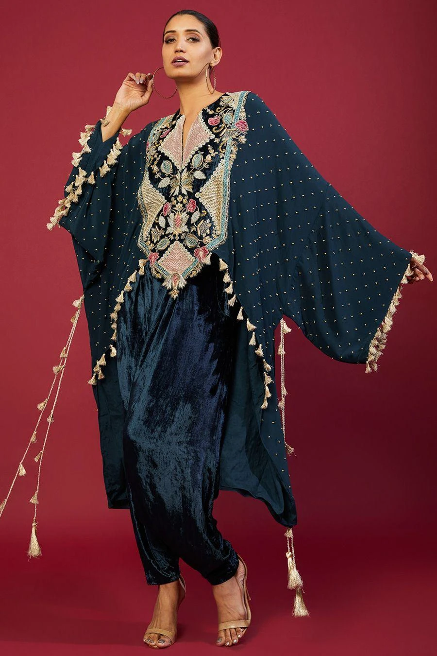 The perfect amalgamation of style & comfort, this kaftan set works across occasions. Crafted in crepe & velvet, this set features an embellished high low kaftan paired with low crotch pants. Add a pair of statement earrings to complete the look.