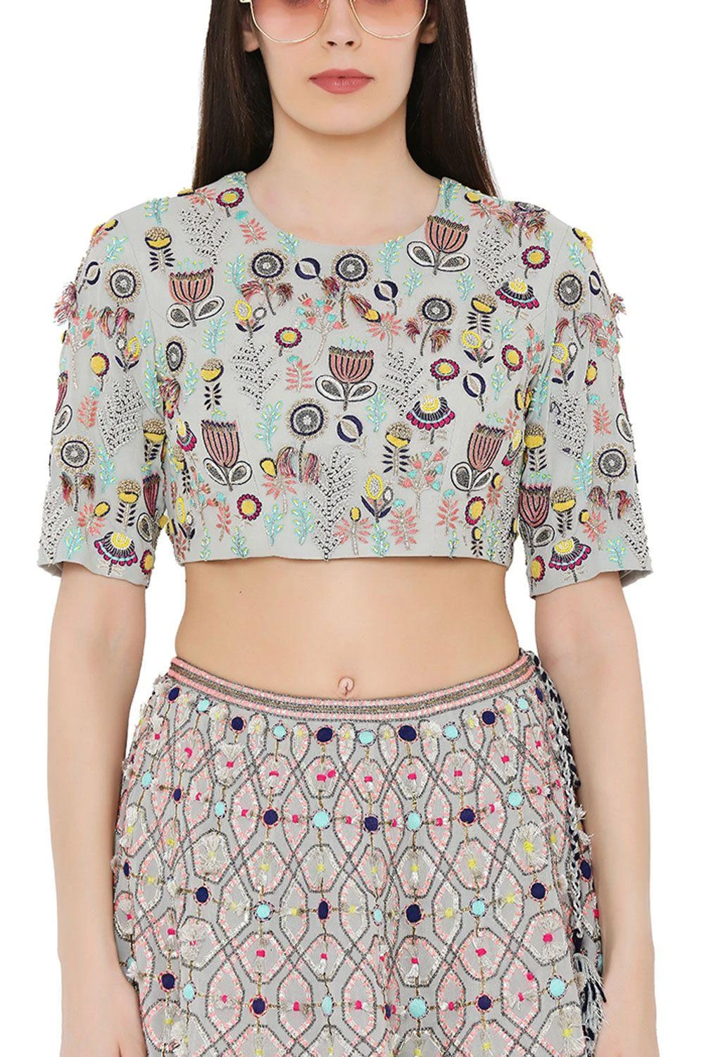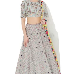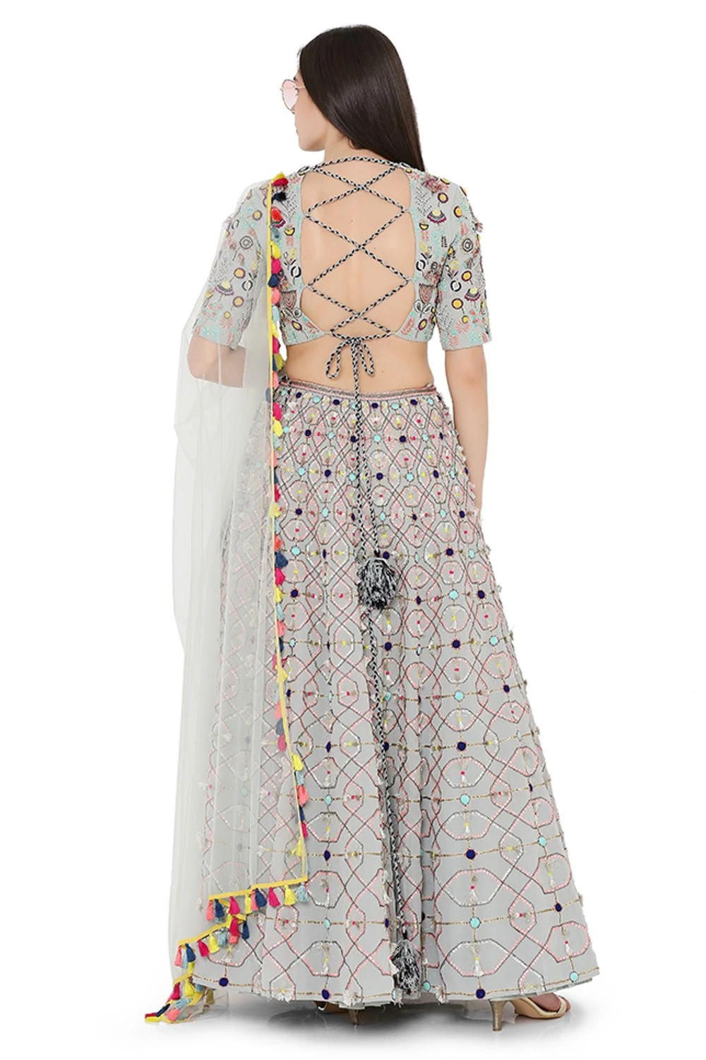 This pale blue embroidered lehenga comes with a back tie up choli & a net dupatta with contrast piping & colourful tassel detailing. Style this summery set for daytime wedding festivities.