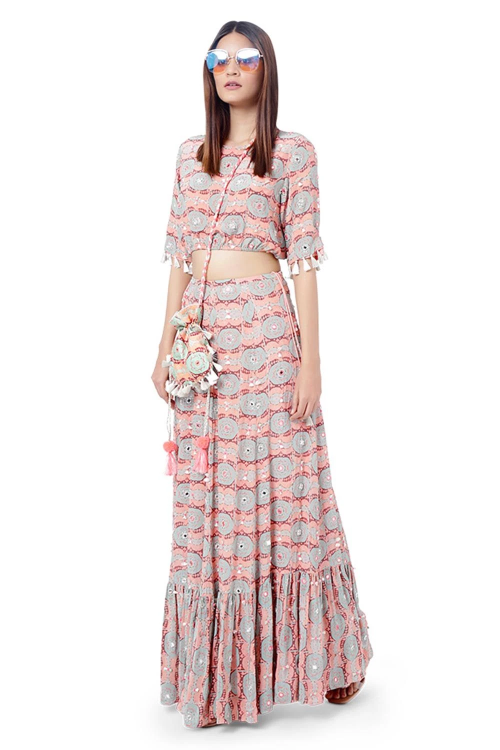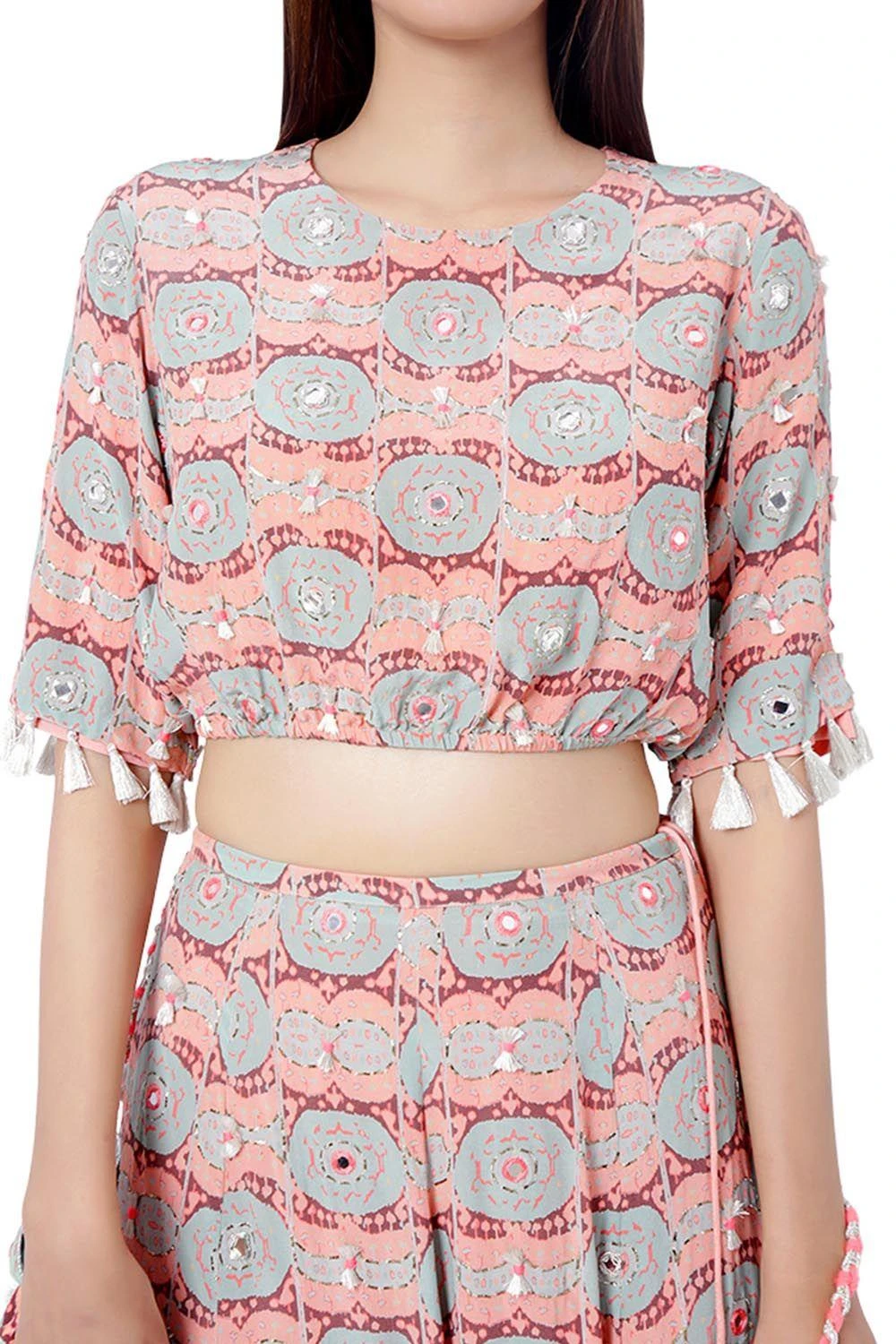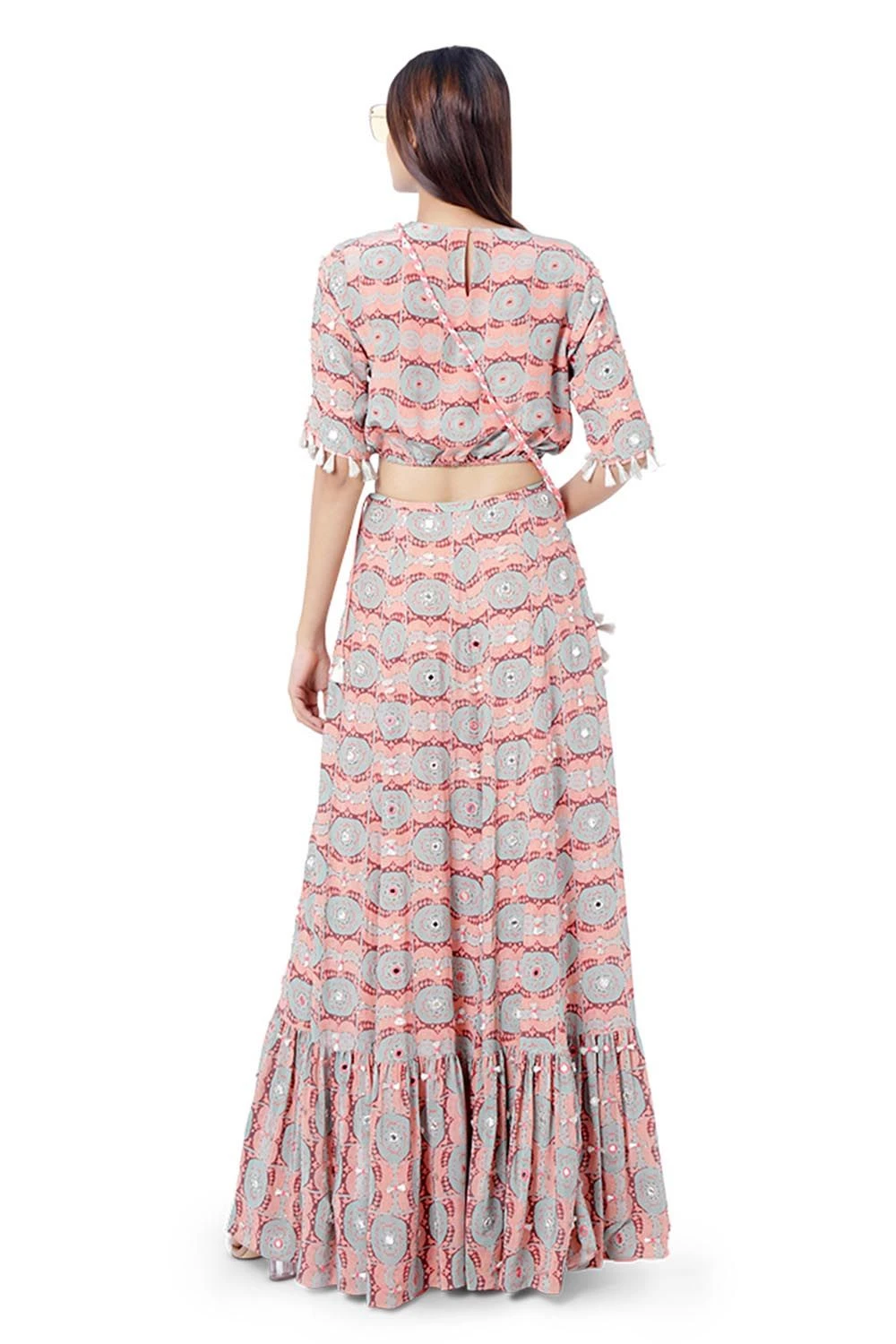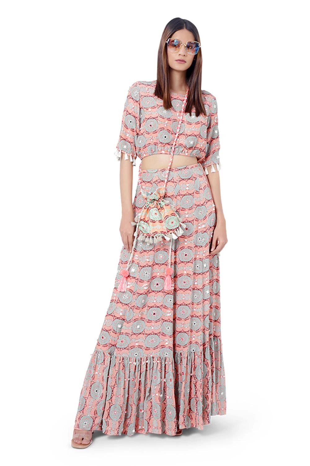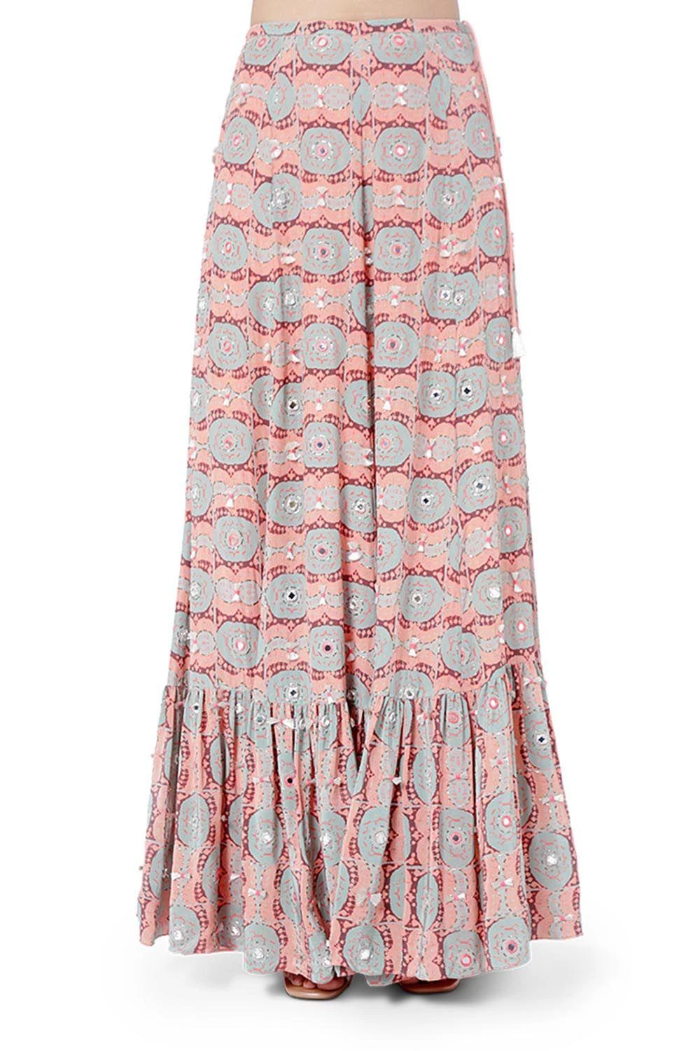CORAL EVIL EYE PRINT CREPE EMBROIDERED BALLOON TOP WITH FRILL SKIRT