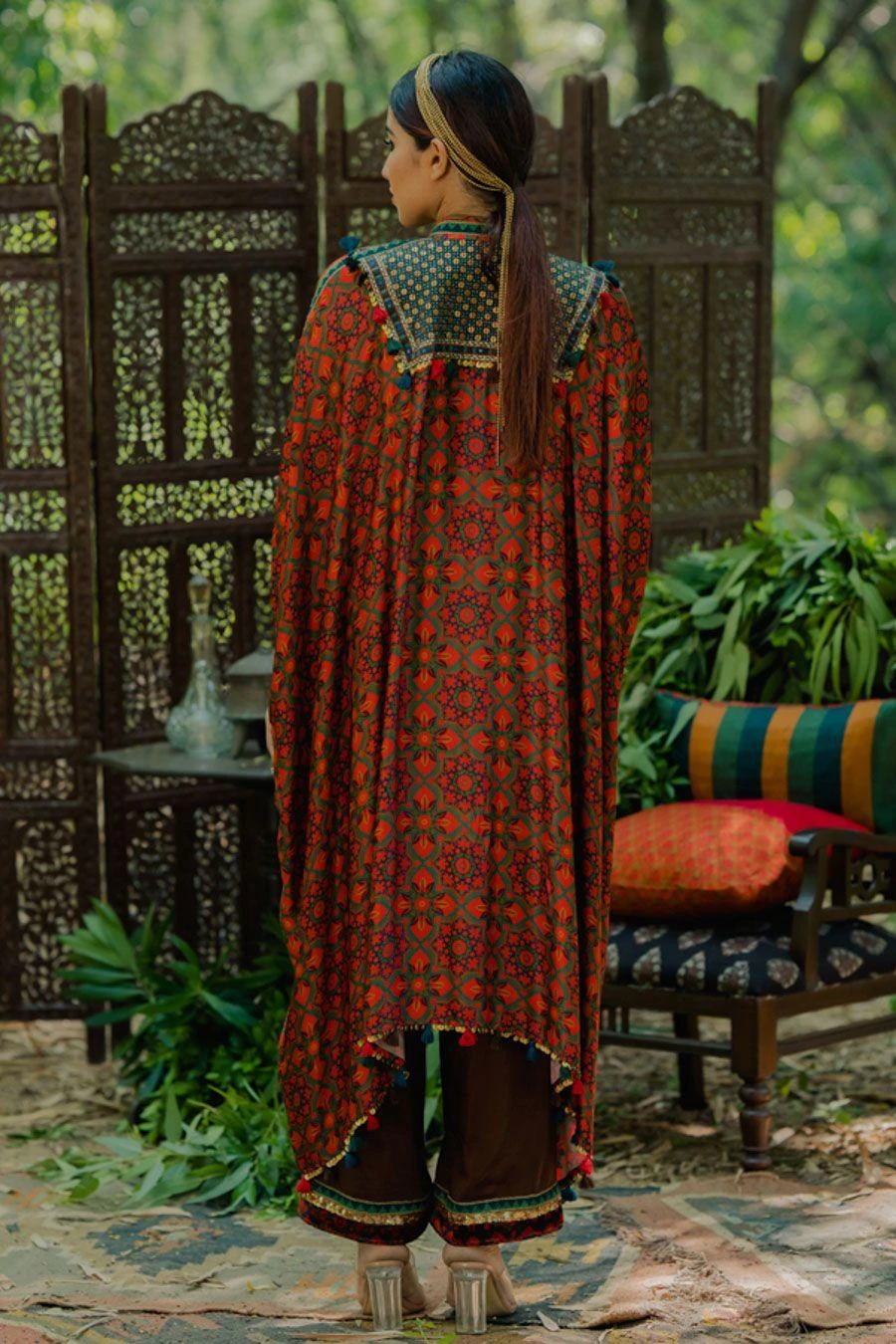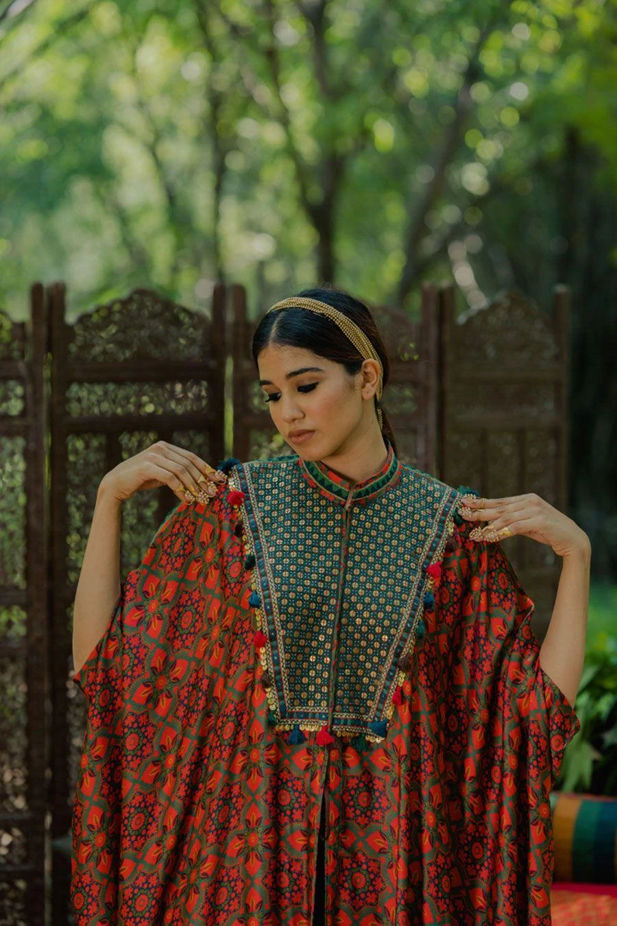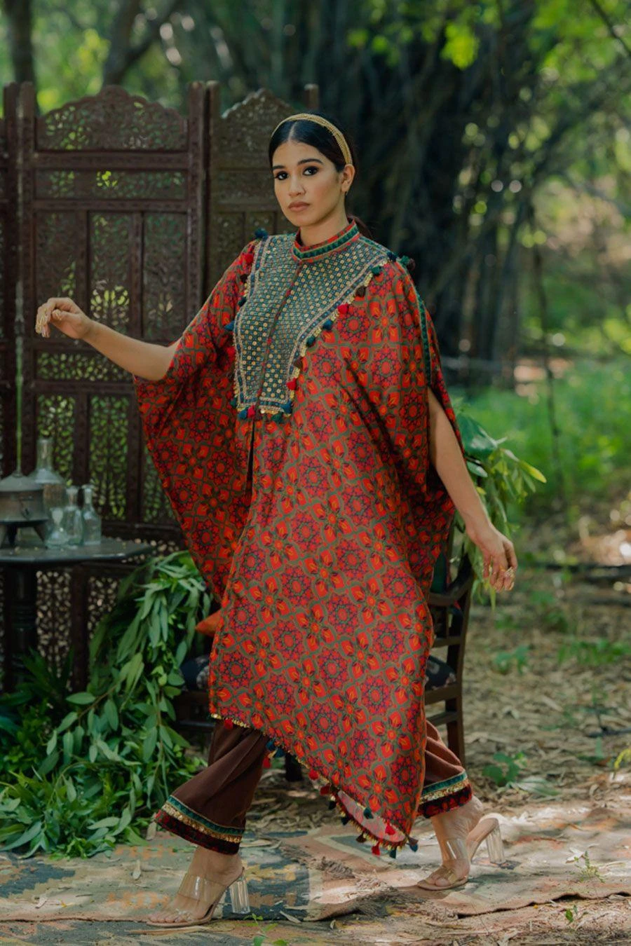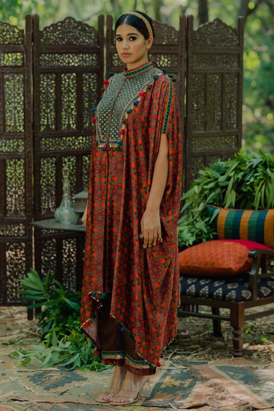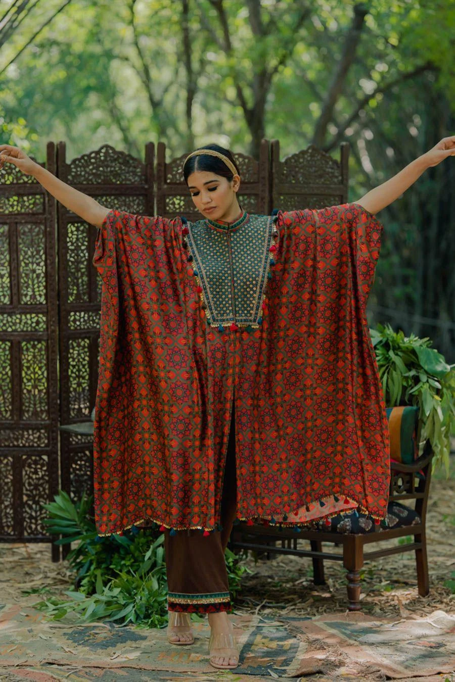 The perfect amalgamation of style & comfort, this kaftan set works across occasions. Crafted in cotton satin, this set features an aari embroidered kaftan and pants. Add a pair of statement earrings to complete the look.