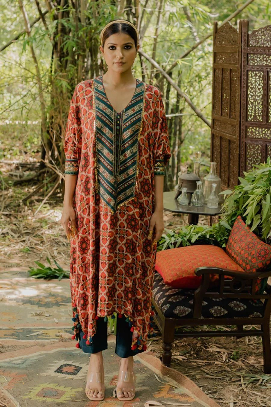 The perfect amalgamation of style & comfort, this kaftan set works across occasions. Crafted in cotton satin, this set features an aari embroidered kaftan and pants. Add a pair of statement earrings to complete the look.