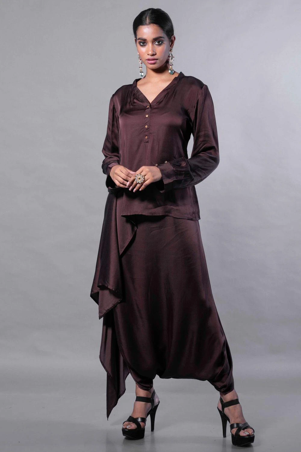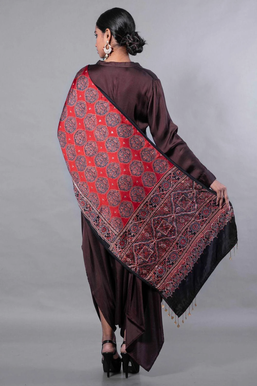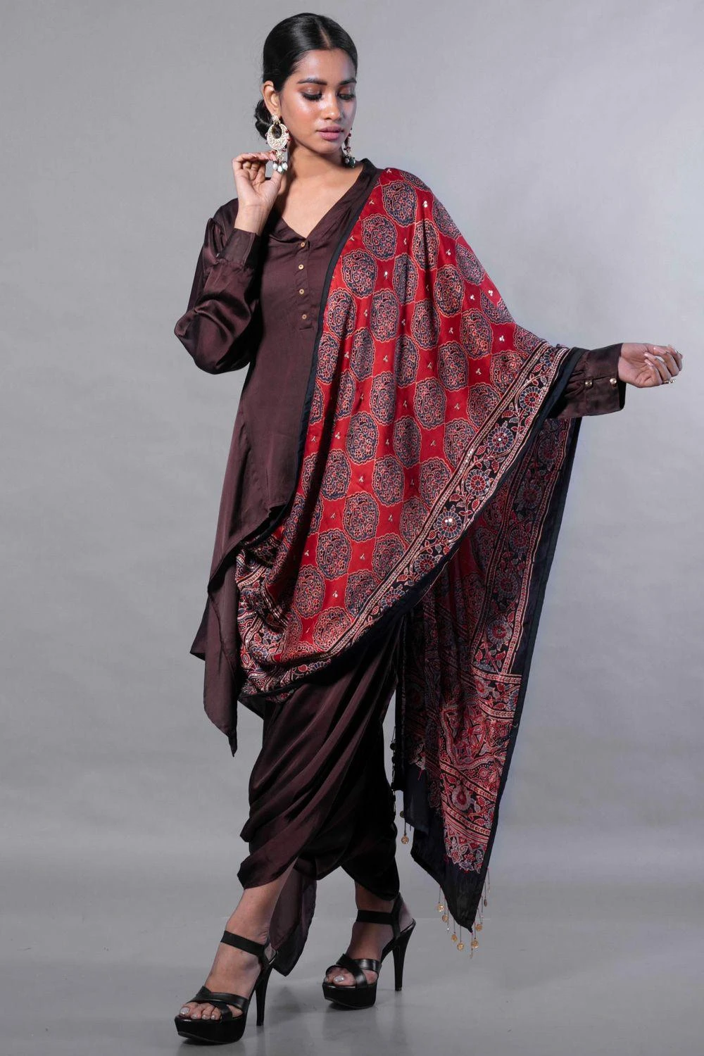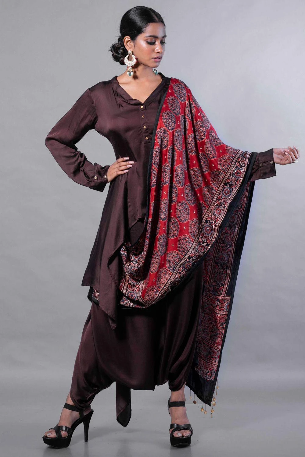 Traditional textile & modern silhouette come together to make this piece of beauty. This set features an asymmetric tunic in satin silk paired with harem style skirt and a hand embroidered ajrak drape dupatta in rich blue handblock on satin.