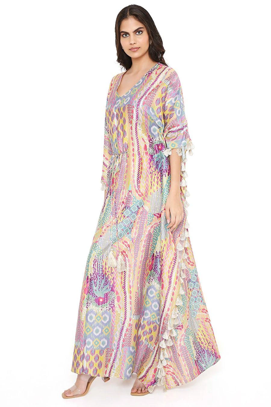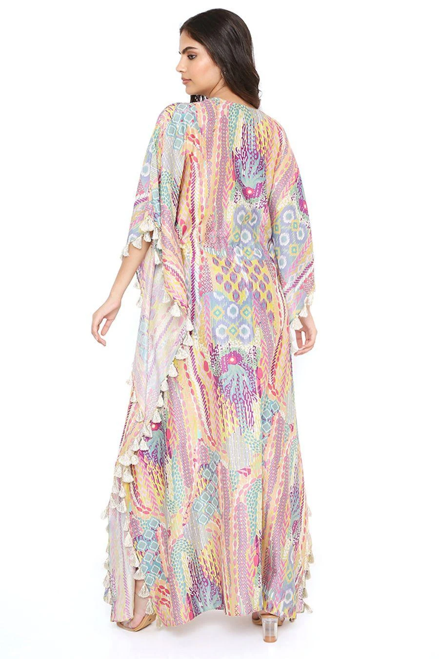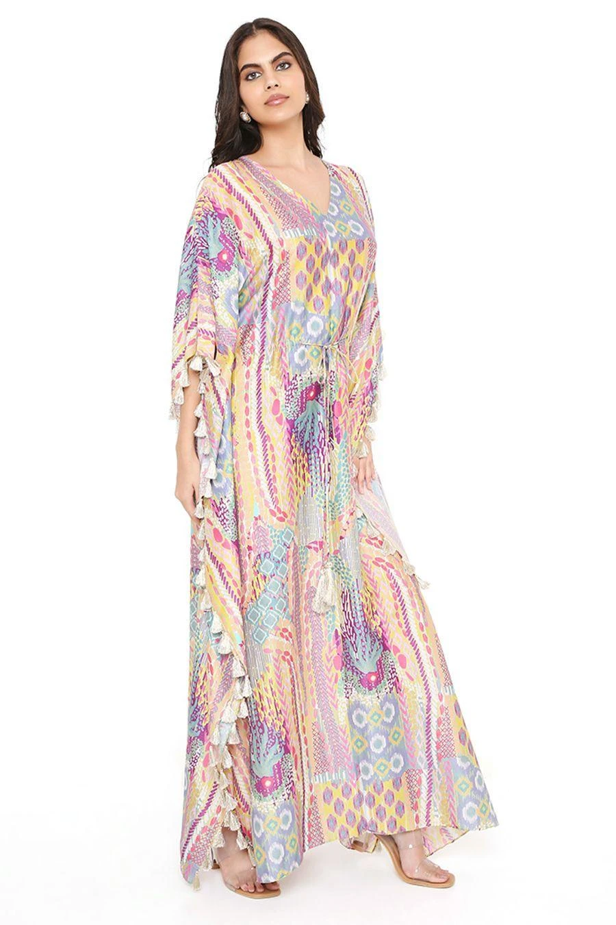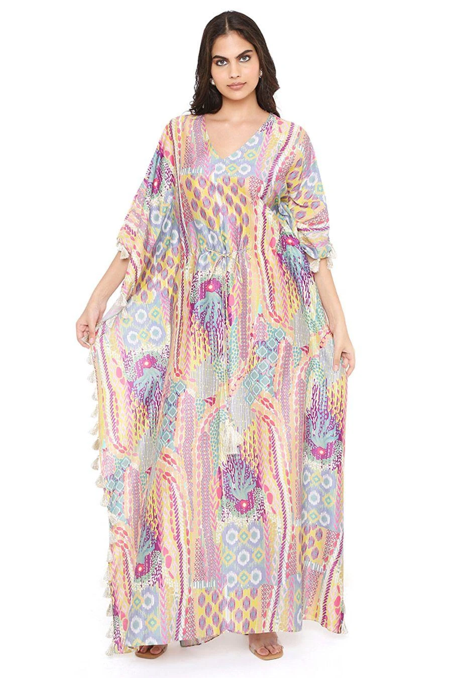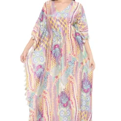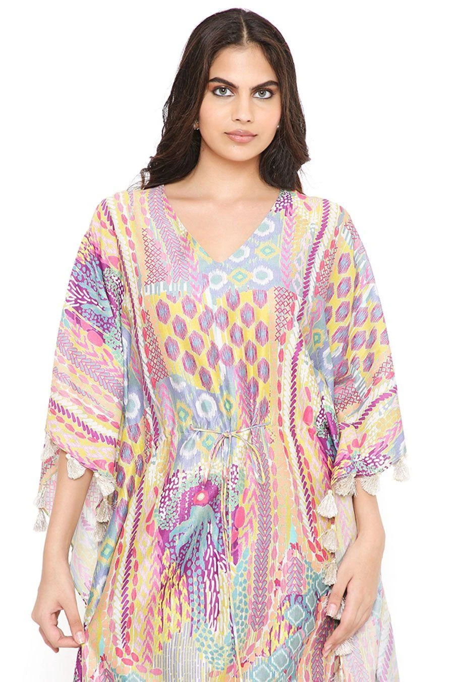 Add a layer of statement and glamour to your resort getaways with this kaftan. Crafted in silkmul, this lime green African print kaftan comes with tassels. Add a pair of dangler earrings to complete the look.