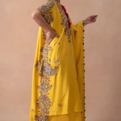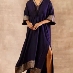 This chintz silk print V neck kaftan features Kutch borders with thread fringes all along the nape of the neckline till the mid arm after the elbow. Add a pair of statement earrings to complete the look.