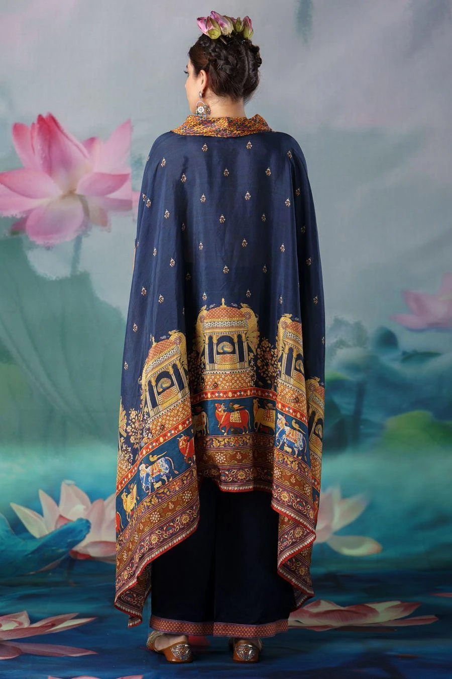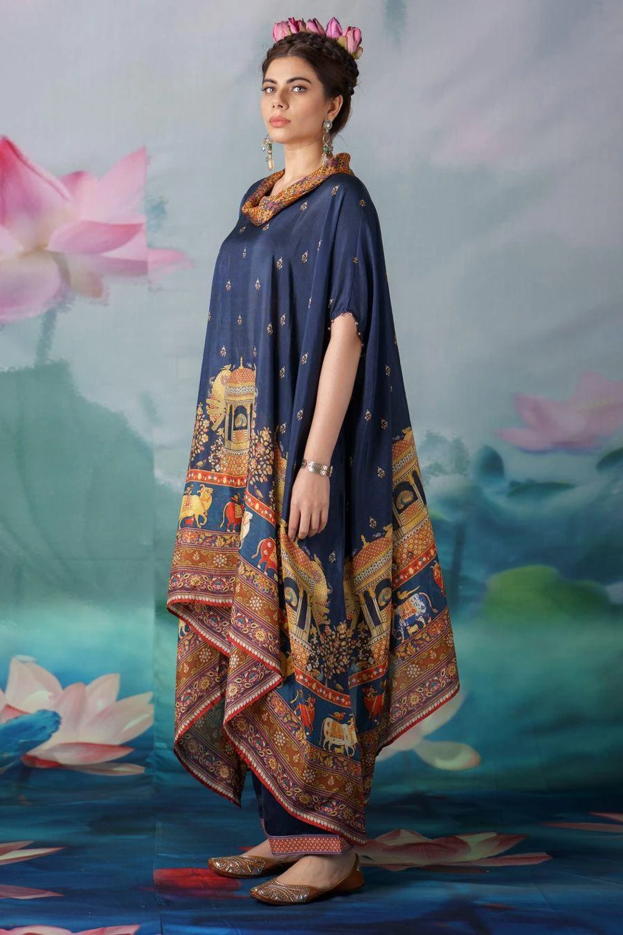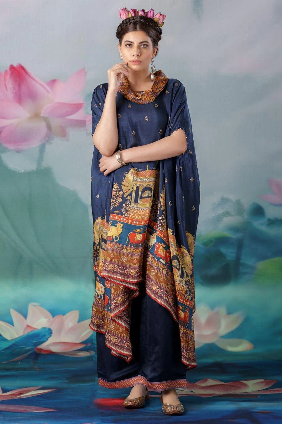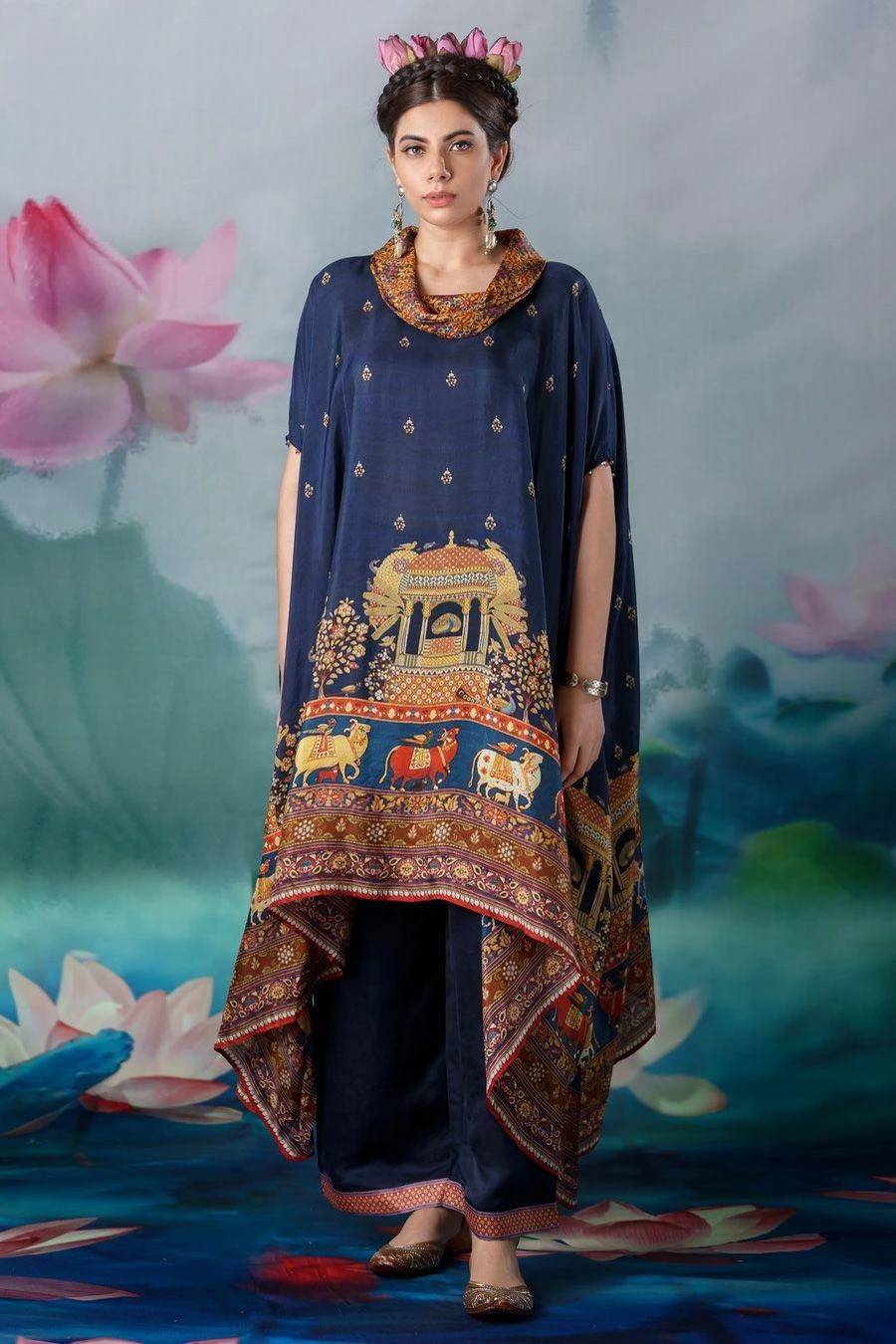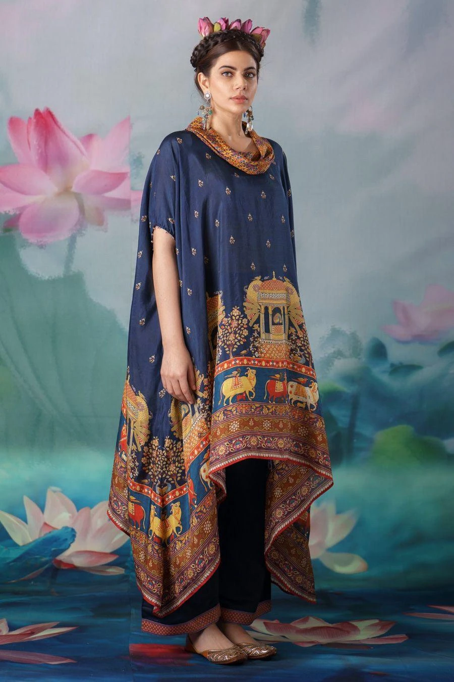 The perfect amalgamation of style & comfort, this tunic set works across occasions. Crafted in silk & satin, this set features a printed draped tunic with a cowl neckline paired with coordinating plain palazzo pants.