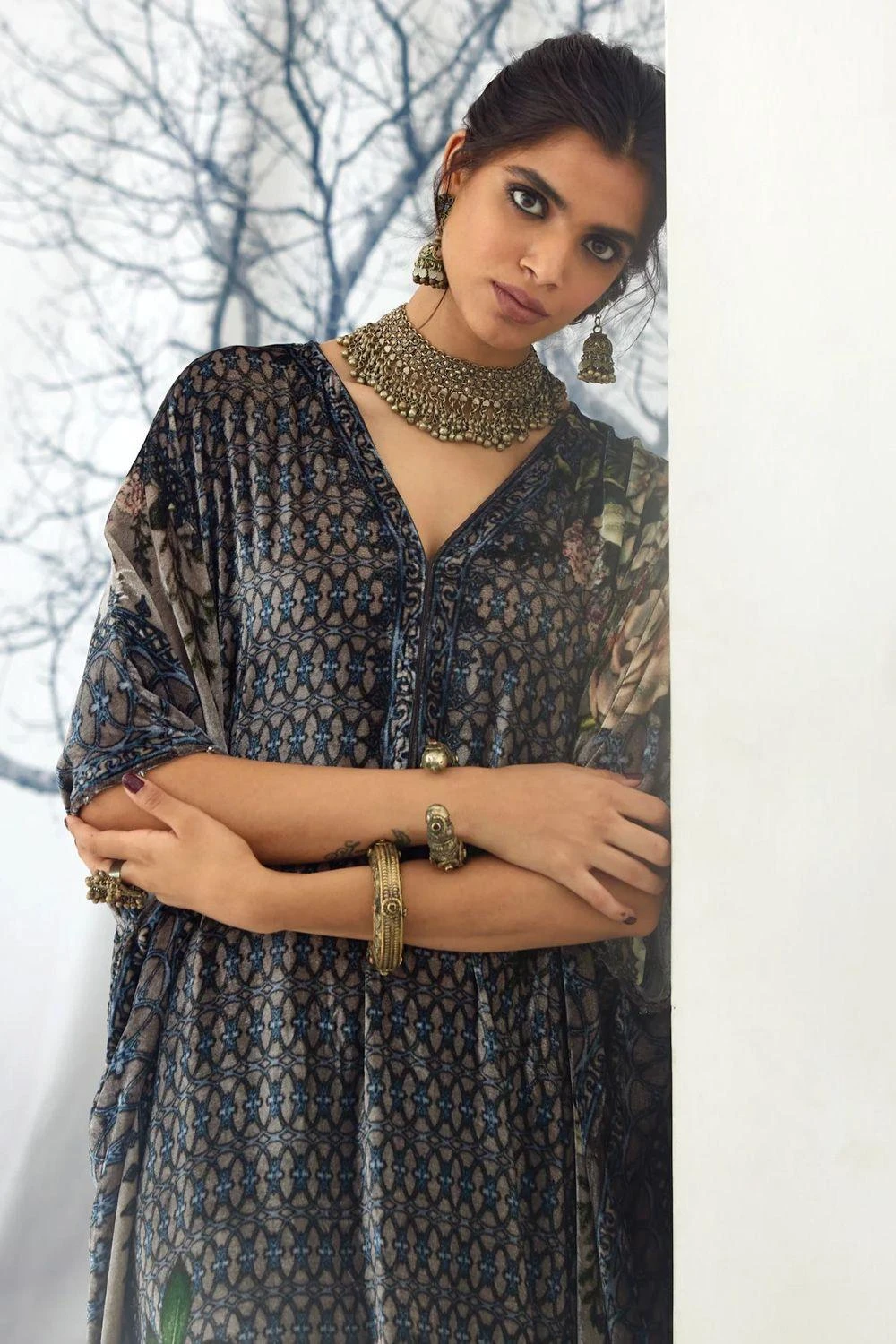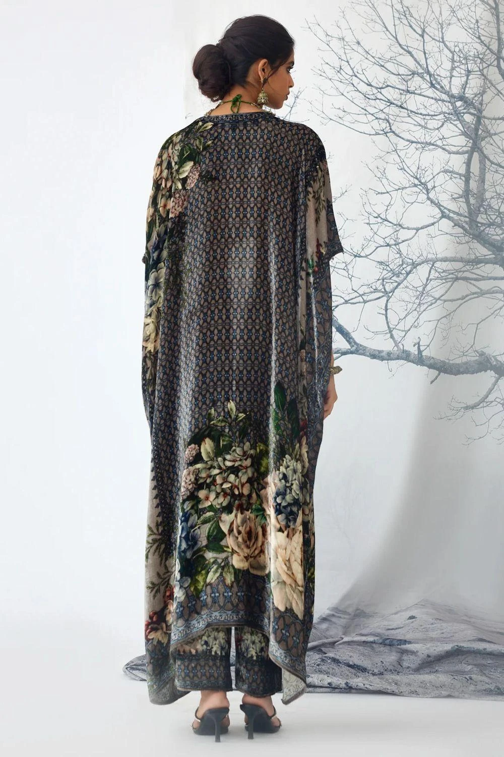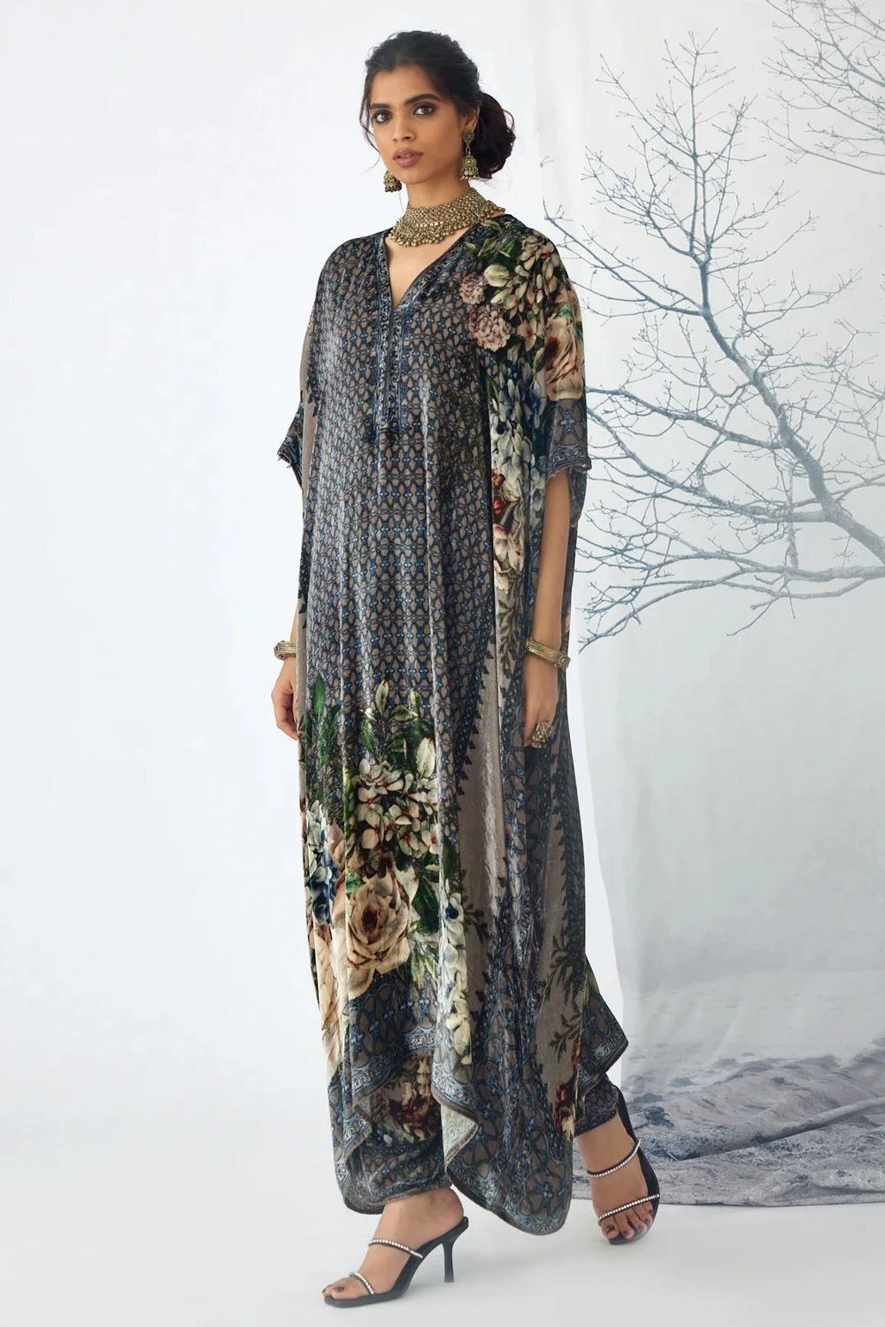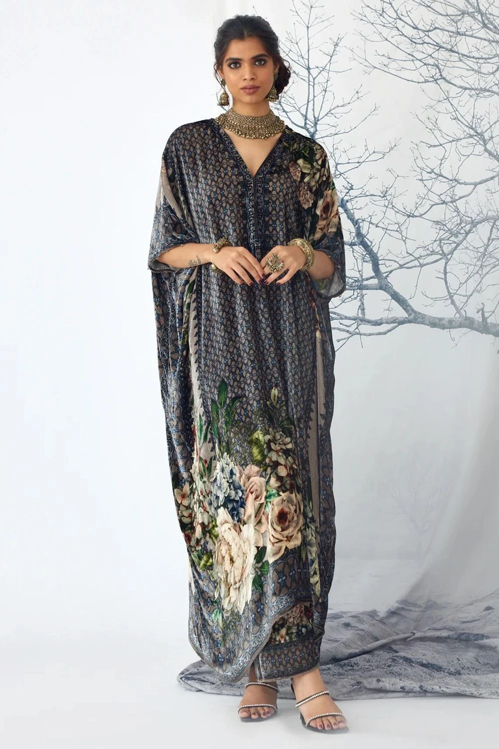 Indulge in chic style with this brown silk V-neck kaftan, blending floral & geometric prints. Perfect for resort elegance, pair up with sandals for a relaxed vibe or elevate with heels for a classic evening allure. Versatile for any occasion!