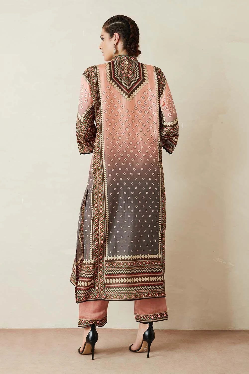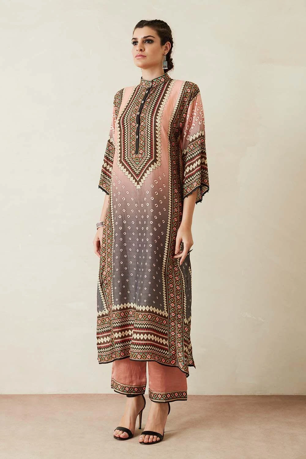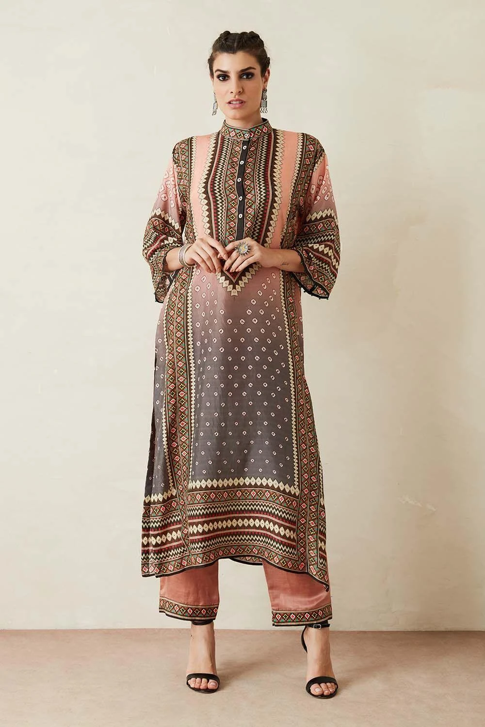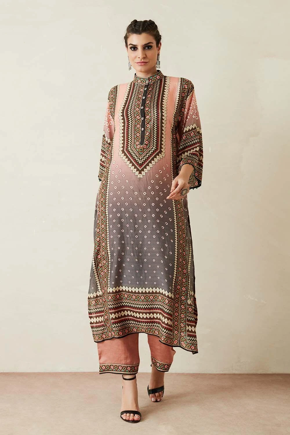 This stunning pink ombre printed silk kurta is comfortable & easy to wear. It has print details in a contrasting colour making it dressy & perfect for intimate gathering and festive occasions.