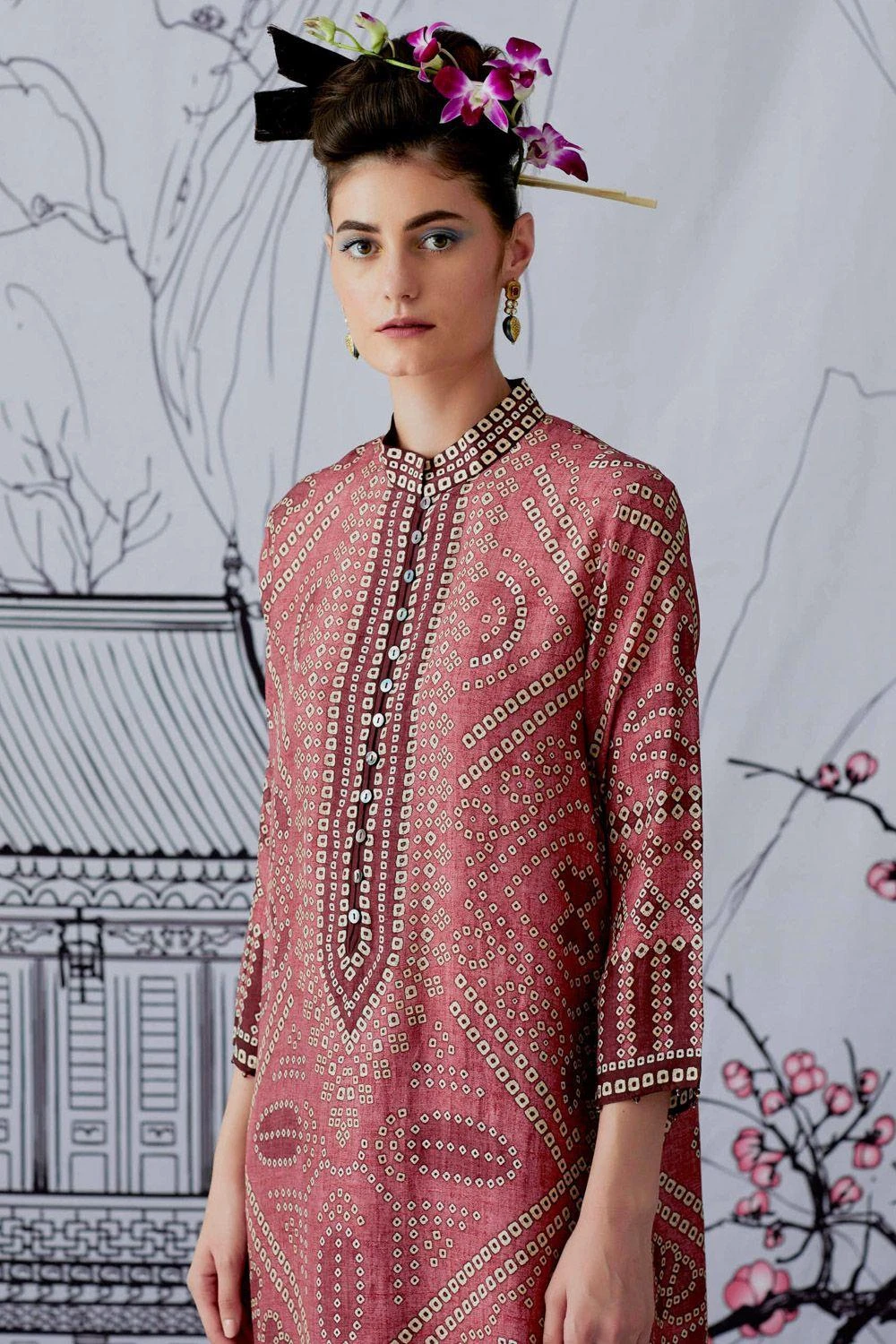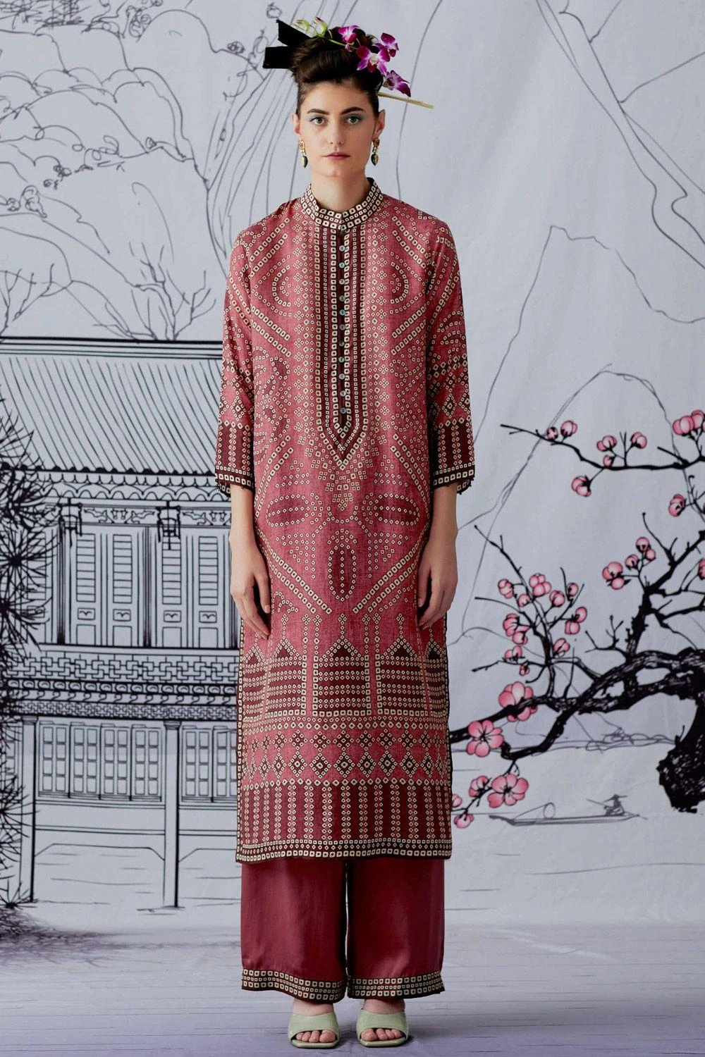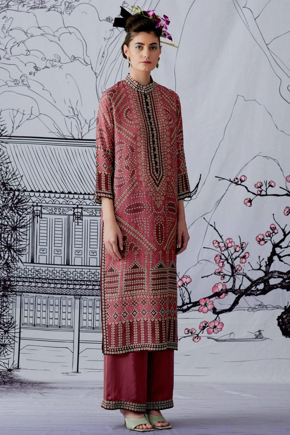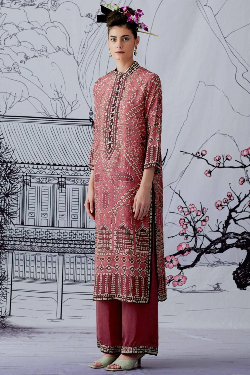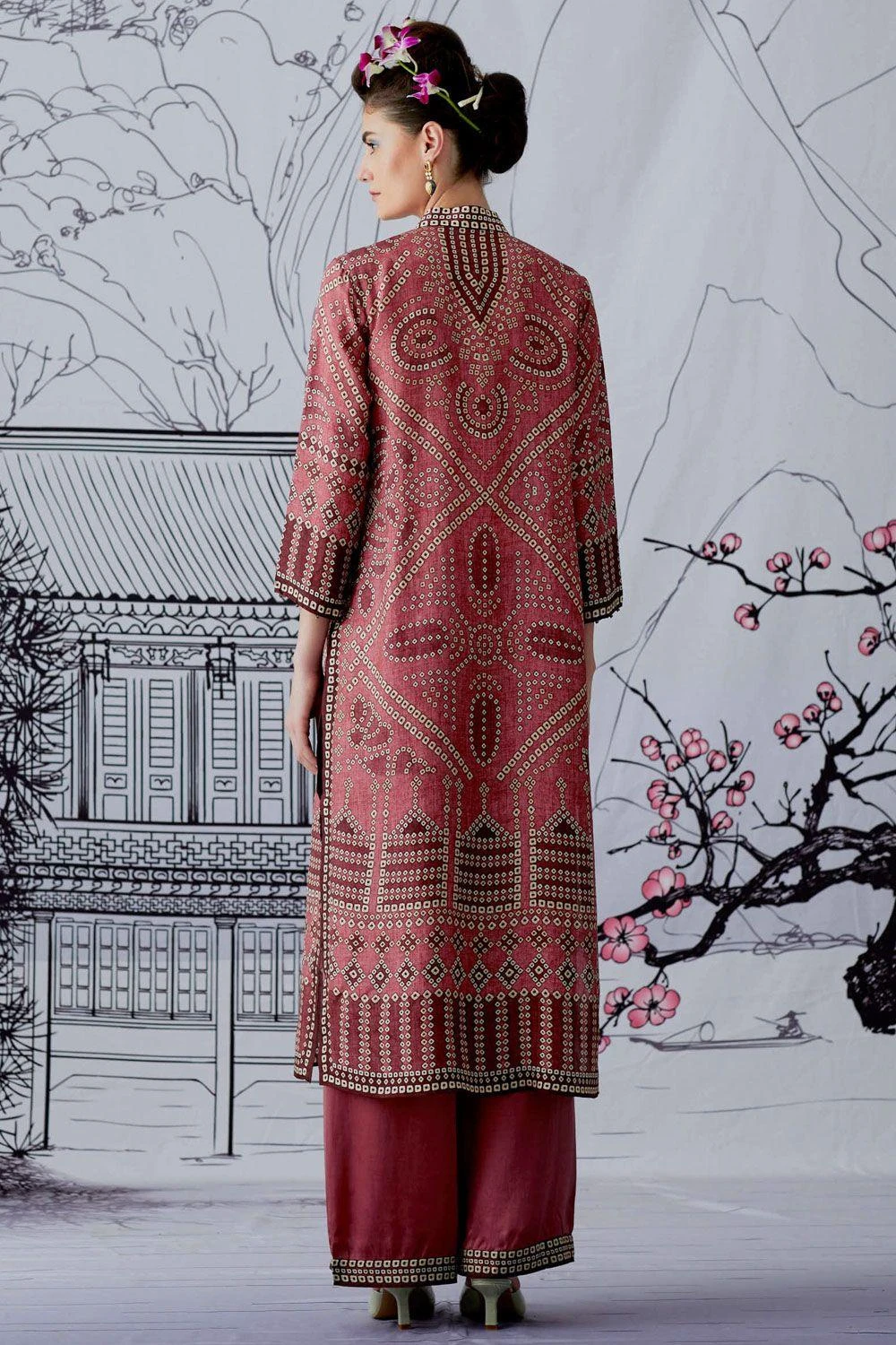 This pink bandhani printed kurta is perfect for daytime festivities. This elegant piece is set in a luxe silk fabric. Style this piece with the matching palazzos to complete your look.