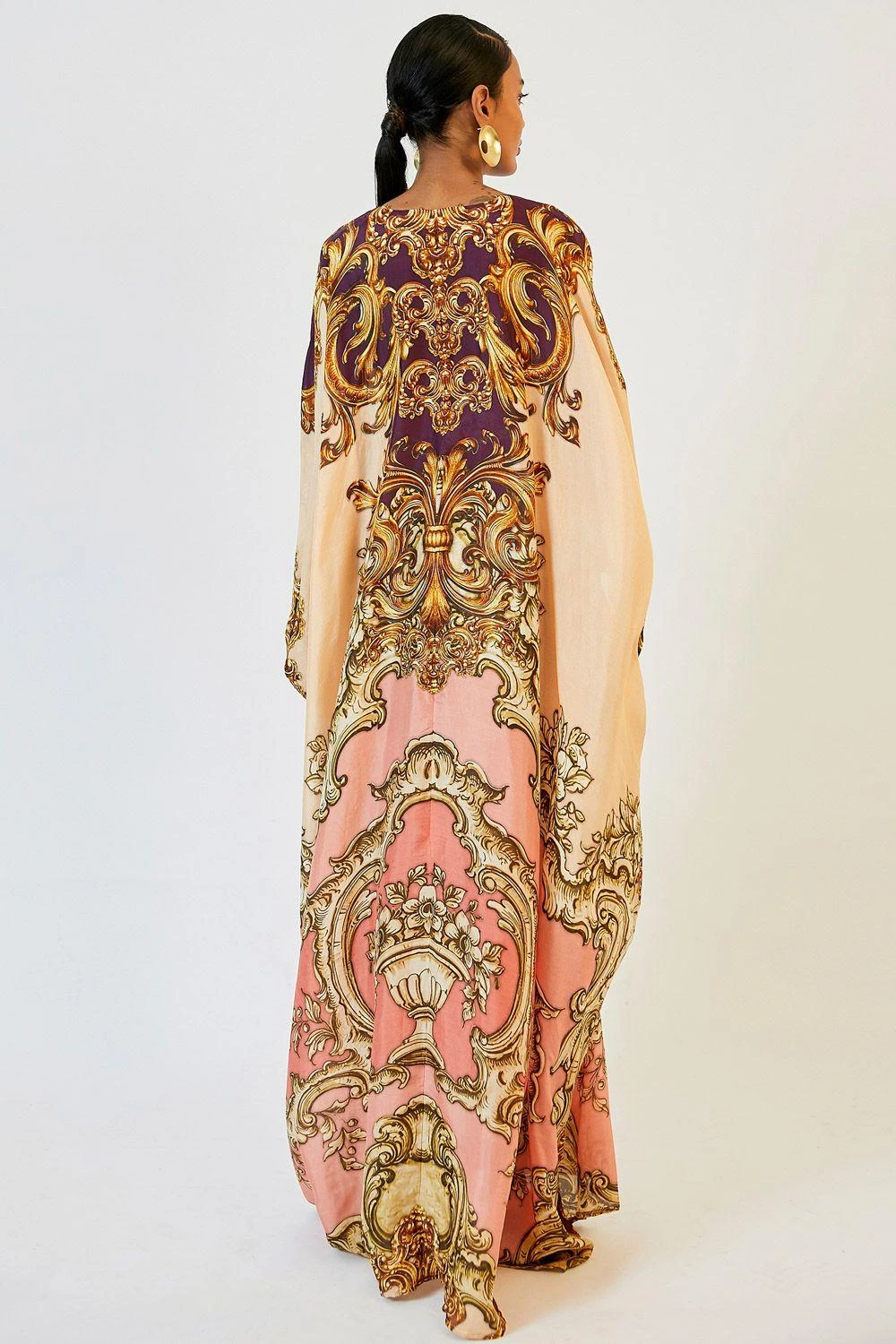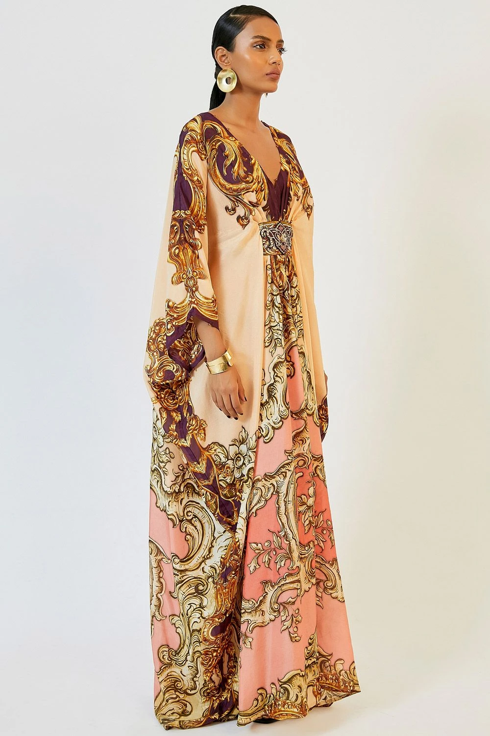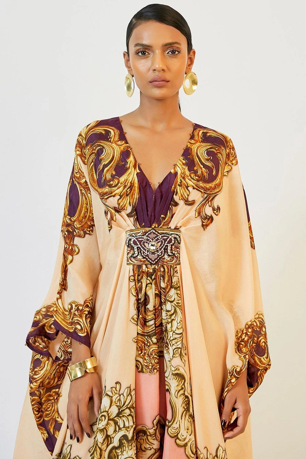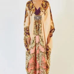 This warm blush printed kaftan channels an old world charm. It is made in sumptuous silk and features a belted empire waist with a signature brooch and swarovski crystals. Style it with a pair of elegant drop earrings.