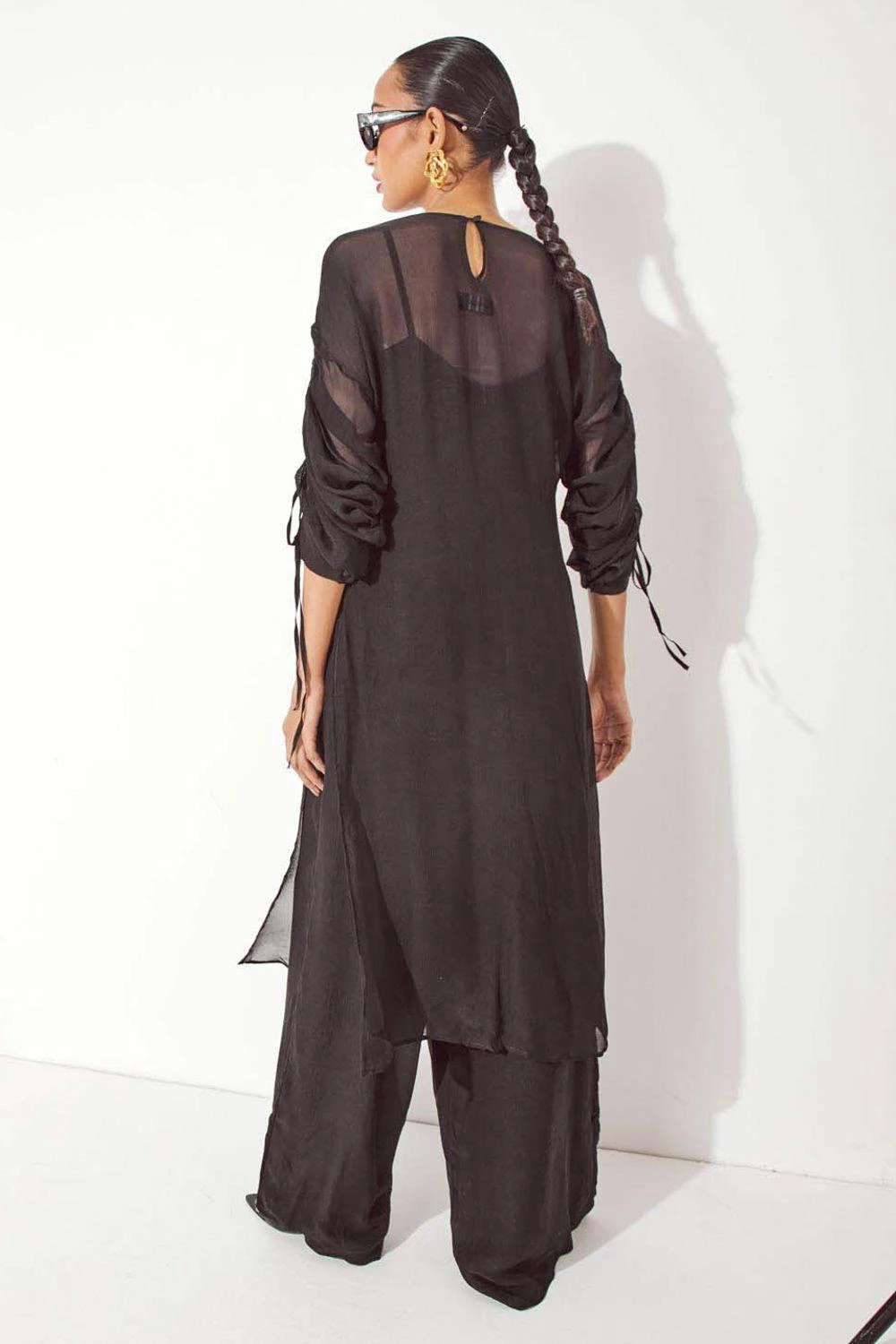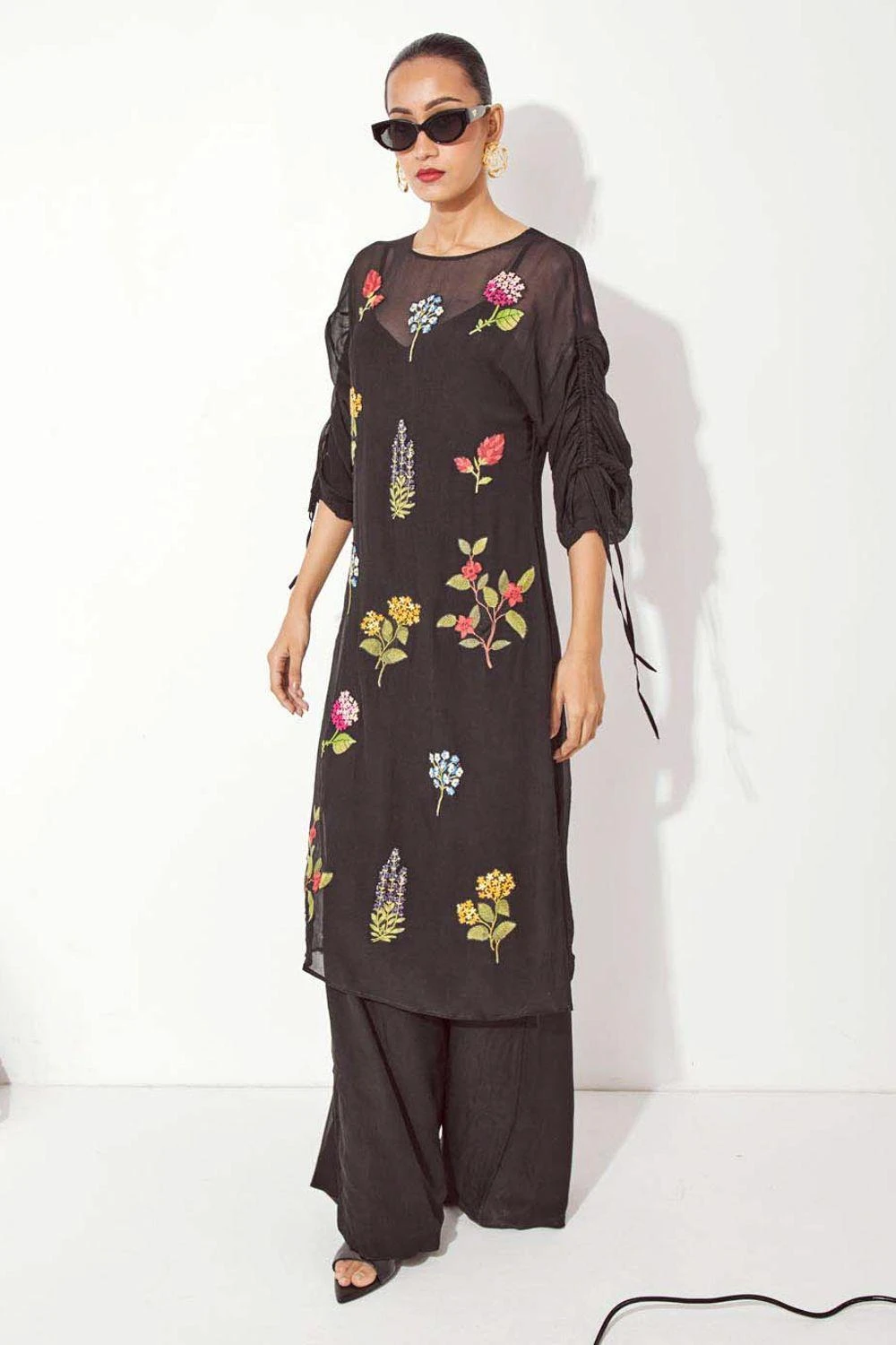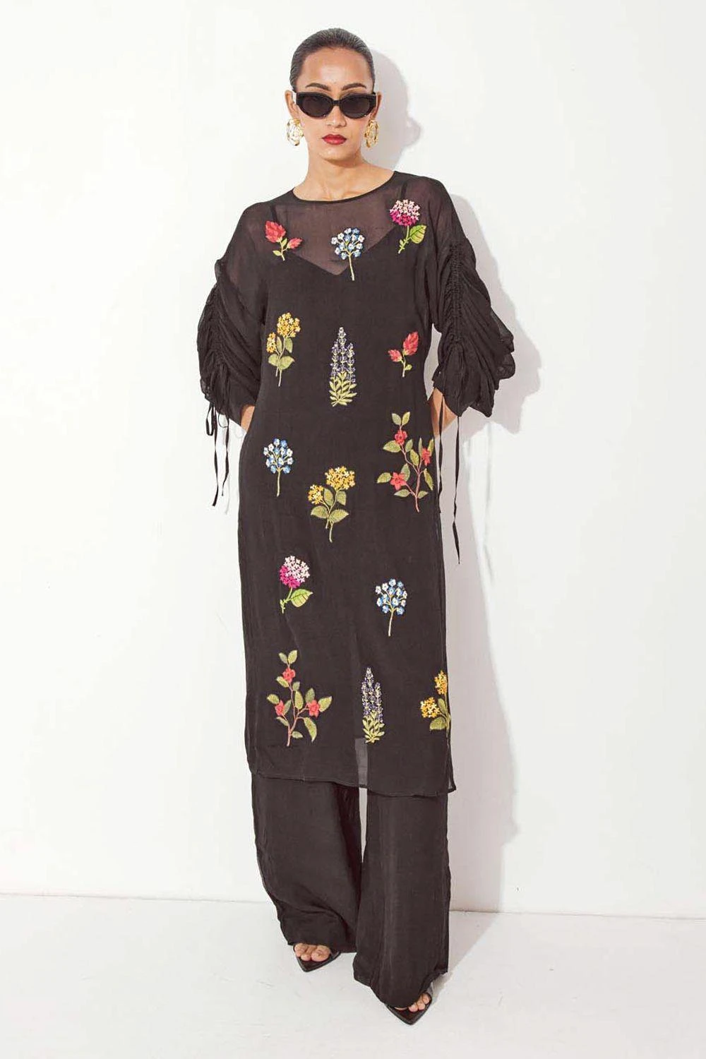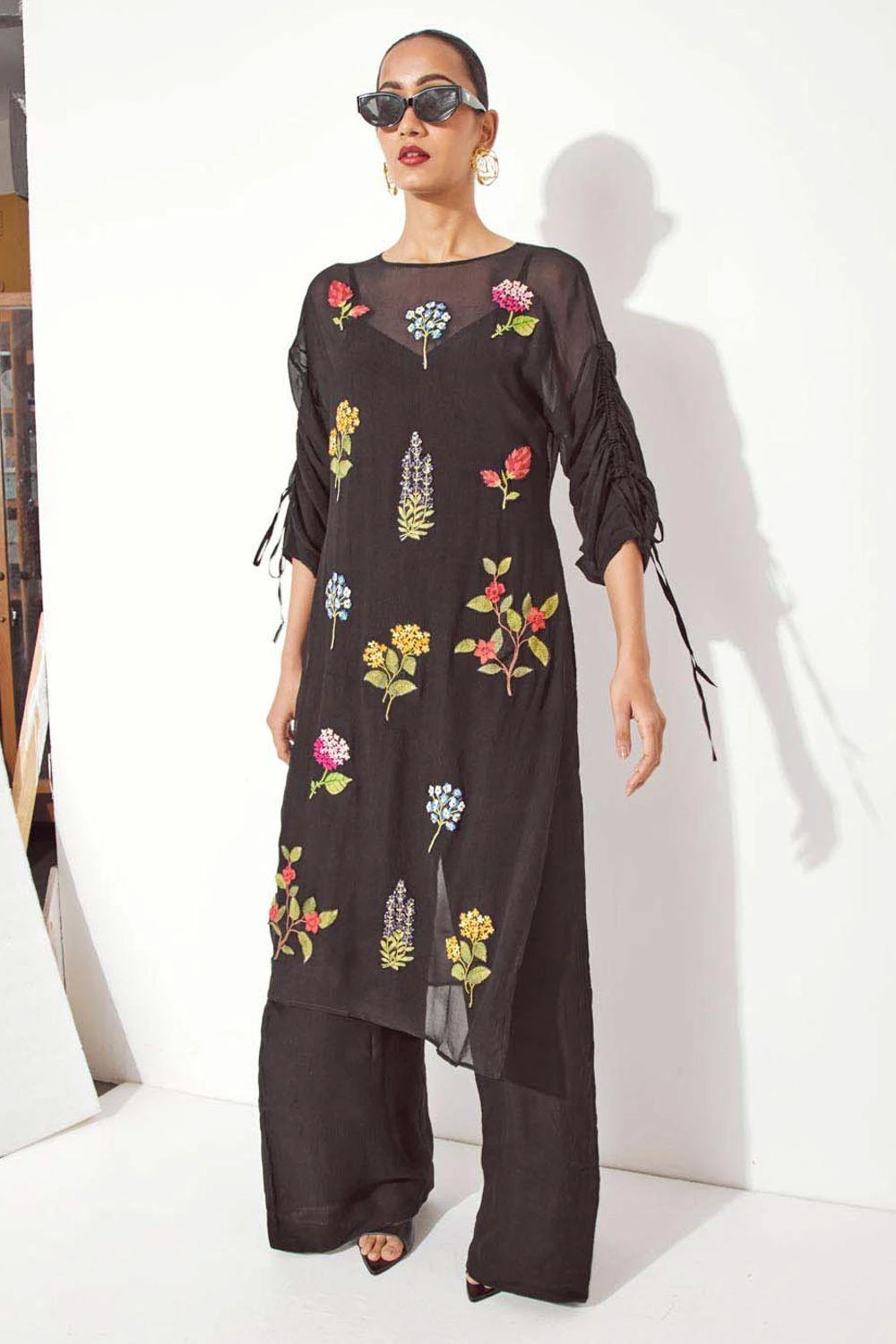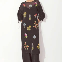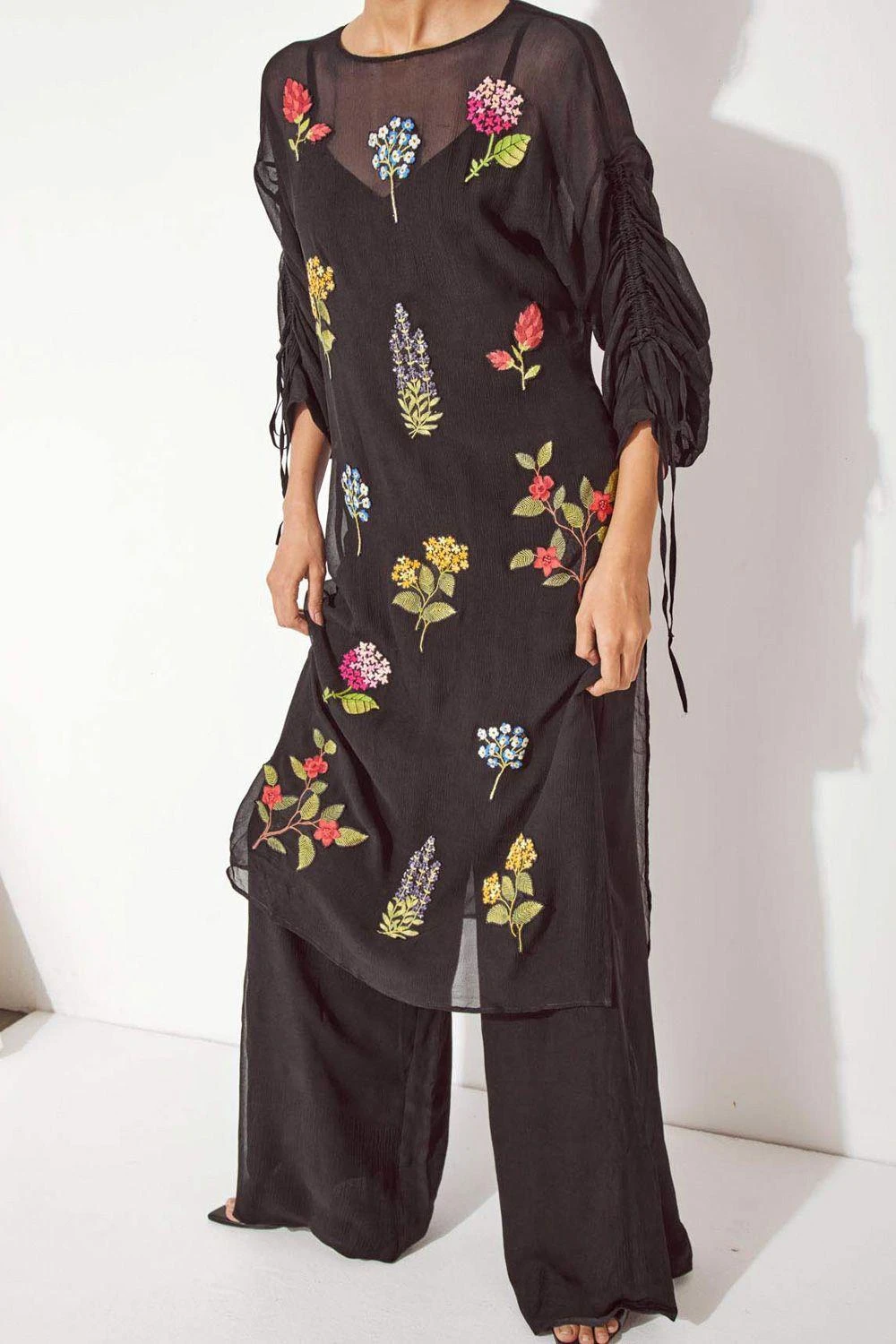 Step into elegance with this sheer chiffon tunic adorned with exquisite embroidered floral appliques and our signature sleeve details. Paired perfectly with a sleeveless chiffon jumpsuit, creating a chic and sophisticated ensemble.