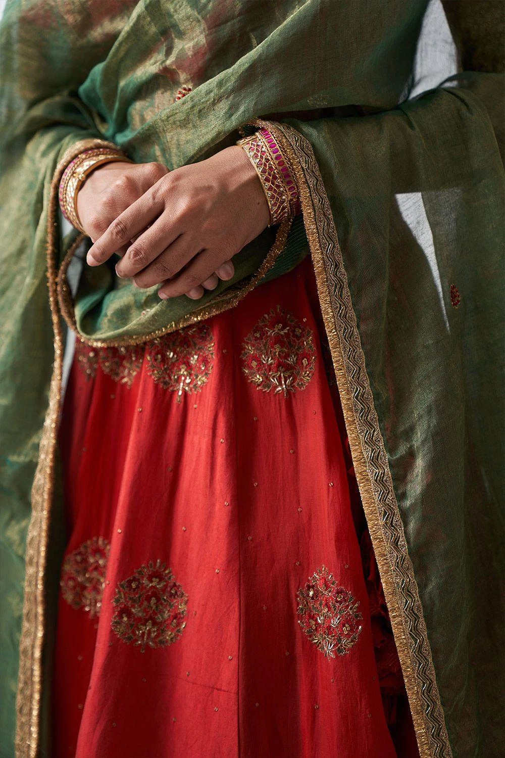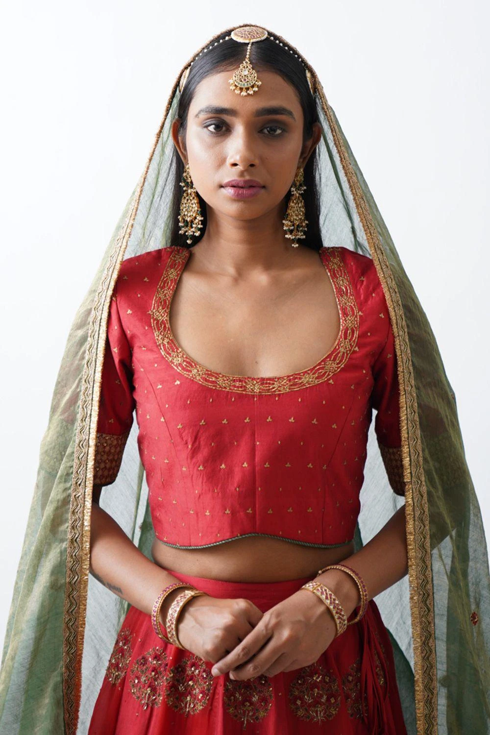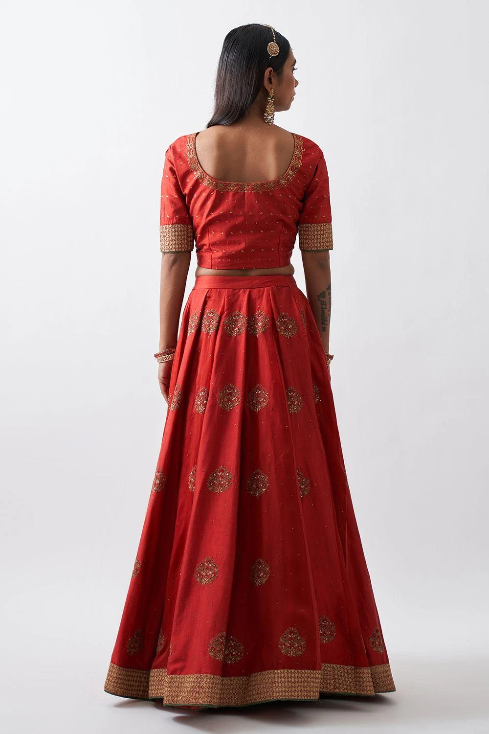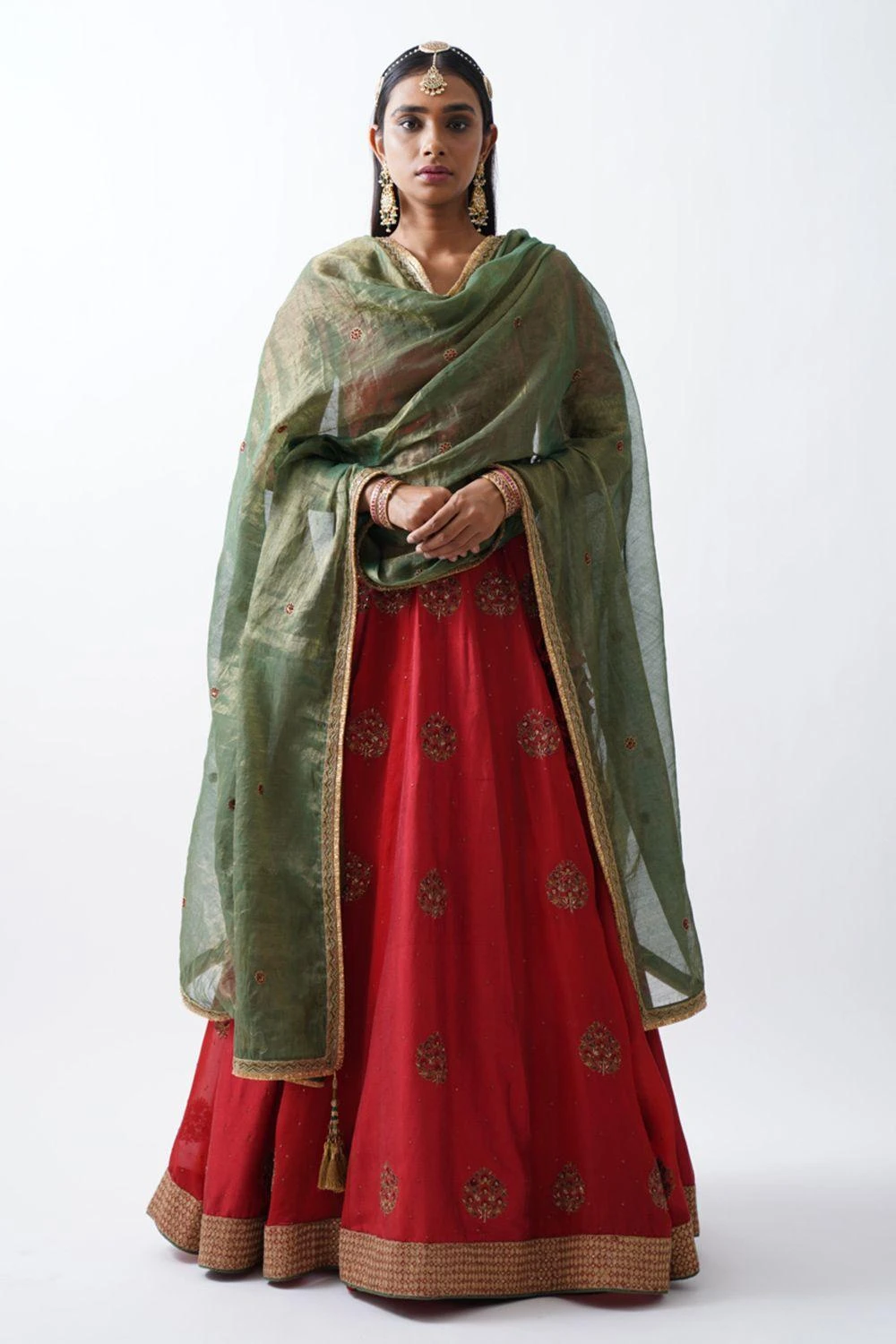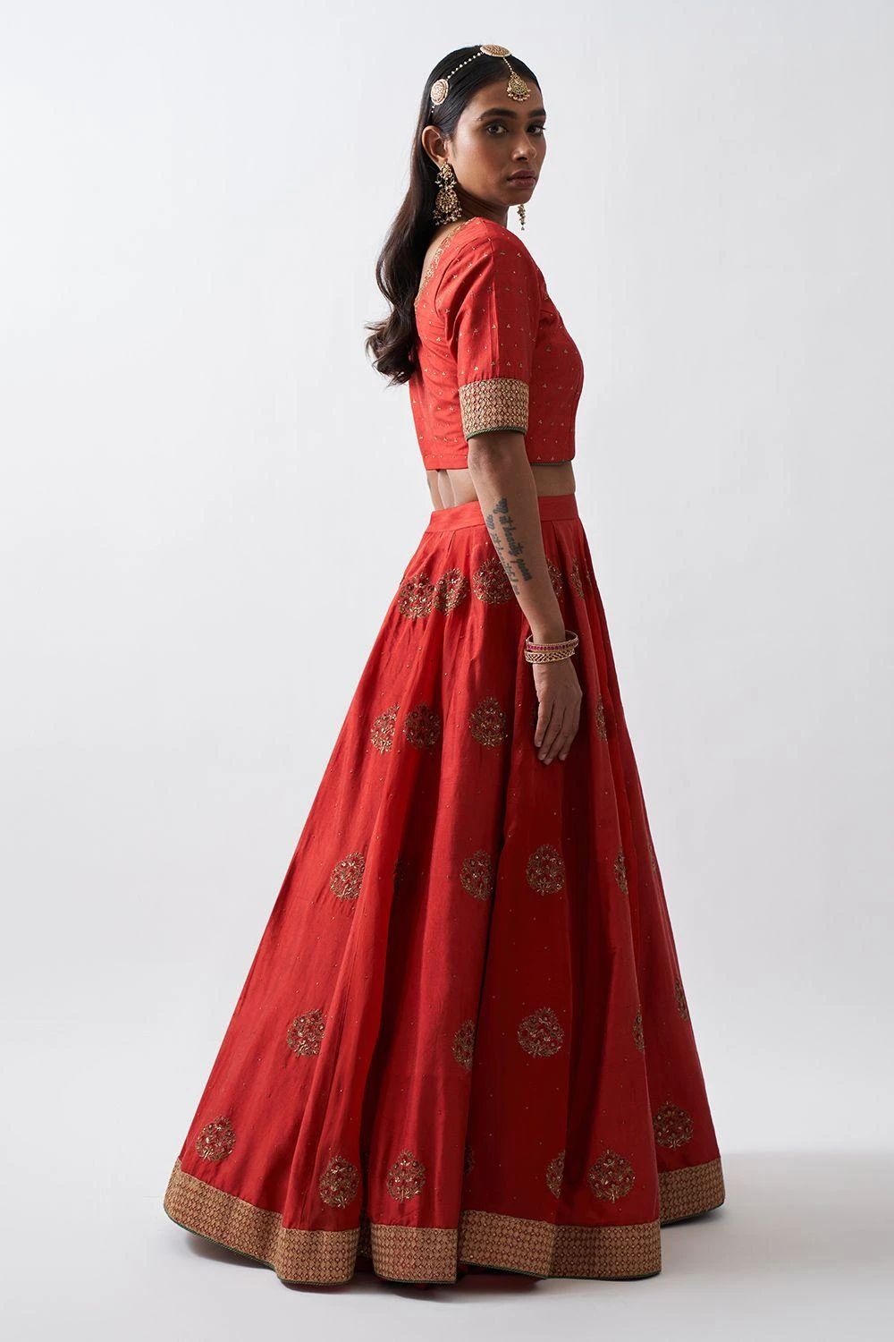 Add a regal aesthetic to your wardrobe with this red lehenga. It features panels of silk & organza paired with a blouse & chanderi dupatta with ari-zardozi embroidery. Style it with a pair of statement earrings & a potli bag to complete the look.