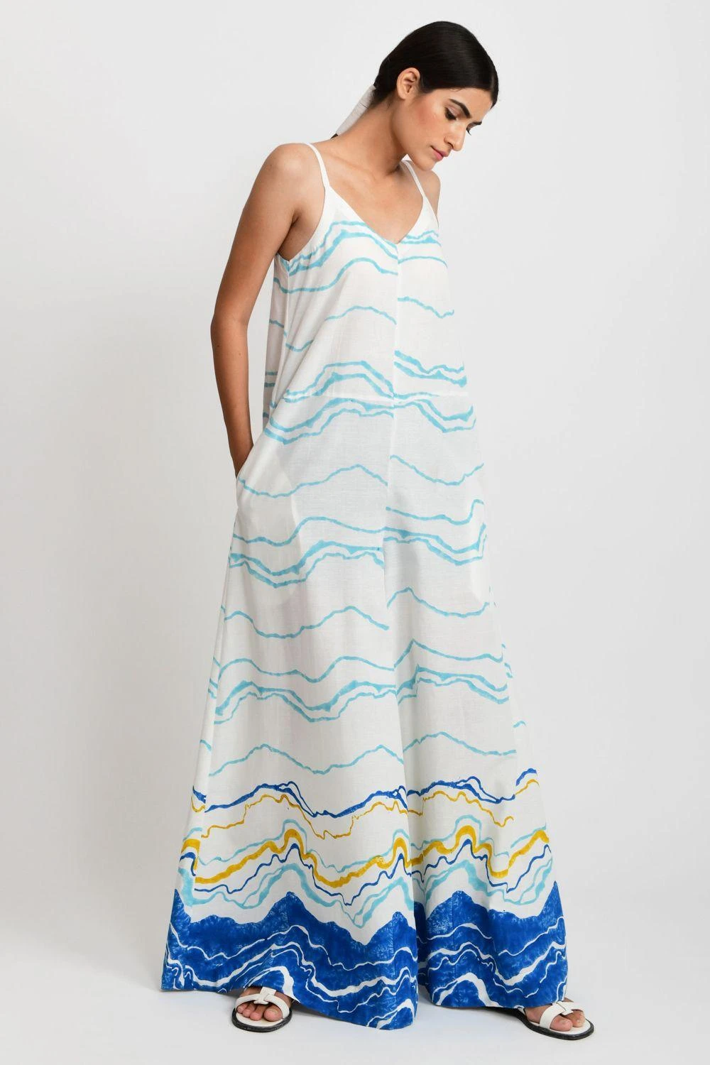 Cleanse your holiday closet with this breezy & light wave print jumpsuit. It is cut in indigenous cotton, blended with natural bamboo yarn and enhanced with handblock prints. Dress up your look with a boho clutch and layered necklace.