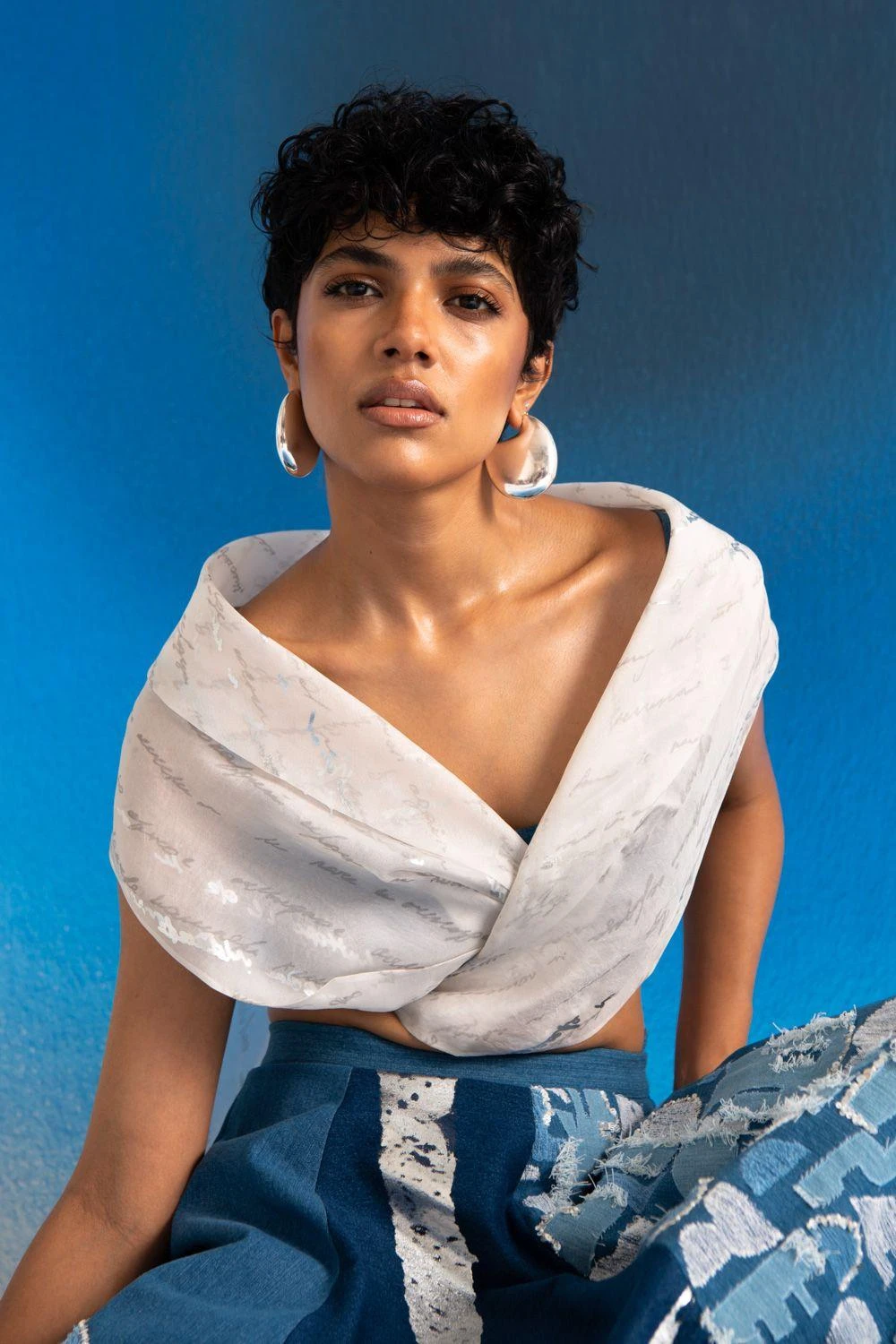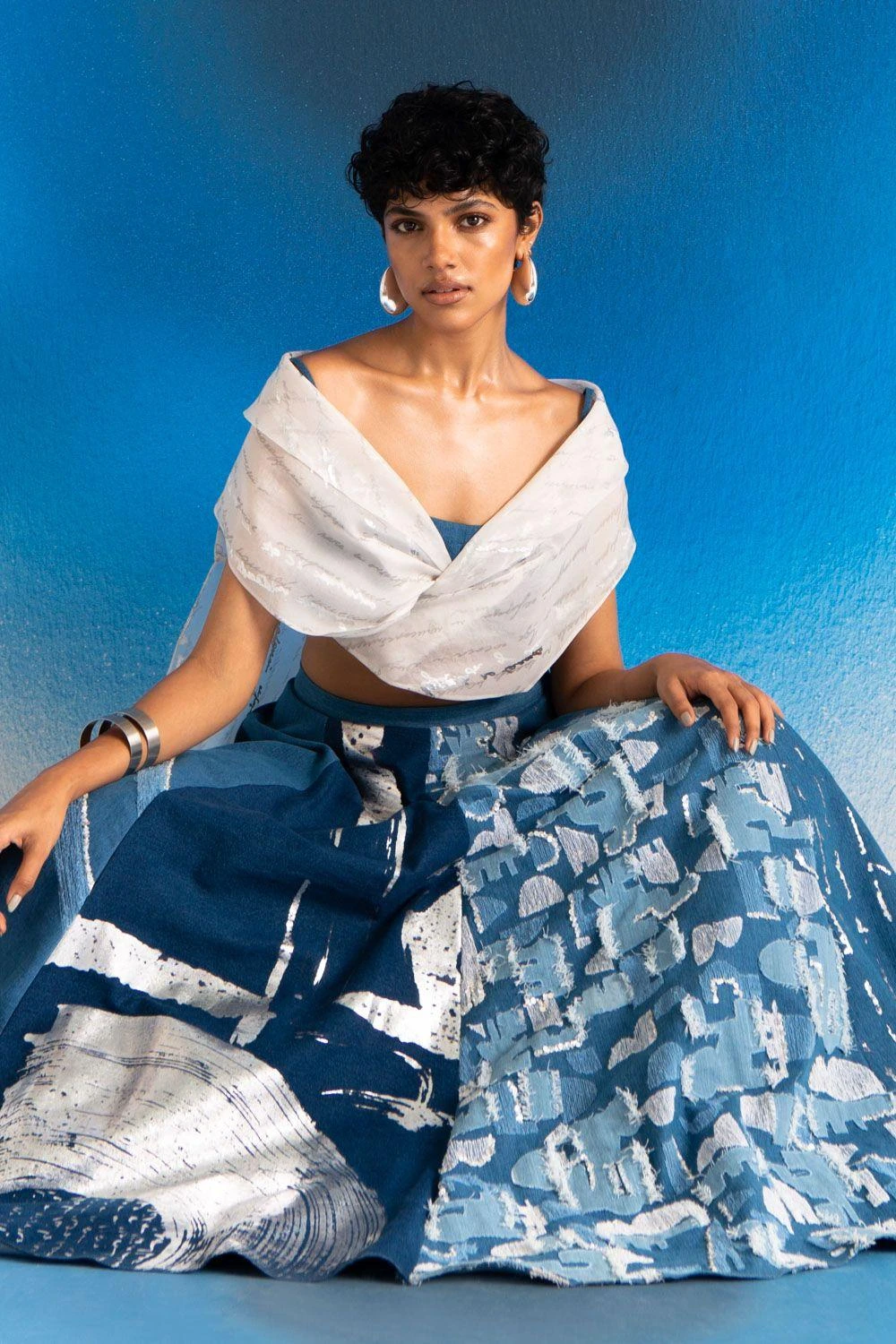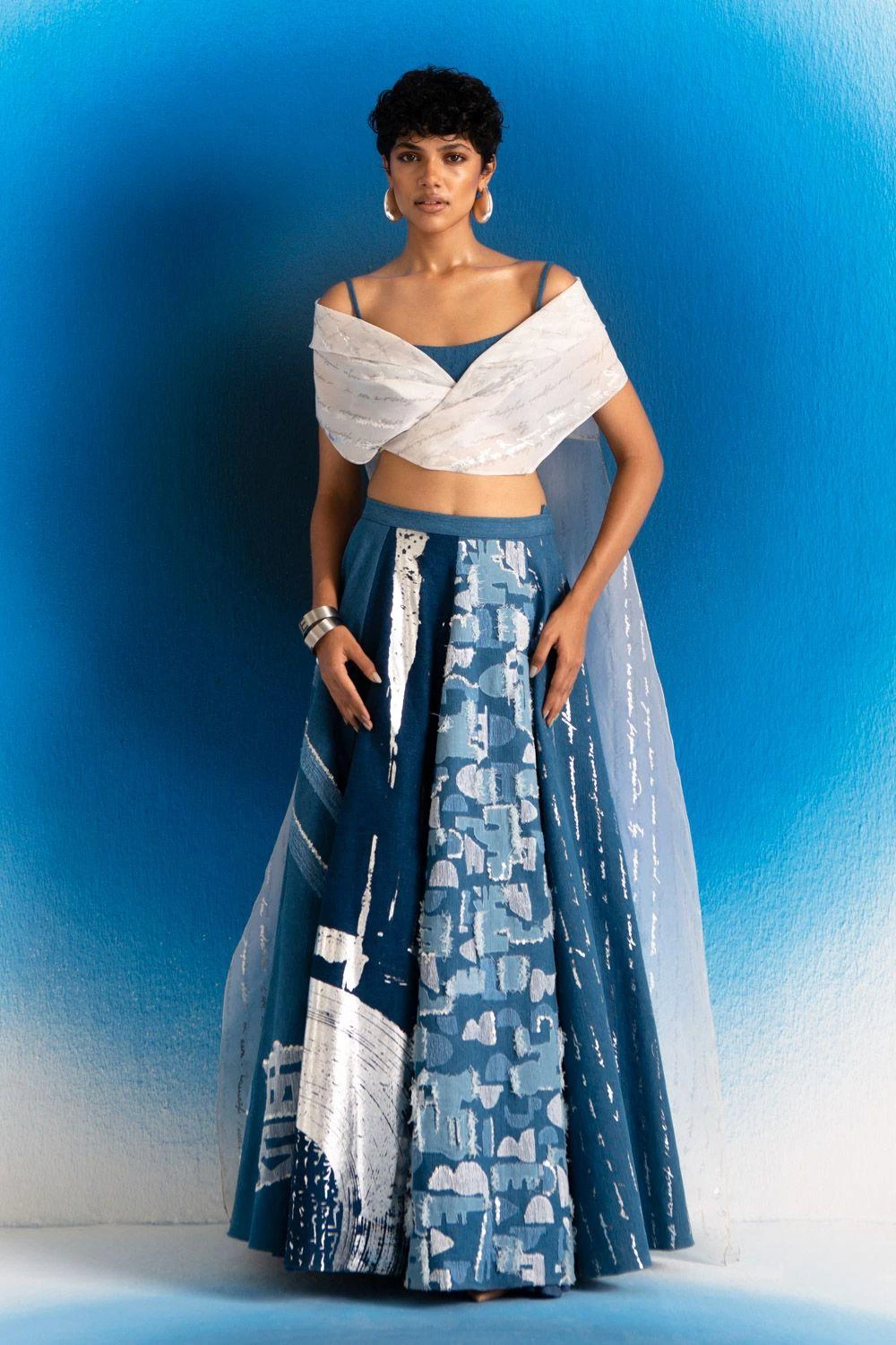 Look effortlessly stylish with this script overlay on a denim bustier, elegantly paired with a denim embroidered lehenga. A fusion of style and innovation for your chic statement.
