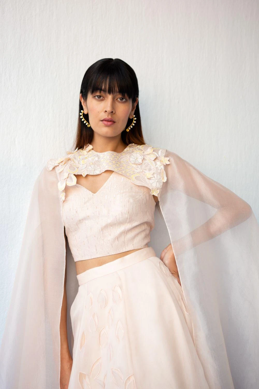Step into a world of enchantment with this mesmerizing 3D Lehenga ensemble. Adorned with intricate details, the Lehenga and top form a spellbinding duo, complemented by a breathtaking 3D cape.