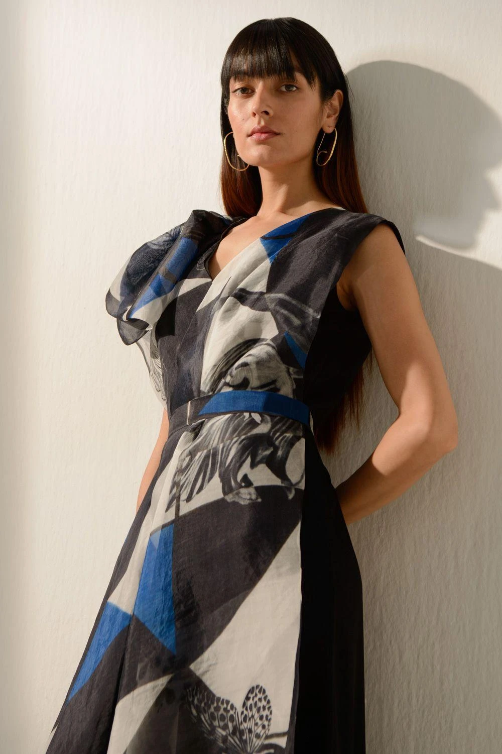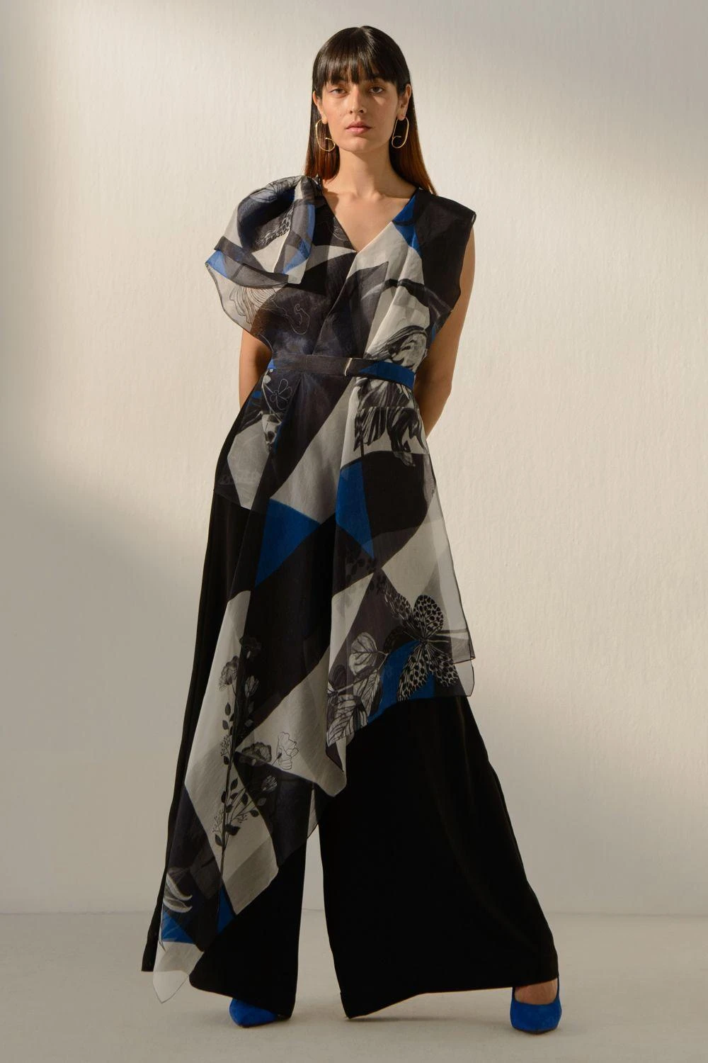 Experience the epitome of refined allure with this Nero blue printed draped jumpsuit, elegantly cinched with a complementary belt. Elevate your fashion statement with this jumpsuit, embodying timeless sophistication & undeniable charm.