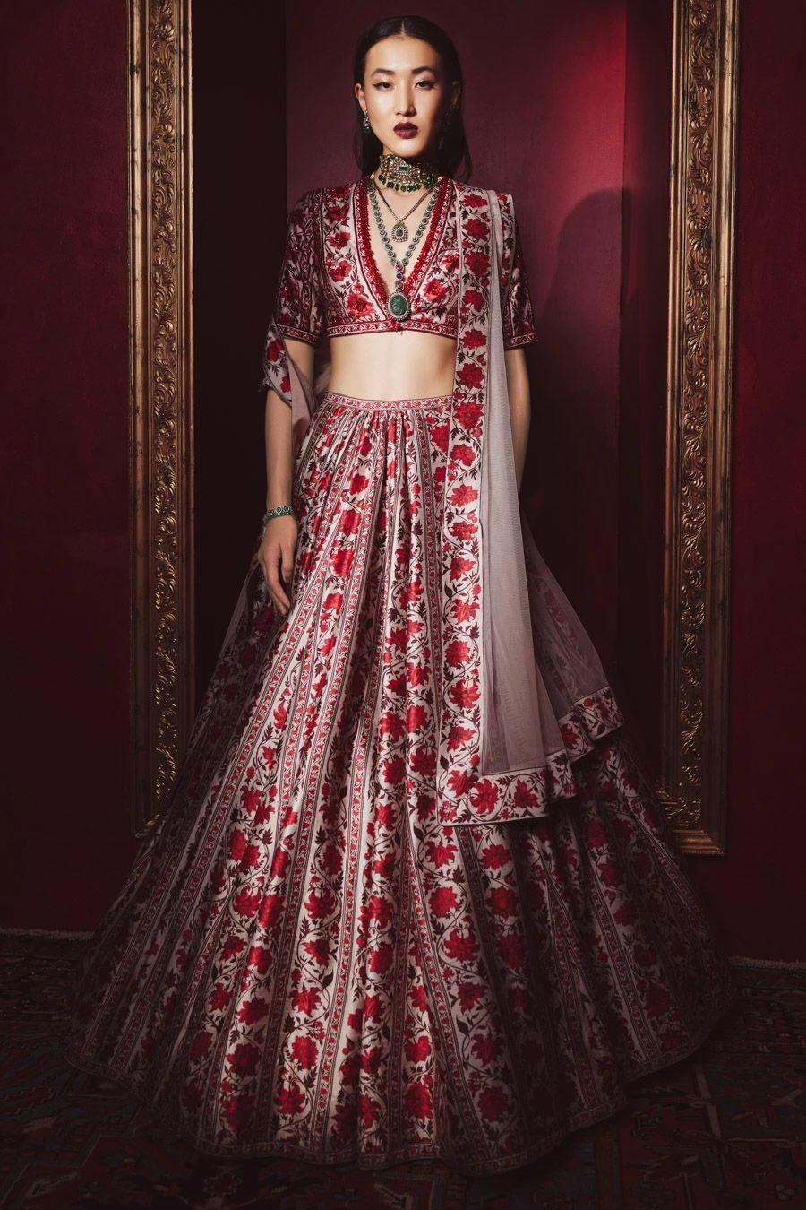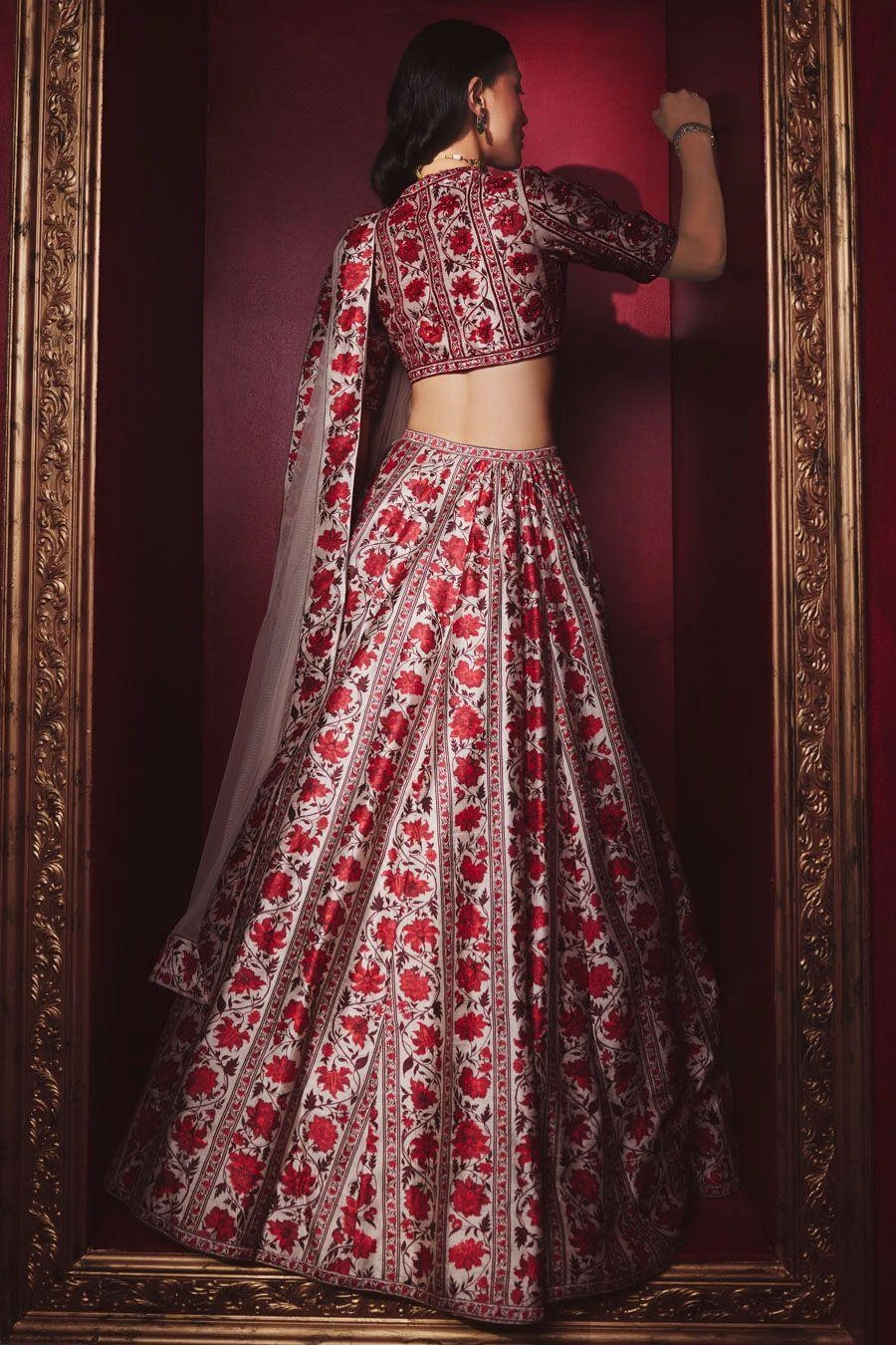 The eye-catching hues and intricate embroidery make this lehenga the perfect wedding outfit. This set comes with a printed & embroidered blouse & lehenga & net dupatta. Accessorize this set with a pair of statement earrings & a clutch.