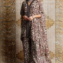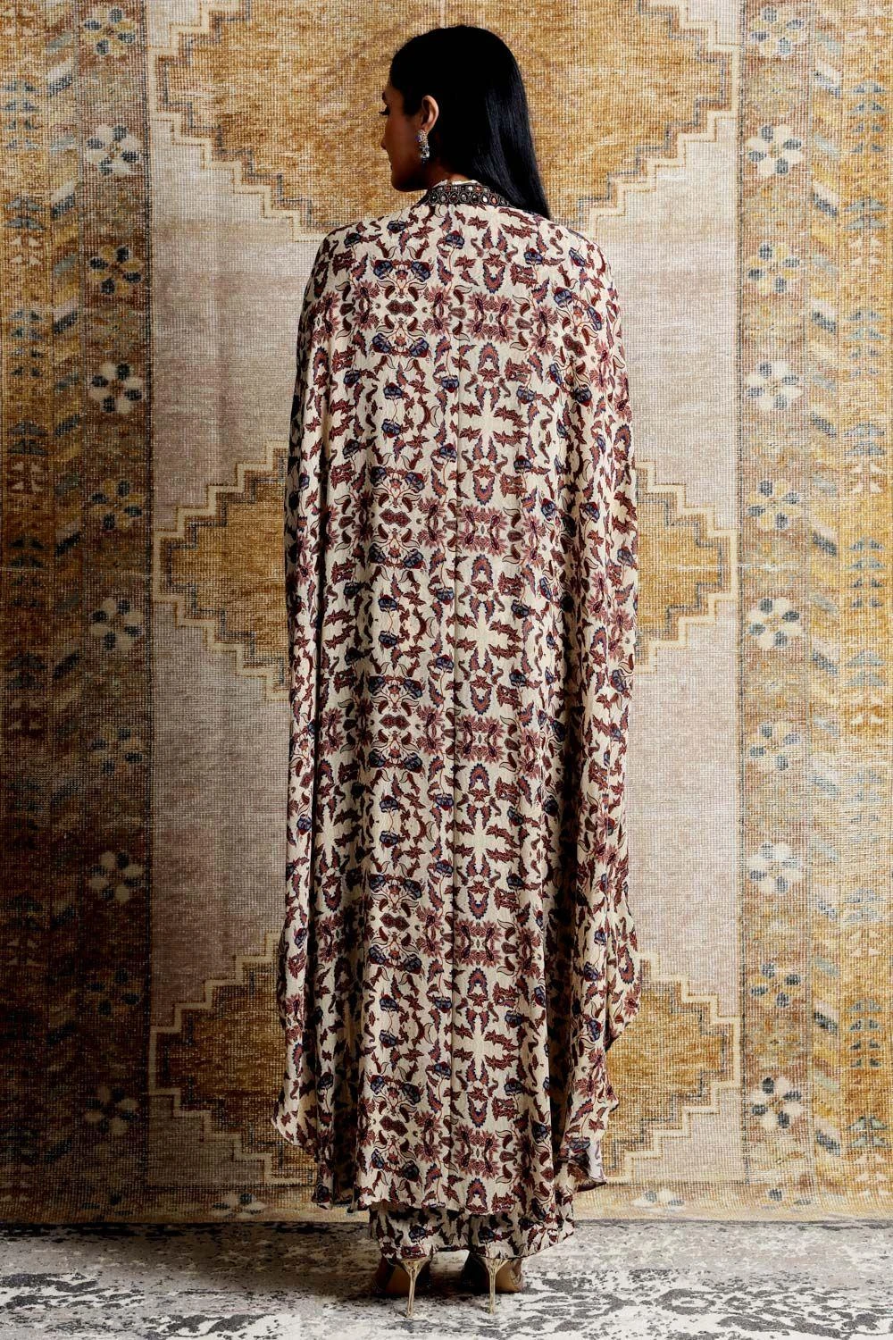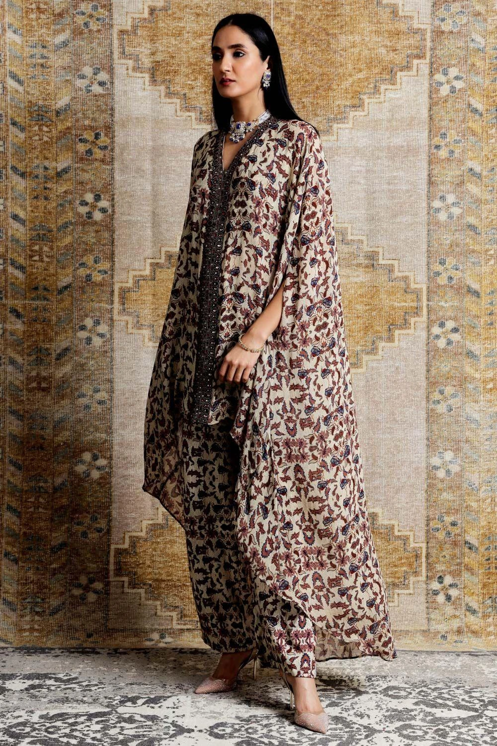 The upcoming balmy season calls for light & minimal clothing for your festive days. This printed set features a georgette base high-low kaftan, paired with matching pants and a bustier. You can elevate your look with a pair of statement earrings.