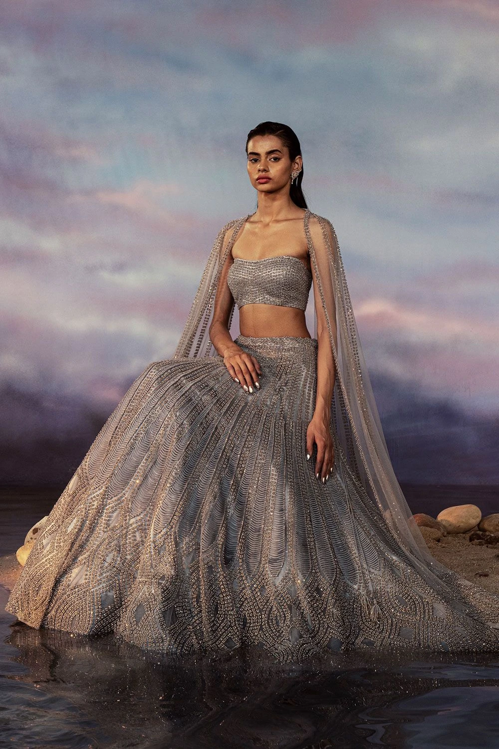 Embark on a journey of opulence with this Space Grey Lehenga Set. The gold embroidered and stitched cords add a touch of regal allure to this ensemble. Paired with a matching blouse and stitched dupatta, it exudes elegance and sophistication.