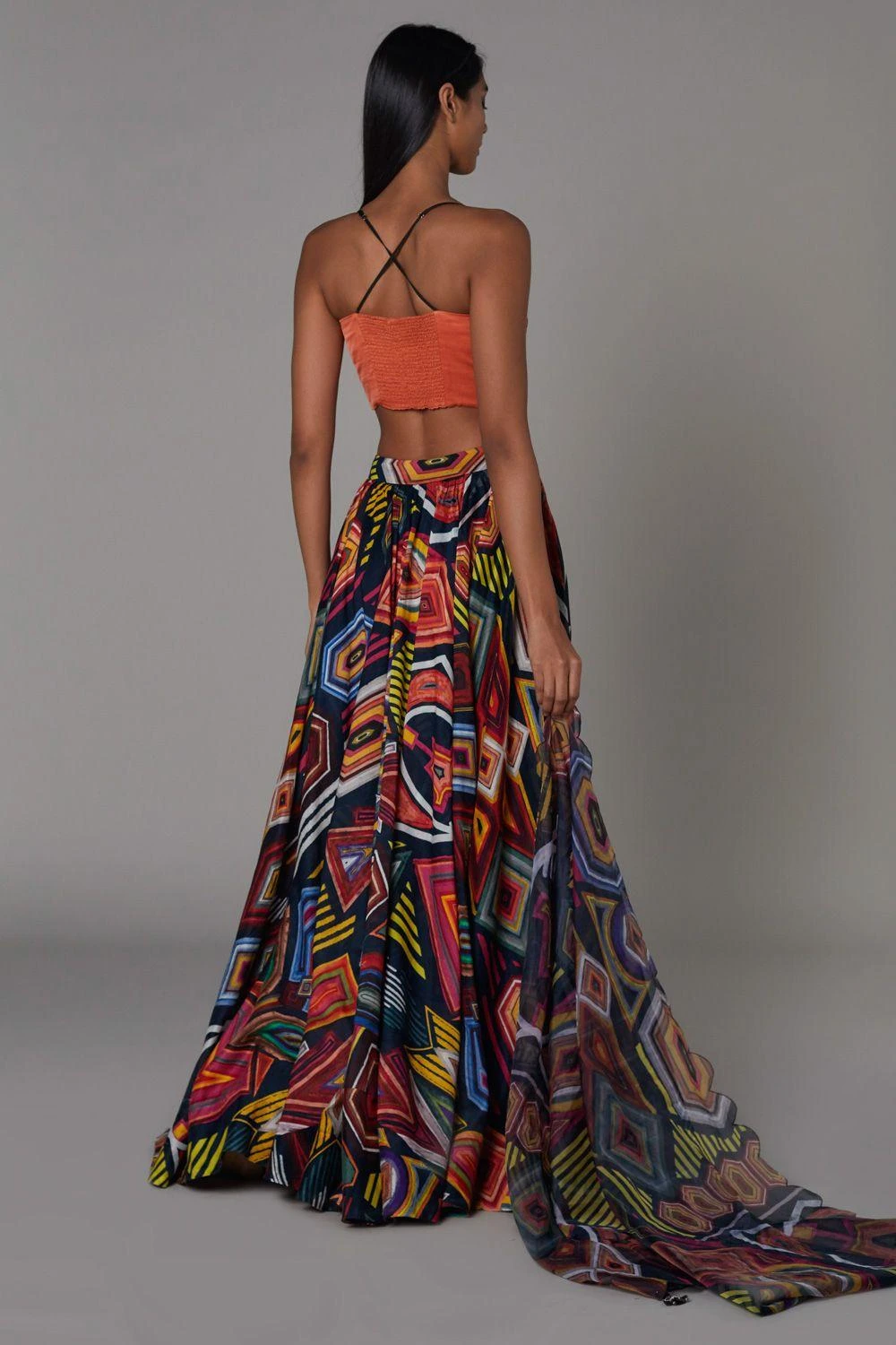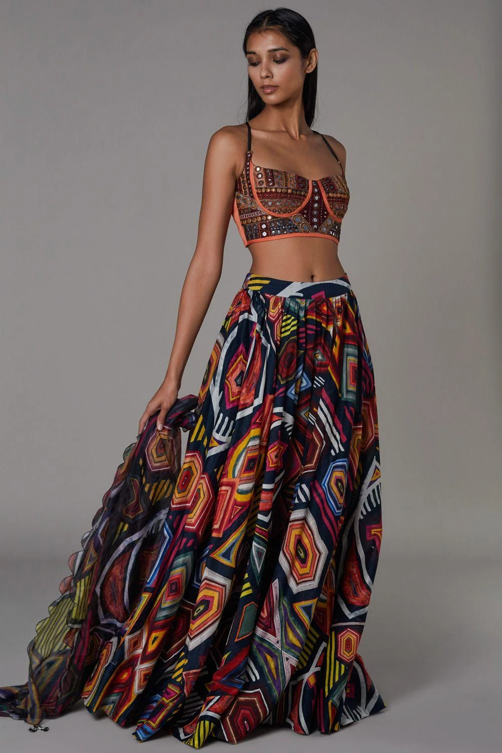 Don it solo, or layer it, this statement rust bustier can instantly add edge to any outfit. It is cut luscious satin fabric and detailed with intricate mirror & thread work details.