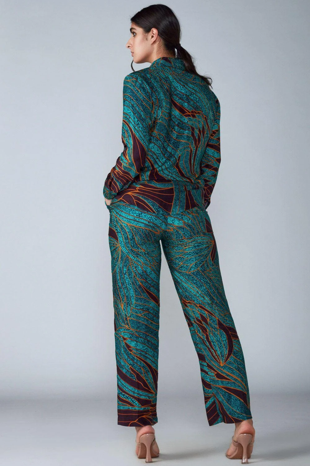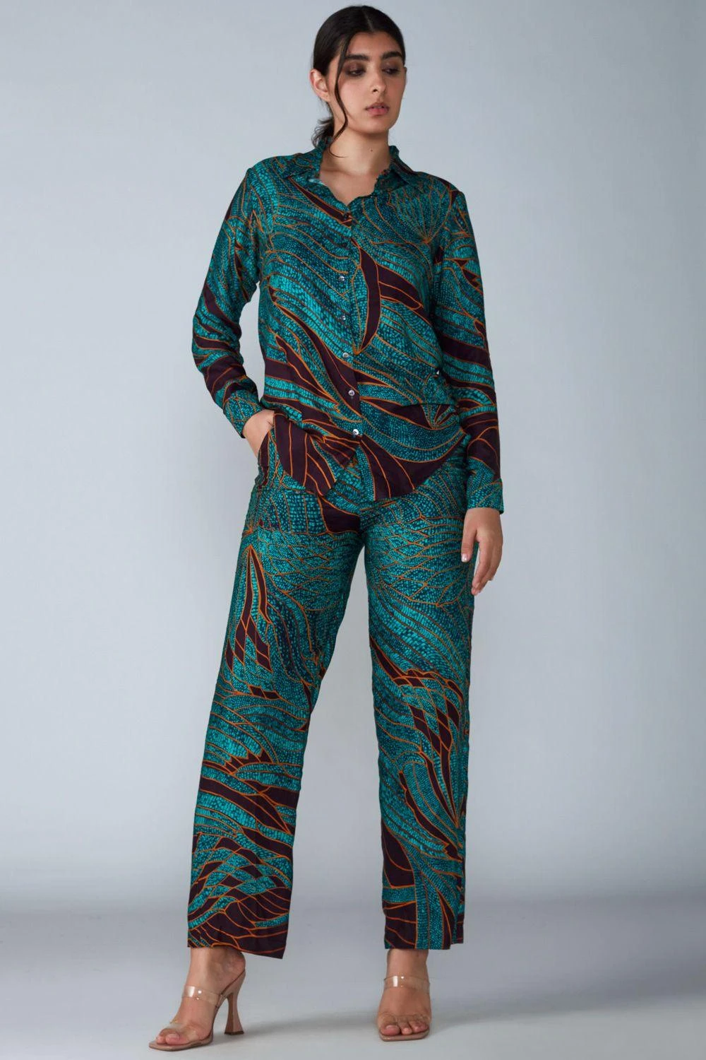 Crafted in satin, this turquoise collared shirt features an abstract wing print all over. Style this shirt with the Turquoise abstract printed palazzo from the collection to complete the set.