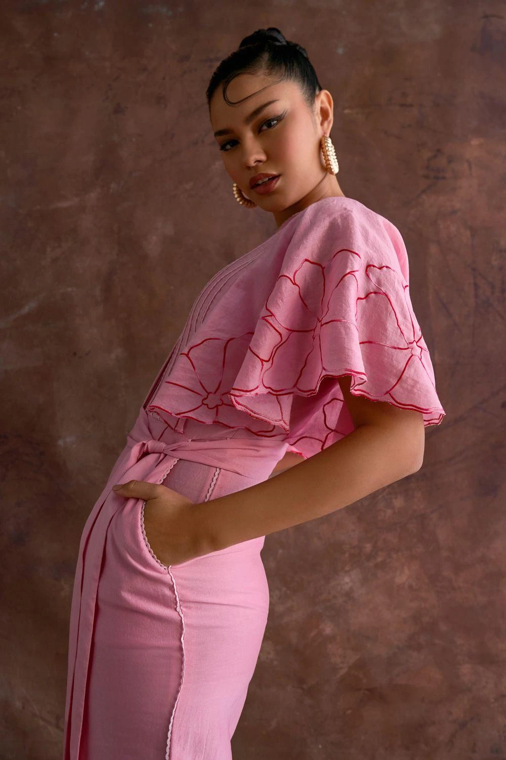 Embark on a floral fantasyùa jumpsuit adorned with embroidered flowers, a lace-detailed center panel, wide-leg embroidered bottoms & lace accents. Complete with a chic belt, this ensemble whispers an enchanting narrative of elegance & charm.