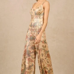 In the tapestry of fashion, a jumpsuit unfolds with a V-neck adorned by embroidered ruffles, short sleeves & a back zipper. The elasticated waist, coupled with a belt, converges into wide-leg bottomsùeach stitch narrating a tale of refined elegance.