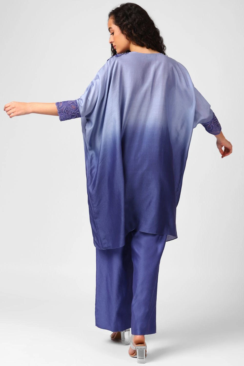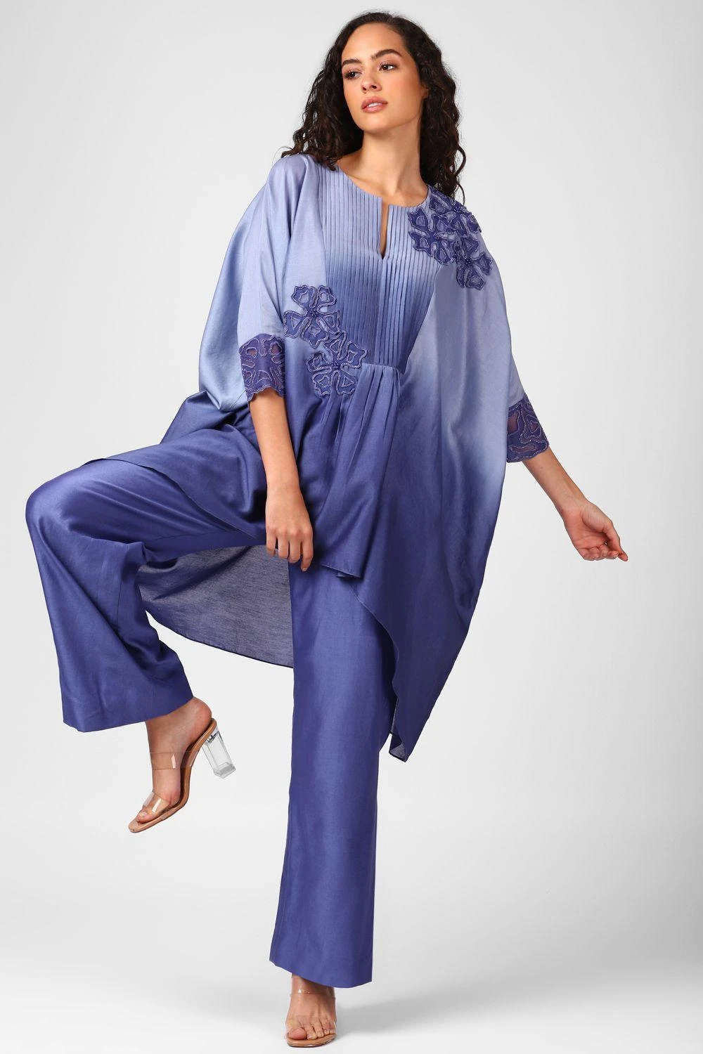 From lounging at home to catching flights, you can always count on this co-ord set. Cut in chanderi silk, this set features an ombre pin tucked kaftan with embroidered applique flowers, embroidered cuffs, paired with straight pants.