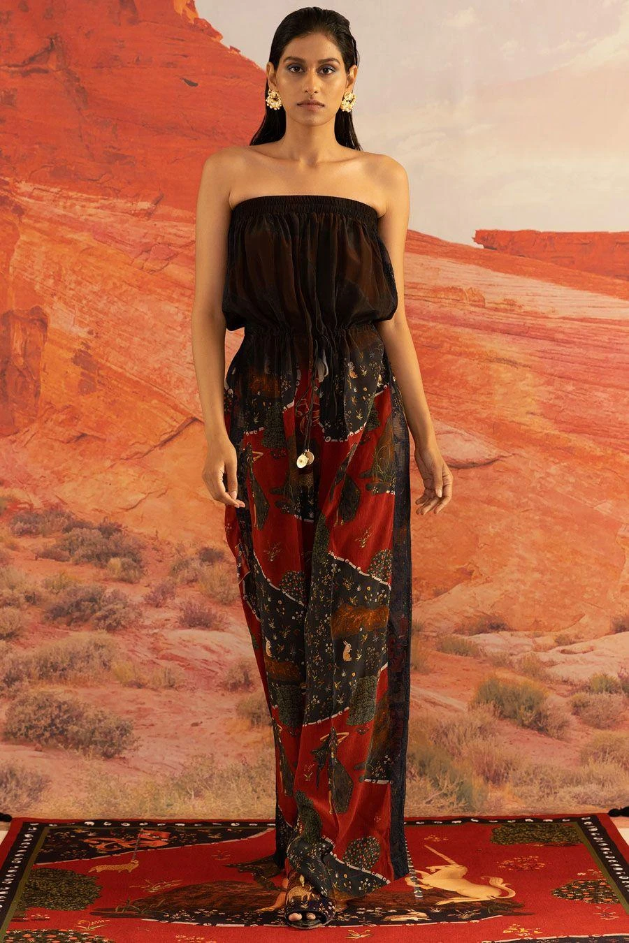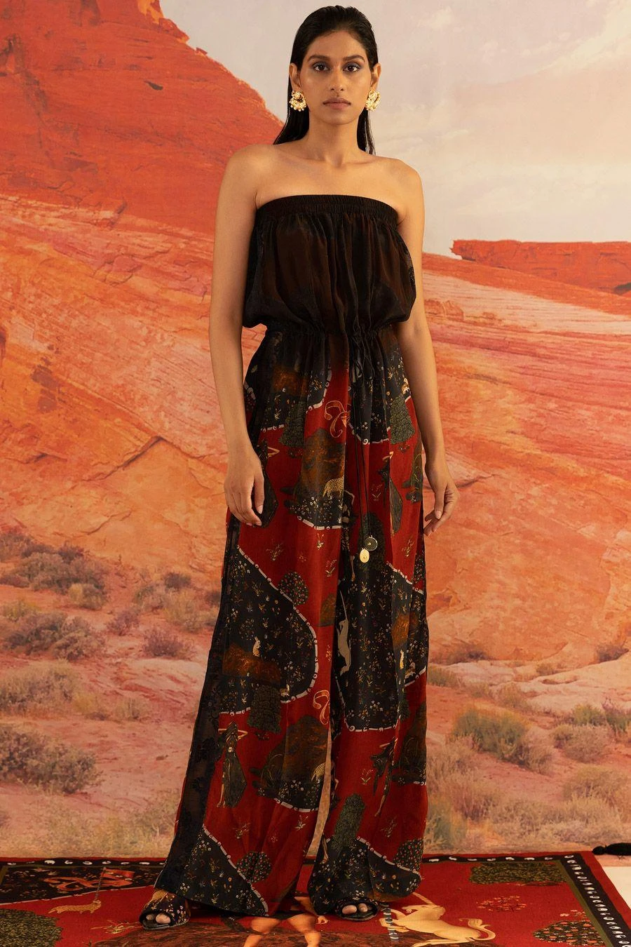 Dip-dyed in obsidian black, the off-shoulder jumpsuit in the wildings print makes a unique style statement with its relaxed fall, cinched with a tie-up knot. The delicate lace detail is a subtle detail that surely makes a glamorous style statement.