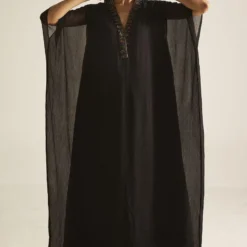 The perfect amalgamation of style and comfort, this kaftan is perfect for pre wedding festivities. Crafted in chiffon, this kaftan features a hand embroidered neckline. Add a pair of statement earrings to complete the look.