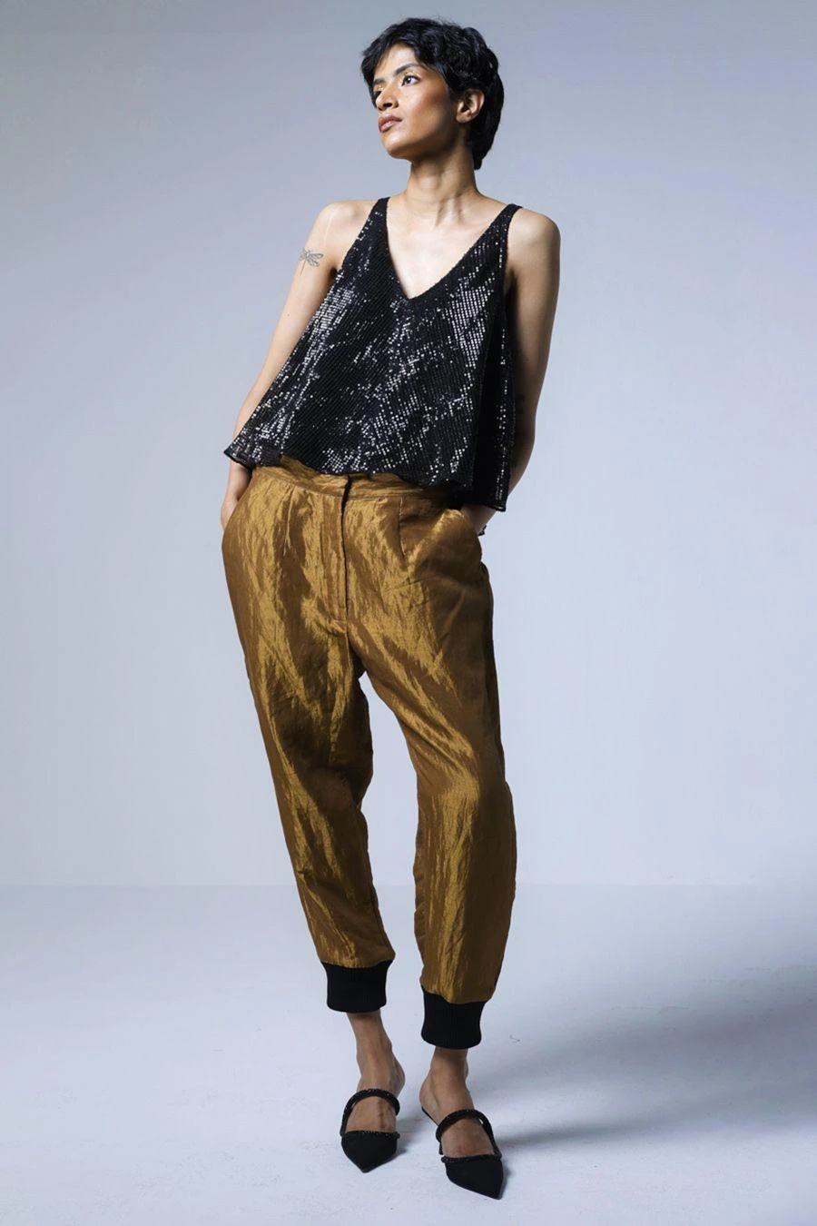 The perfect amalgamation of style and comfort, this sequinned, V-neck sleeveless top works across occasions. Pair it with gold handloom tissue pants from the collection to complete the set.