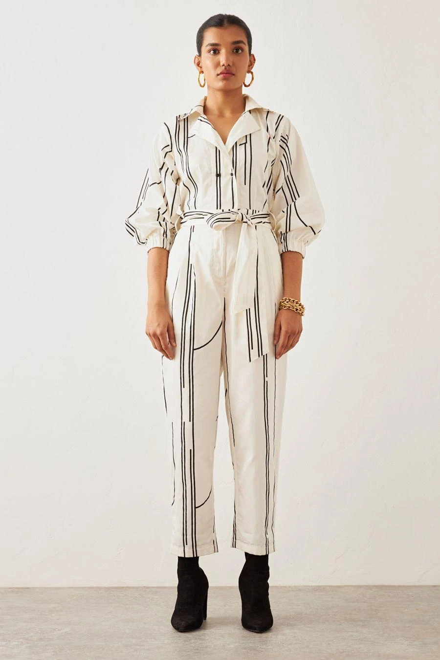 From your work desk to the brunch table & from lounging at home to catching flights, you can always count on this jumpsuit. Crafted in cotton, this tracks print jumpsuit features an elasticated sleeve, placket detail and tie up waist.